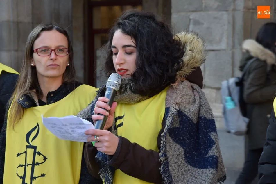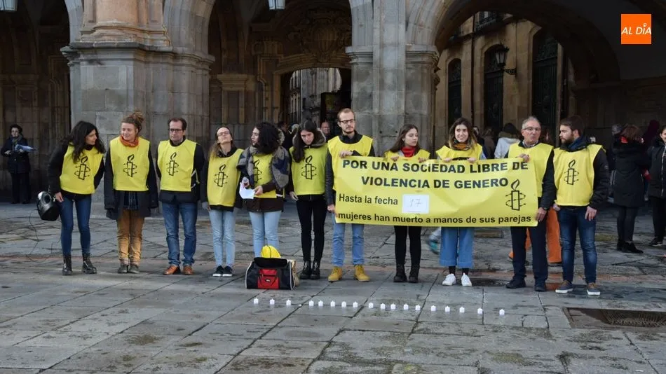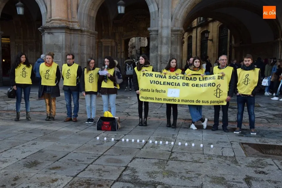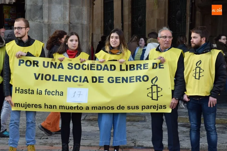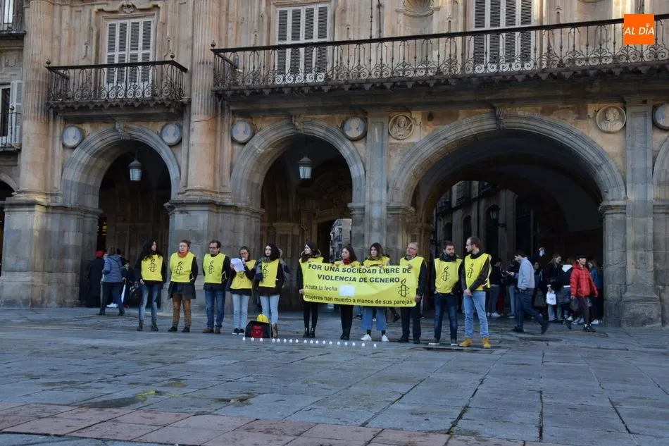 El grupo de Amnistía Internacional de Salamanca ha vuelto a realizar esta tarde una performance en la Plaza Mayor para unirse a la reclamación de medidas que frenen la violencia de género.