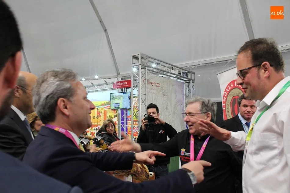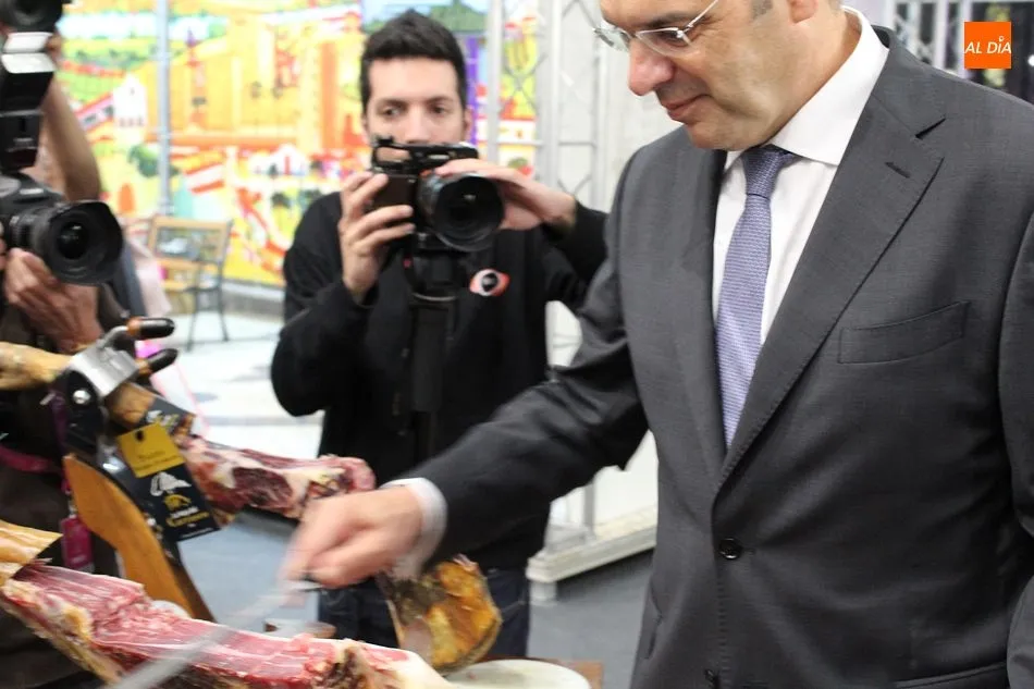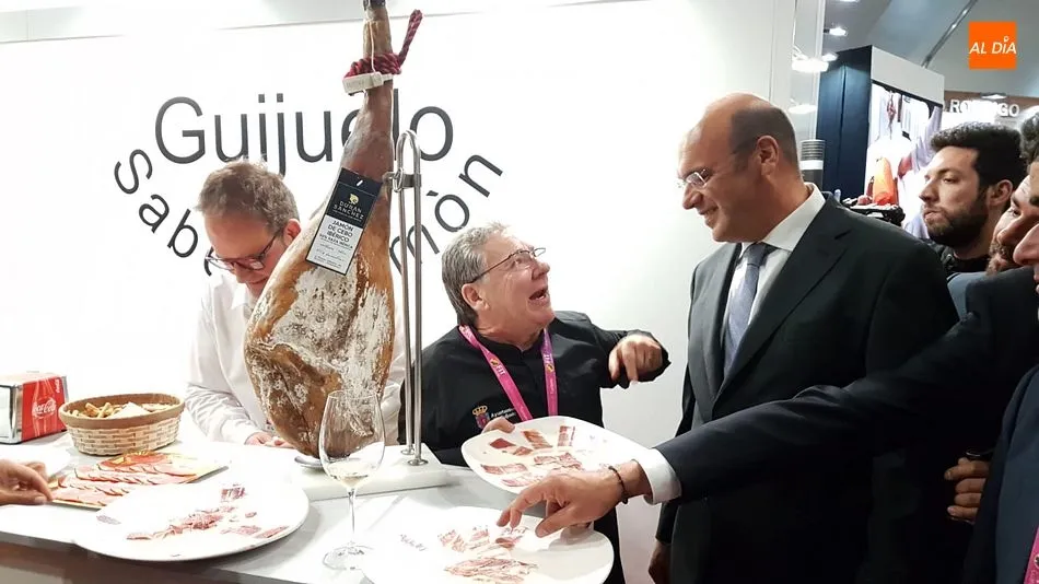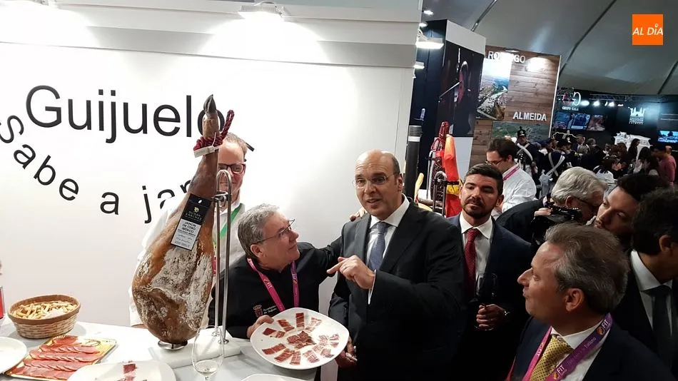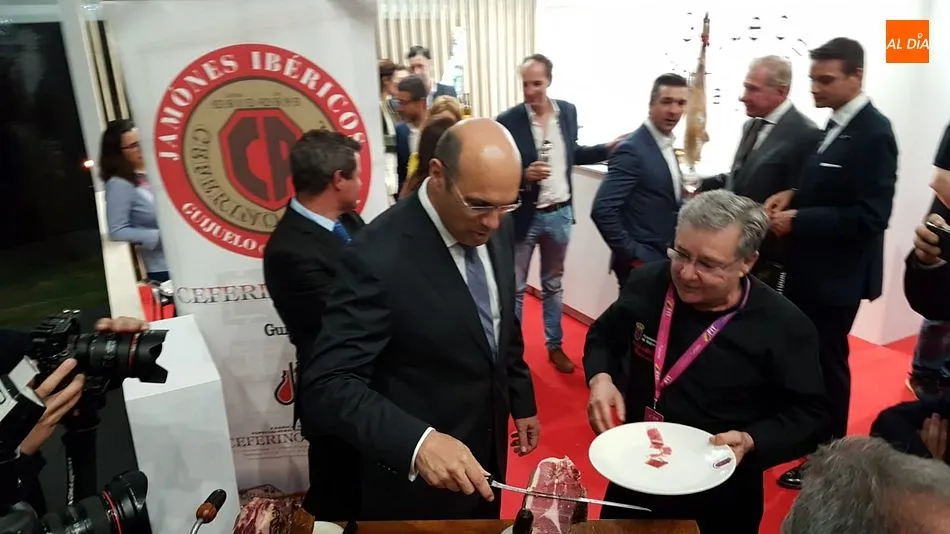 El ministro portugués de Economía, Pedro Siza Vieira, presente en Guarda para la inauguración oficial de la FIT, degustó el Jamón de Guijuelo y fue invitado a cortarlo. En la conversación que mantuvo con los representantes de Guijuelo participaron también el alcalde de Guarda, Carlos Monteiro, el director de la FIT, Carlos Condesso, el alcalde de Pinhel, Rui Ventura o el secretario de estado para la Valorización del Interior, João Paulo Catarino.