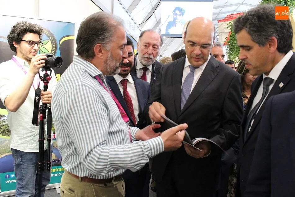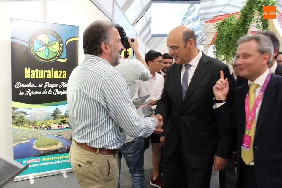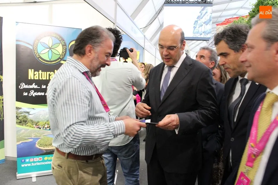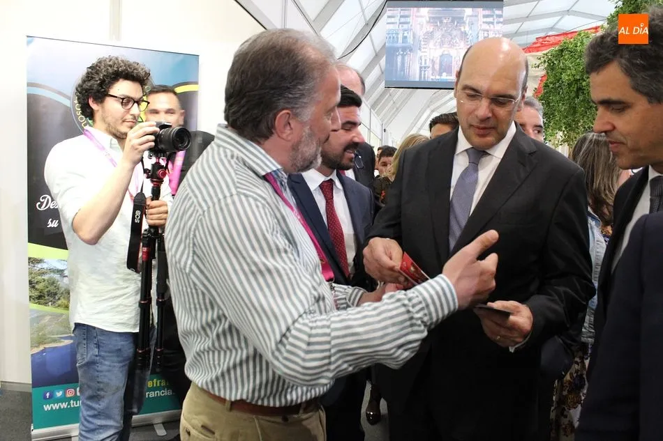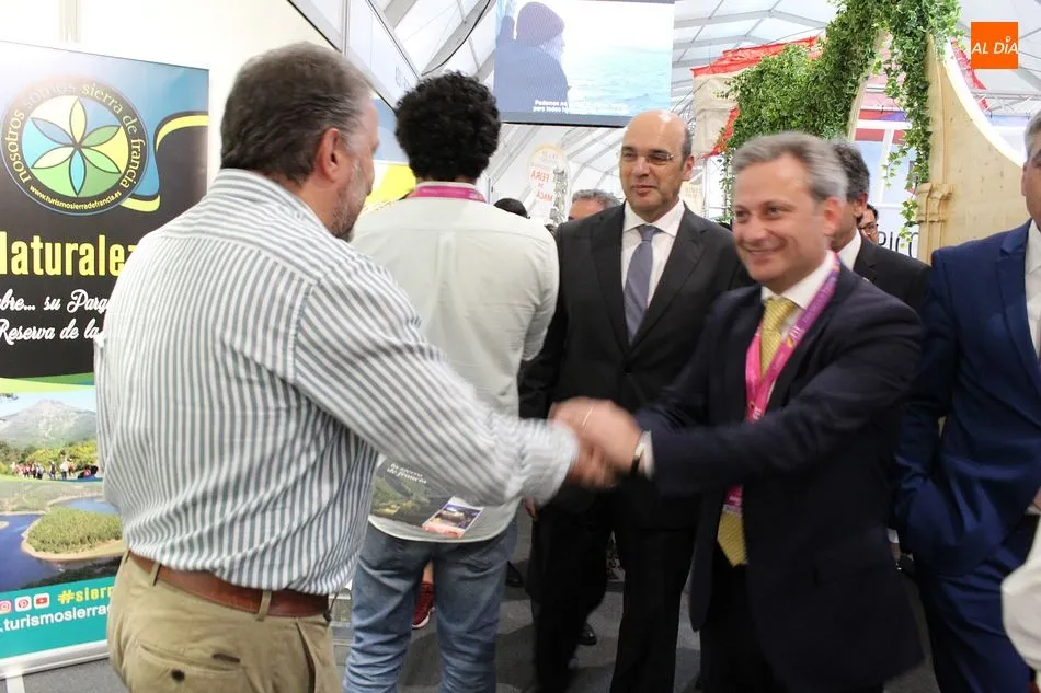 Durante la jornada inaugural, el ministro de Economía de Portugal, Pedro Siza Vieira, se acercó al stand de la Sierra y compartió con Sebastián Requejo unas palabras, ?esa zona es muy bonita?, manifestó el ministro. Le acompañaban el director de la FIT, Carlos Condesso, el presidente de la cámara municipal de Guarda, Carlos Monteiro, y el secretario de estado para la Valorización del Interior, João Paulo Catarino.