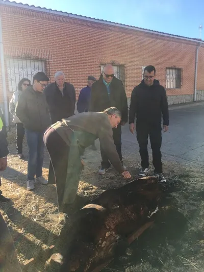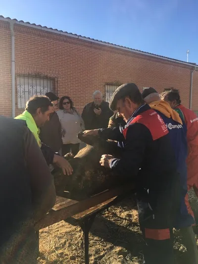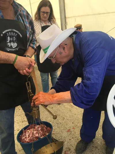 Numerosos vecinos y visitantes se daban cita en la Plaza de la Constitución desde las nueve de la mañana para dar comienzo al rito del cerdo con el Chamuscado y posterior destazado y despiece, acompañado por aguardiente y pastas típicas.