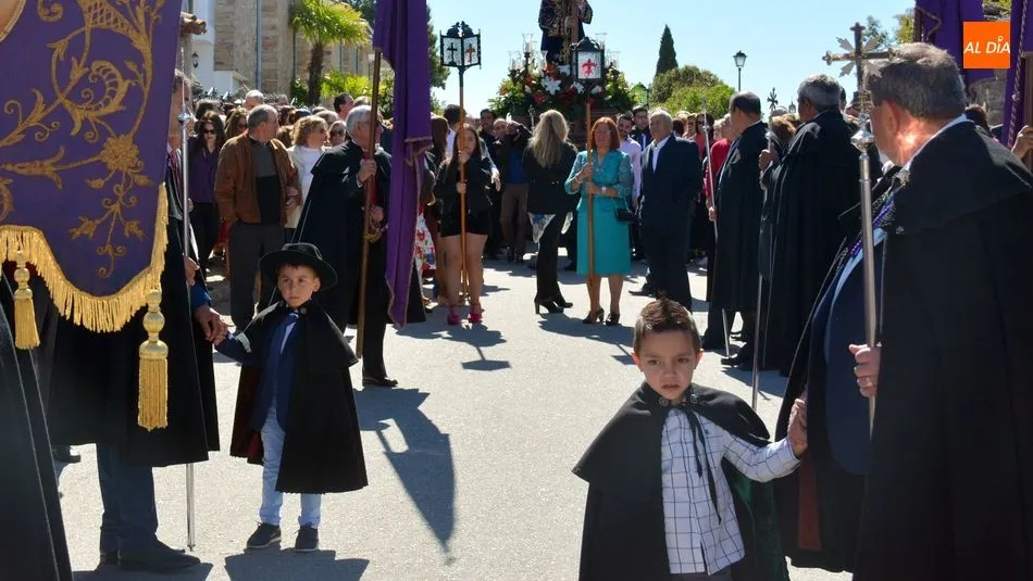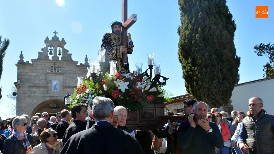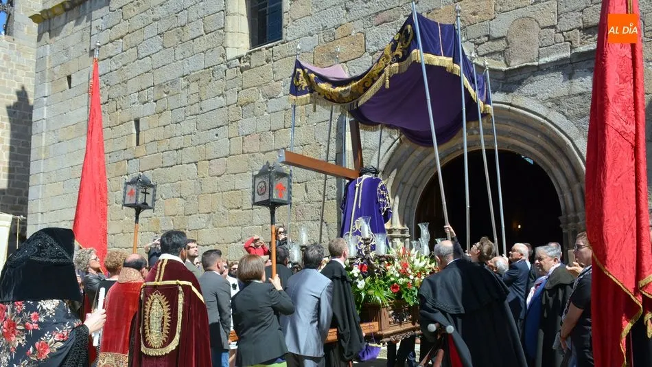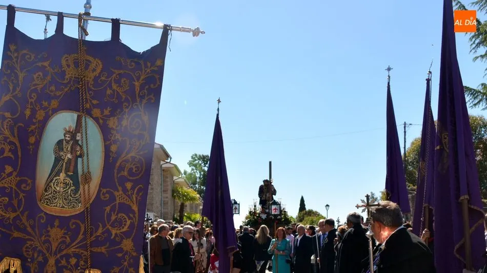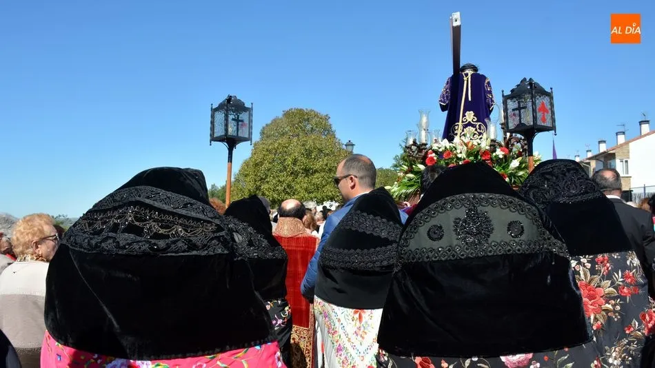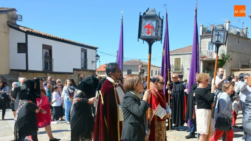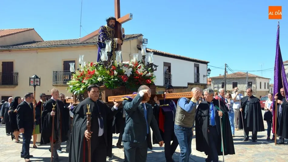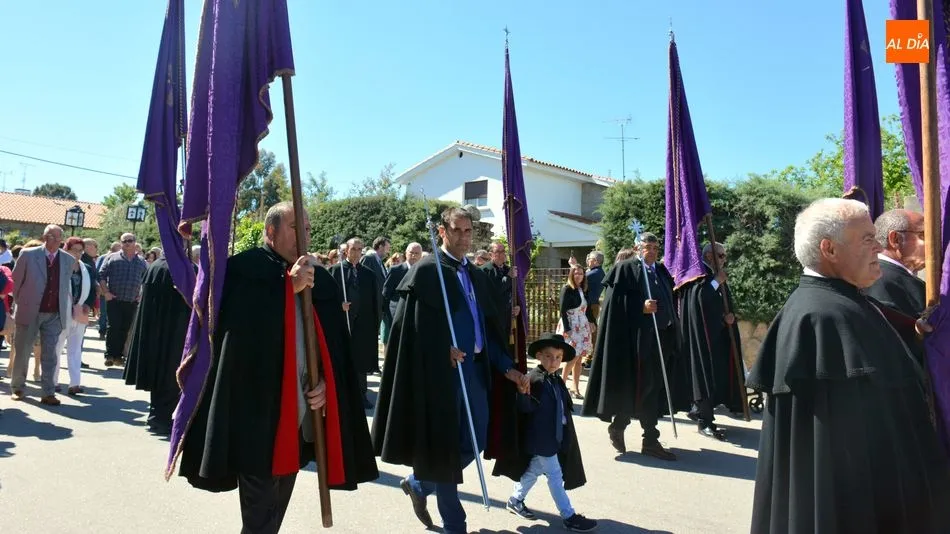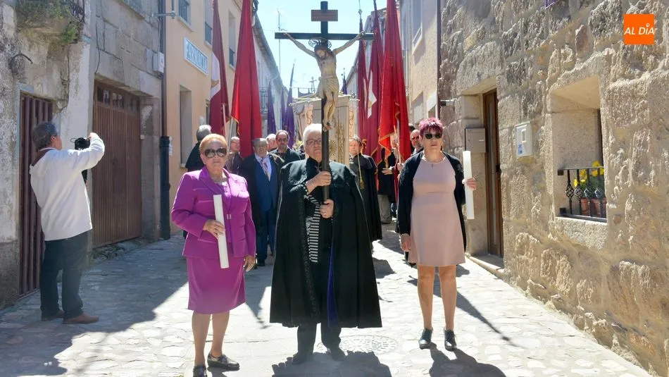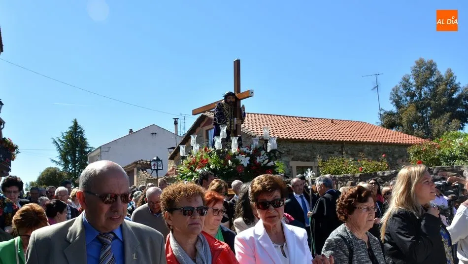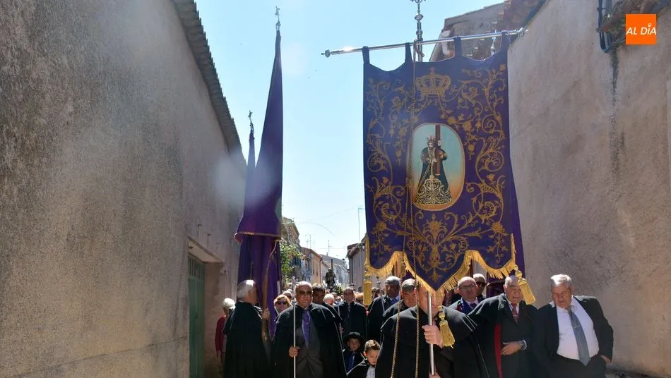 La presencia de devotos se incrementó en los actos celebrados esta mañana. Los peregrinos y todos los vecinos de San Felices acompañaron a los miembros de la Cofradía de Jesús Nazareno en los actos religioso del día grande de la Santa Cruz. A las 11,30 horas, salía de su ermita la imagen del Nazareno, llevada en procesión hasta la iglesia parroquial. La agrupación musical Virgen de la Vega de Salamanca abría la comitiva integrada por la Cofradía de Jesús Nazareno, formada, según el orden jerárquico, por seis alcaldes, seis oficiales y los mayordomos, luciendo la capa charra y cordón y pañuelo al cuello, abría la comitiva portando los grandes estandartes de color morado. Iban acompañados también por los miembros de la Cofradía del Santísimo y sus estandartes rojos.