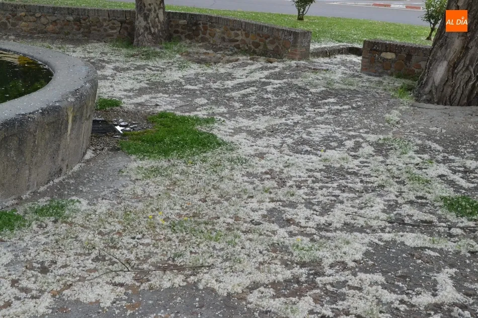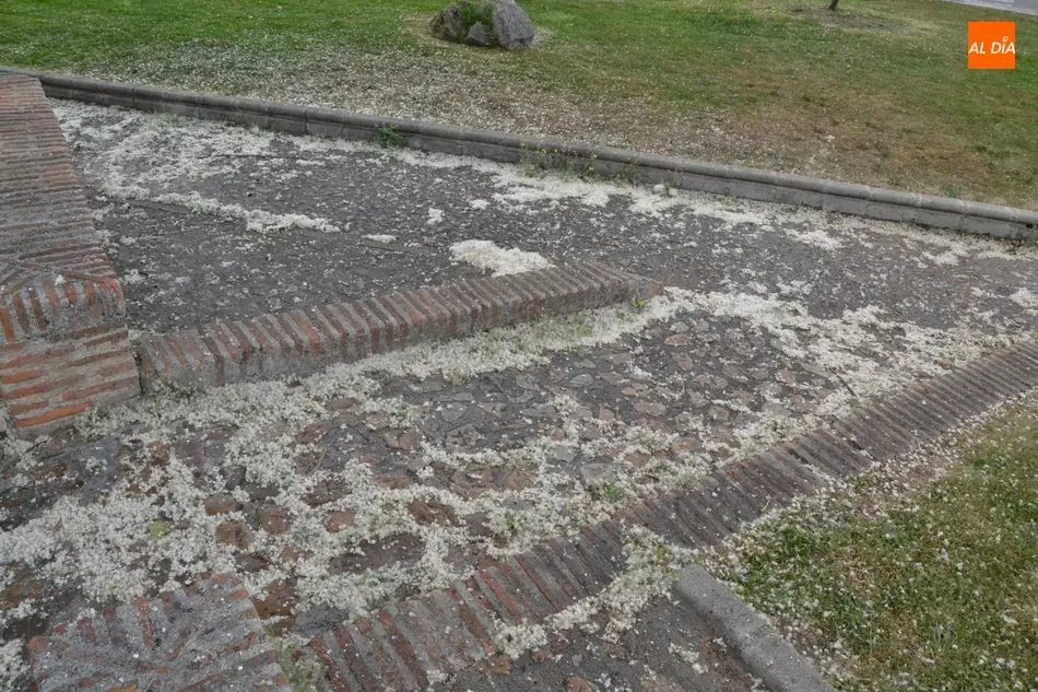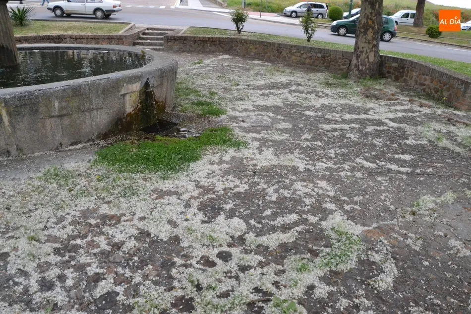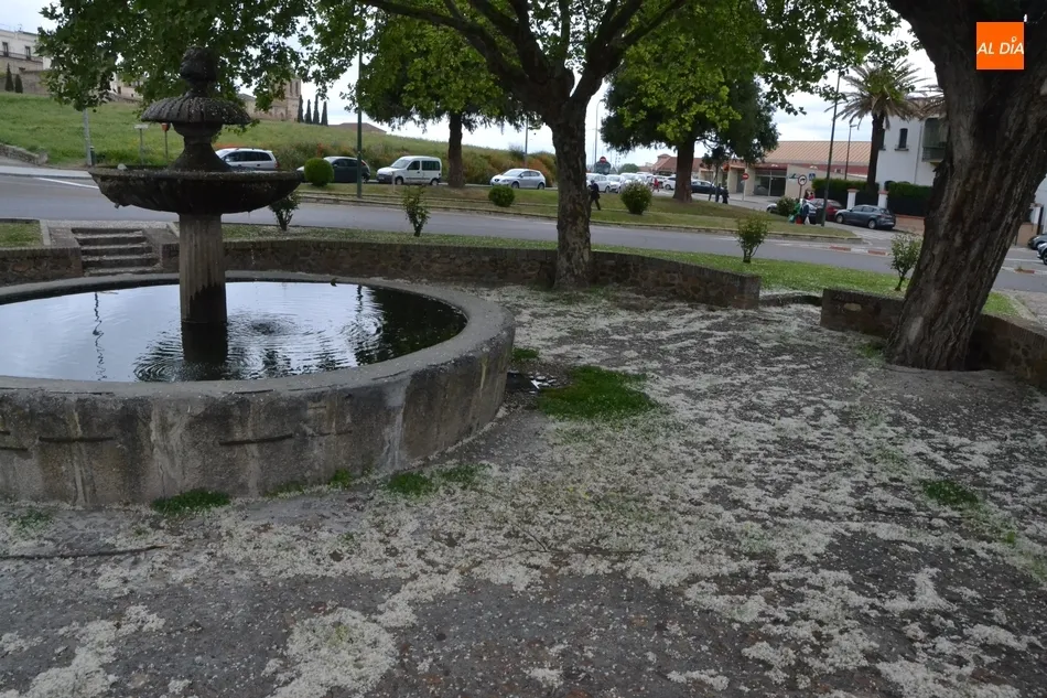 Aunque la lluvia las puede hacer desaparecer en las próximas horas, de momento hay unas cuantas zonas de Ciudad Rodrigo con profusión de pelusas, como por ejemplo la Glorieta del Árbol Gordo, donde el entorno de la fuente propiamente dicho estaba plagado de las mismas a última hora de la mañana del martes.