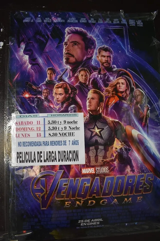 Vengadores Endgame cierra la saga de 22 películas de los conocidos superhéroes de Marvel, nacidos en las viñetas y ahora exitosos personajes de la cultura popular. Los Vengadores supervivientes a la anterior entrega, Infinity War, deberán encontrar la manera de derrotar al villano Thanos. La película tiene una duración cercana a las tres horas, por lo que se han modificado ligeramente los horarios de proyección. Mañana sábado se podrá ver a las 17:30 y a las 21:00 horas. Mismas horas a las que se podrá ver el domingo, 17:30 y 21:00 horas. El lunes, último día de cine de la temporada, se podrá ver a la hora habitual, las 20:30.
