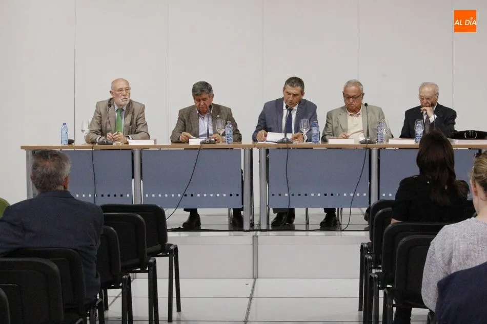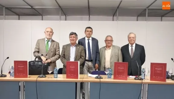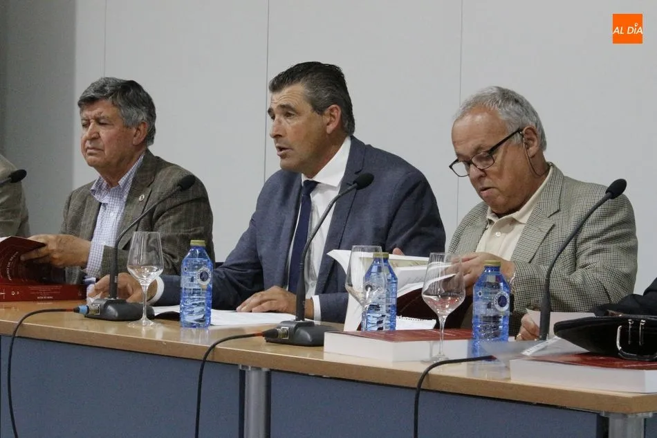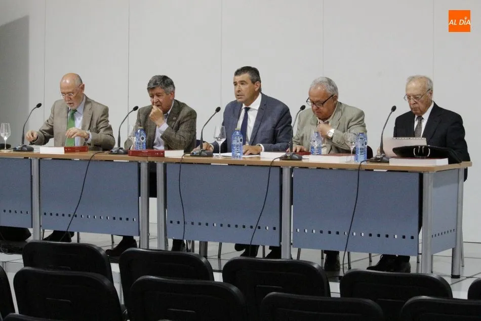 El diputado de cultura, Julián Barrera, el director del Instituto castellano y Leonés de la Lengua, Gonzalo Santonja, el alcalde de Béjar, Alejo Riñones y los profesores José Manuel Ruiz, de la Universidad de Valladolid, y Ángel Vaca, de la Universidad de Salamanca, han presentado este martes, en la Plaza Mayor, el libro ?Fuero de Béjar?, editado por la Diputación de Salamanca.