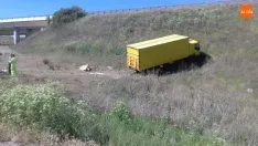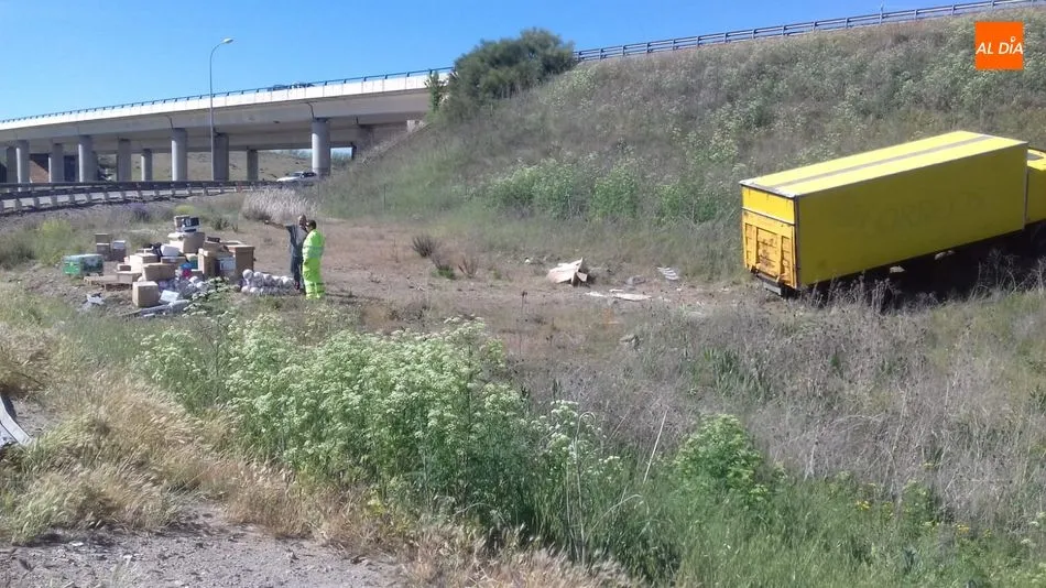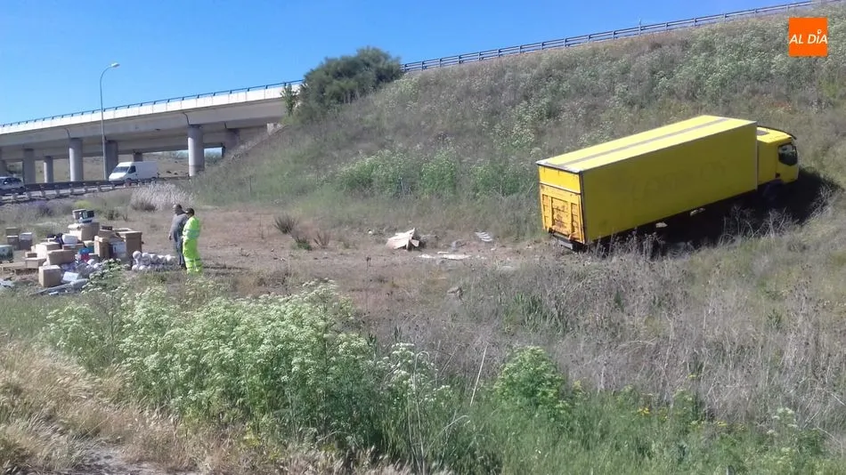 Un camión de Correos se salió de la vía en la CL-512 esta madrugada después de que el conductor perdiera el control del vehículo y quedara atravesado en la entrada a la rotonda de salida de la ciudad hacia Aldeatejada y Vecinos.