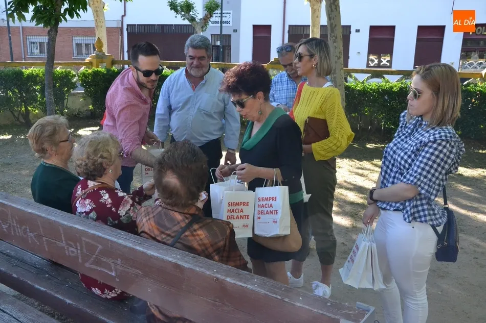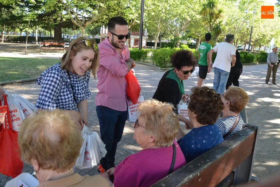 Concretamente, los socialistas hicieron entrega de varias decenas de sus bolsitas electorales, que llevan el lema Siempre hacia delante, y que contienen varios materiales, incluido un folleto con la imagen de todos los integrantes de la candidatura socialista al Ayuntamiento mirobrigense. Además de esas bolsitas, el PSOE estuvo repartiendo caramelos, piruletas, globos o mecheros.