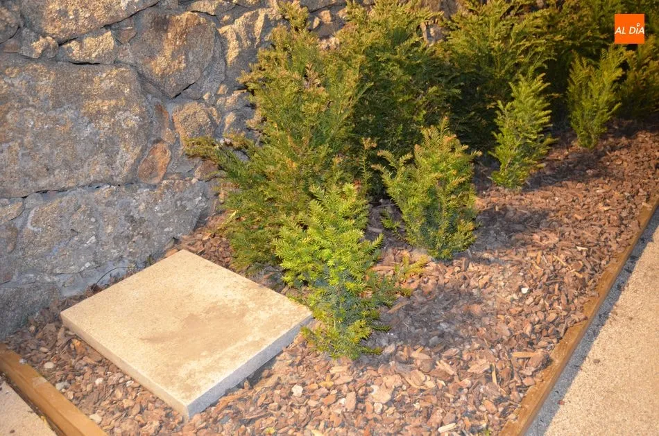 Otro detalle del jardín que llama la atención es una tapa de arqueta con un rebaje en la parte superior, preguntado José Carlos Sanz por el extraño elemento nos contesta que se trata del aprovechamiento de una simple tapa de arqueta para que sirva de bebedero a los pájaros cuando retenga el agua de lluvia y para que además sea un lugar de ofrenda para ellos, en el que los visitantes puedan depositar migas o semillas.