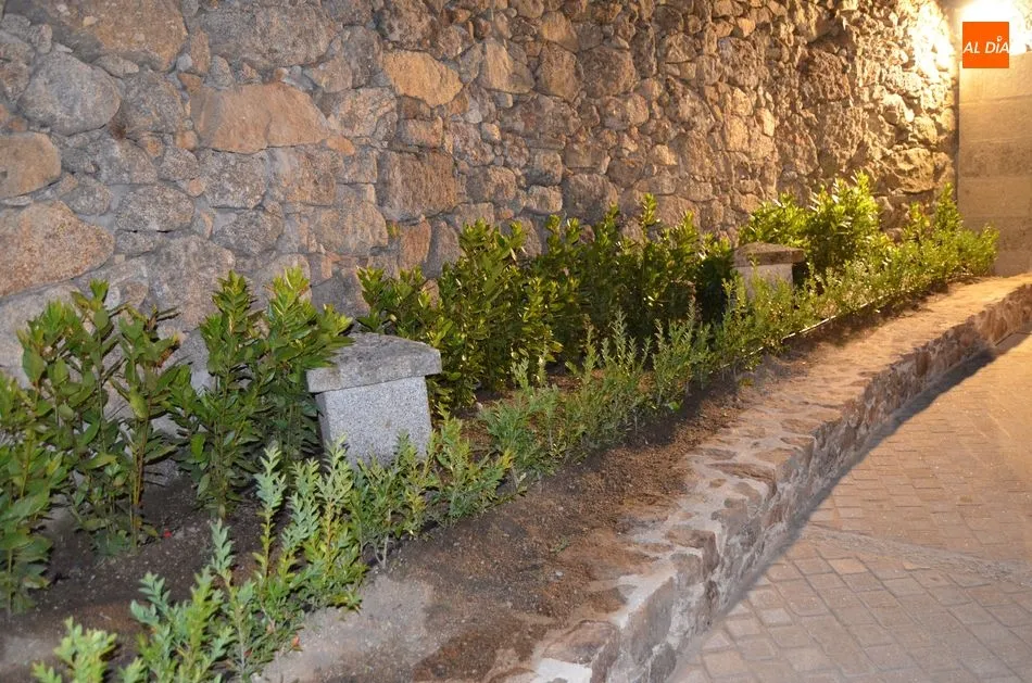 Otra licencia de autor es la recreación de una rocalla medieval del jardín ageste que sorprende en la zona alta del nuevo espacio ajardinado, el arquitecto ha explicado que en el interior hay una gran piedra de roca madre en vuelo a mitad de altura e inestable, una roca viva que no era cuestión de dinamitar y que estaba sujetada antes por el talud basurero que actuaba a modo de contención. Ante esta eventualidad, para suplir la función portante se ha aplicado un sistema de cerrojos que funciona con los muros de mampostería como contrafuertes, porque hay un empuje considerable del terreno con numerosas entradas de agua que se han recogido todas ellas con arquetas y con sistemas de dreno, y con la gran piedra la solución ha sido calzarla por debajo hasta llegar a la cimentación recreando el tema de la rocalla, con una parte superior con bolos sueltos de piedra montados por expertos canteros mamposteros, en estabilidad perfecta, que ayudan a coronar el muro y sin estar rellenos de piedra pueden propiciar distintos nichos ecológicos para pequeños roedores, avifauna, insectos o pequeños reptiles, habitantes que darán vida al jardín y contribuirán a su mantenimiento. Con ello además el artista ha querido hacer una referencia a los Picos de Valdesangil, a esa naturaleza agreste y al valor estético que se le da a los paisajes construidos por el tiempo, por el viento, el agua y el hielo, señas de identidad de Béjar que se observan al llegar a la ciudad, como esculturas naturales que llaman poderosamente la atención del viajero, bolos que además funcionan como coronación de una rocalla agreste medieval, recreando artificialmente un trozo de naturaleza.