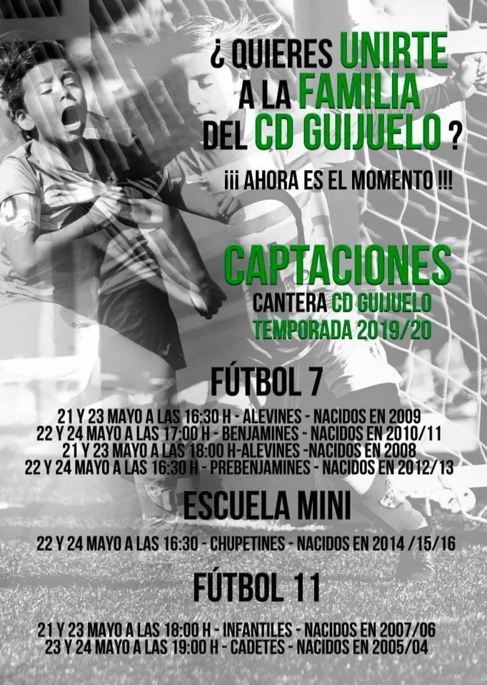 La Escuela de fútbol del CD Guijuelo comienza hoy con las captaciones de nuevos jugadores para la próxima temporada. Tras el final de la liga el pasado fin de semana, que contó con el ascenso del Juvenil como gran triunfo de esta temporada, comienza la selección de nuevos jugadores en la planificación de la próxima.