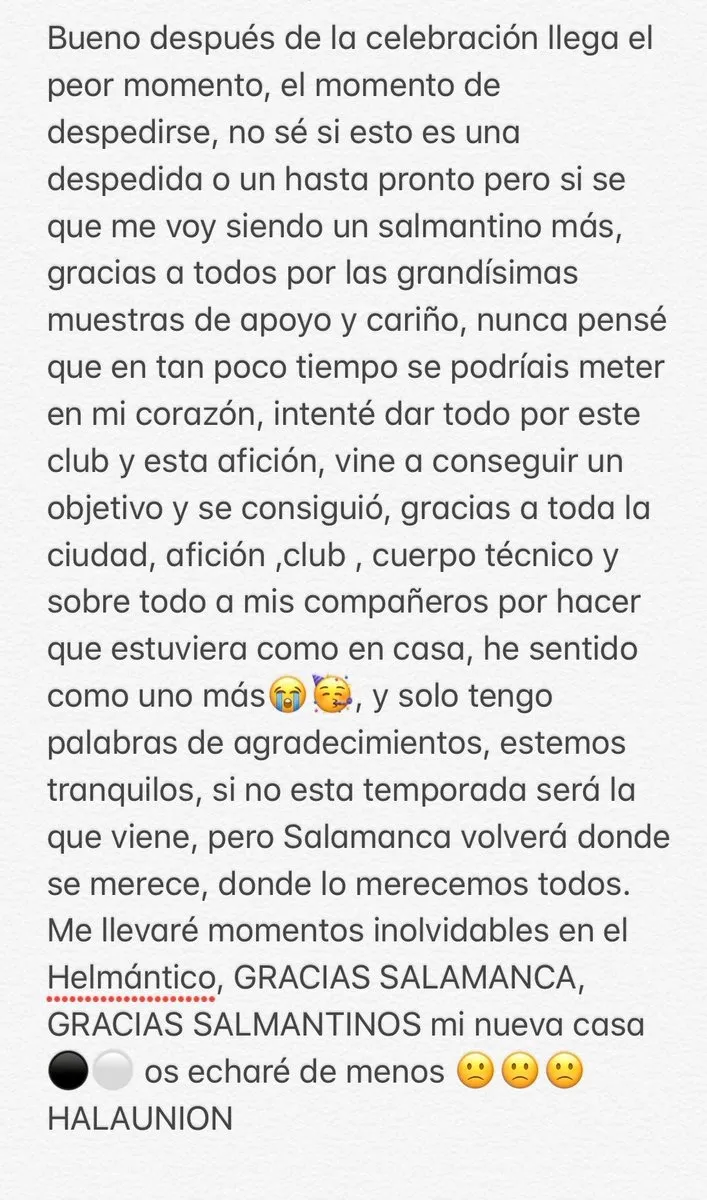 Continúan las despedidas en el Salamanca UDS. La última de ellas ha sido la realizada por Víctor Mena a través de sus redes sociales. El jugador andaluz se ha despedido en una carta de la que ha sido hasta ahora su afición, su ciudad, su club y sus compañeros, aunque no descarta volver, tal y como él mismo señala en la carta.