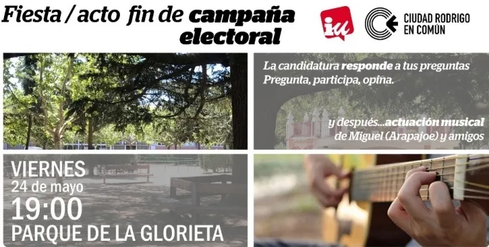 Izquierda Unida-Ciudad Rodrigo en Común cerrará su campaña electoral para los comicios del domingo con una fiesta, al igual que hizo hace 4 años la candidatura entonces denominada IU-En Común. Si en aquella ocasión el evento tuvo lugar a cubierto, esta vez se desarrollará al aire libre, en el Parque de La Glorieta, a partir de las 19.00 horas de la tarde del viernes (la campaña finalizará a medianoche).