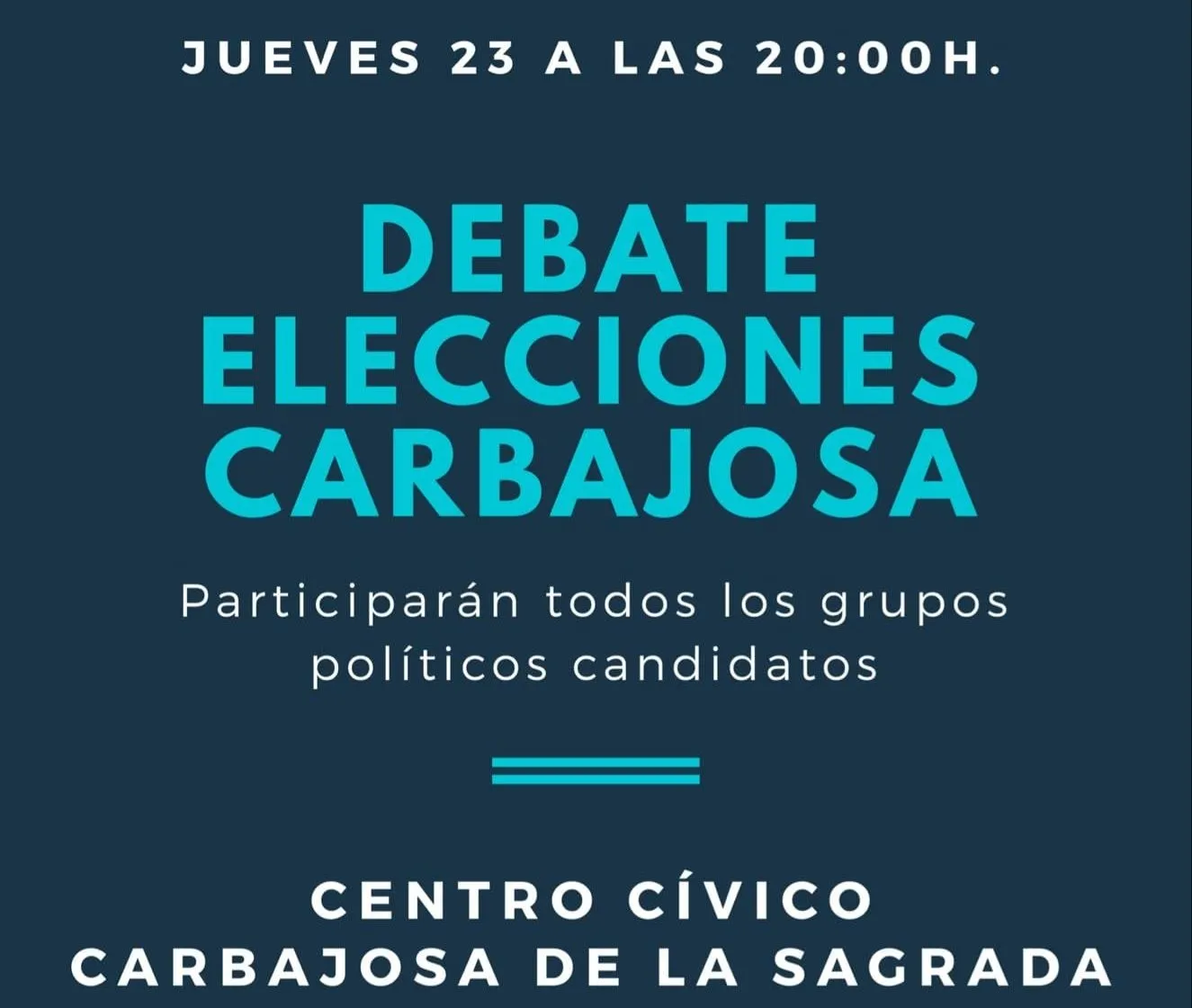 A iniciativa popular, a través de los moderadores de la página de Facebook Carbajosa de la Sagrada, los candidatos a la Alcaldía de los distintos partidos políticos en las elecciones del próximo domingo participarán este jueves, a las 20.00 horas en el Centro Cívico, en un debate en el que podrán exponer sus propuestas en los tres bloques en que se ha dividido: