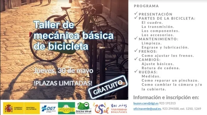 El Centro Superior de Educación Vial de la DGT y la Oficina Verde de la USAL han organizado un Taller de Mecánica Básica de Bicicleta que se celebrará el próximo jueves, 30 de mayo, a las 17.00 horas en las dependencias del Centro Superior de Educación Vial (Avda. Juan Pablo II, 44-54. 37008 - Salamanca). La sesión tendrá una duración aproximada de dos horas y media y será impartida por los miembros de Bikecicletas Salamanca.