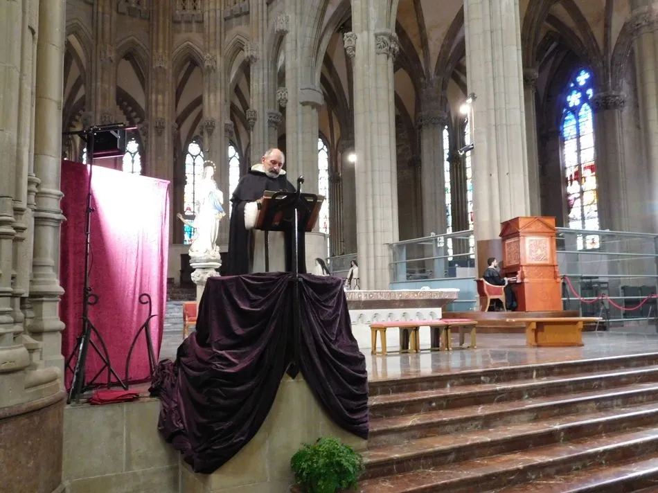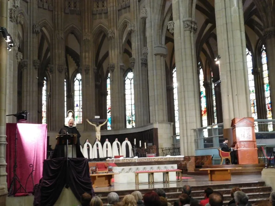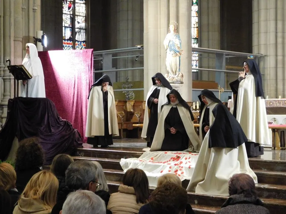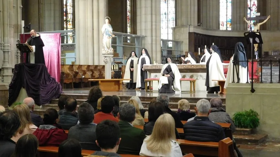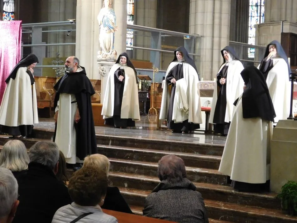 Un escenario de excepción si pensamos que se trata de la magnífica Catedral Nueva de Vitoria. De enormes proporciones, una de las más grandes de España, Santa María Inmaculada Madre de la Iglesia, que ésta es su advocación, es una construcción neo-gótica que en este 2019 cumple tan sólo medio siglo de existencia. Para celebrar este cumpleaños, la Diócesis de Vitoria-Gasteiz ha tenido a bien invitar a los salmantinos actores de ?Lazarillo de Tormes? para que formen parte de las diversas actividades culturales programadas para este evento. Las numerosas representaciones que de esta puesta en escena se han hecho, más de 260, la evidente aceptación de público y crítica que ha tenido, y el hecho de que haya sido vista por gente de la tierra anfitriona, avalaban esta elección que como de costumbre entusiasmó a los presentes. No importó la contundente envergadura de este templo, que aunque inacabado, sobrecoge con su horizontalidad luminosa de vidrieras de gran riqueza, exhuberancia de esculturas modernistas, que tanto le adornan fuera y dentro, o su singular atrio que corona la cripta donde los vitorianos celebran sus ceremonias religiosas. Sobre el presbiterio del altar Mayor, un grupo de monjas carmelitas del XVI, con sus pertinentes hábitos de su siglo en lana de paño de oveja, acaban de cantar un Kyrie Eleyson con el que llegan desde los caminos distintos que las han traído a lo que en este momento es para todos los espectadores la iglesia de la pequeña localidad salmantina de Alba de Tormes.