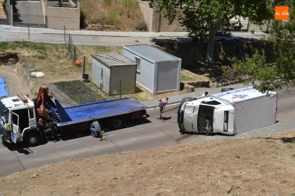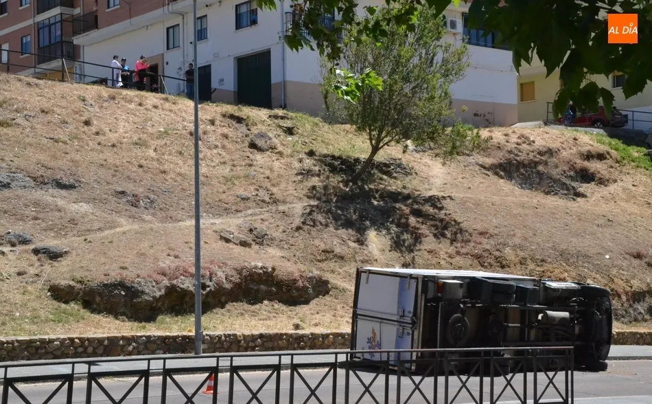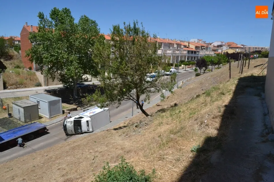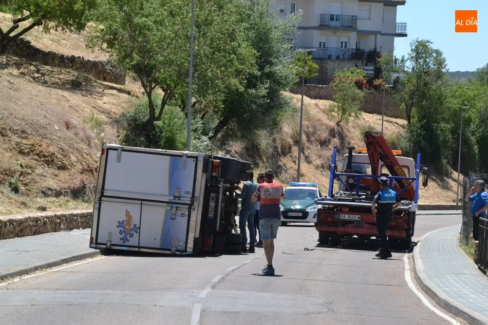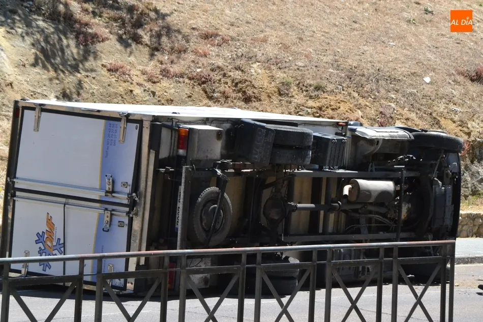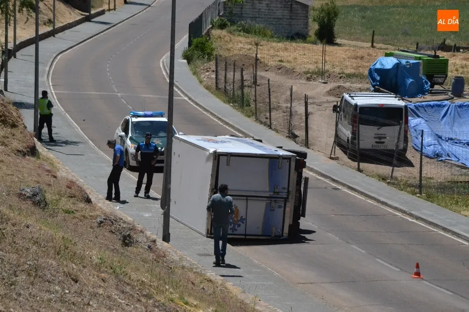 Un camión frigorífico que se encontraba en plena ruta de reparto en la mañana del martes por Ciudad Rodrigo se fue ladera abajo a última hora de la mañana en el mirador de Las Canteras, acabando tumbado en plena calzada de la calle Iberia, junto a la Fuente de las Tripas.