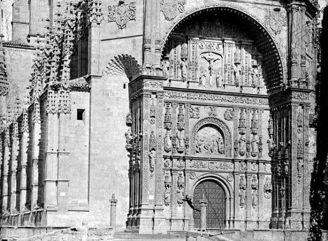 A Juan de Álava se le atribuye la espectacular portada de la iglesia. La capilla mayor está presidida por un espectacular y monumental retablo, de ritmo cóncavo, que se adapta al ábside de la iglesia dando especial relieve al cuerpo central. Su construcción data de 1691, y su dorso de 1739, diseñado por Joaquín Benito Churriguera.