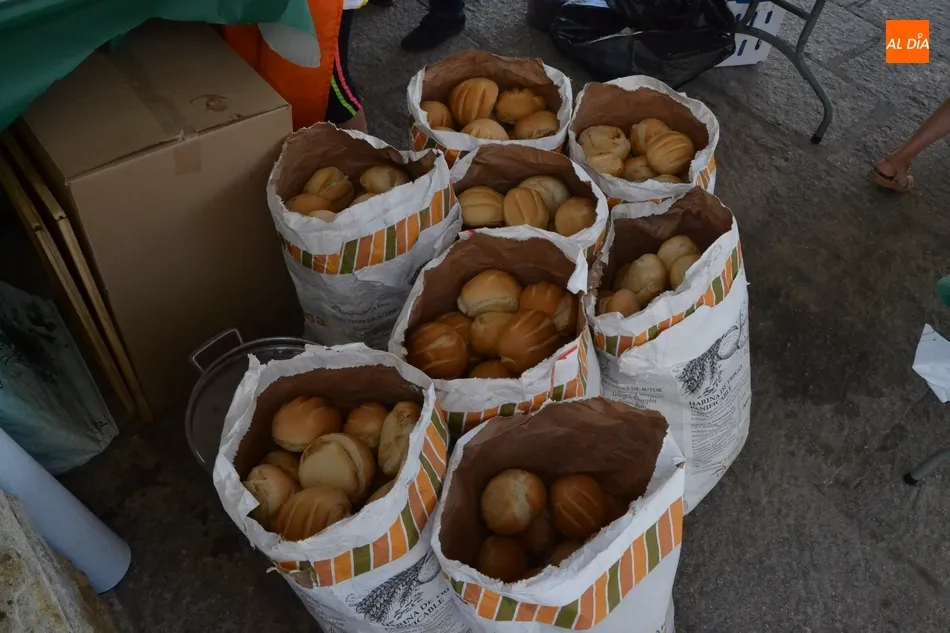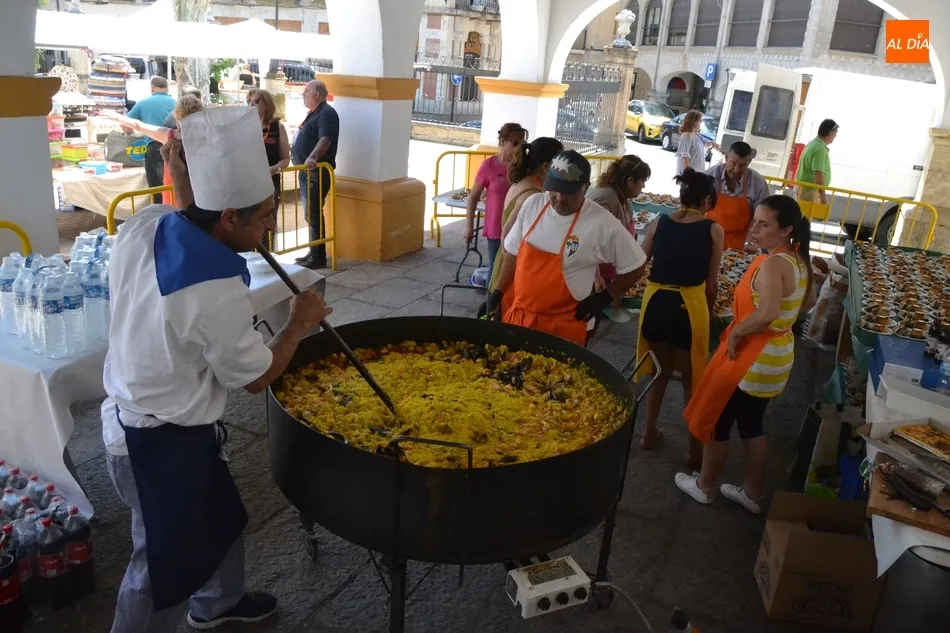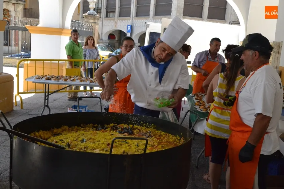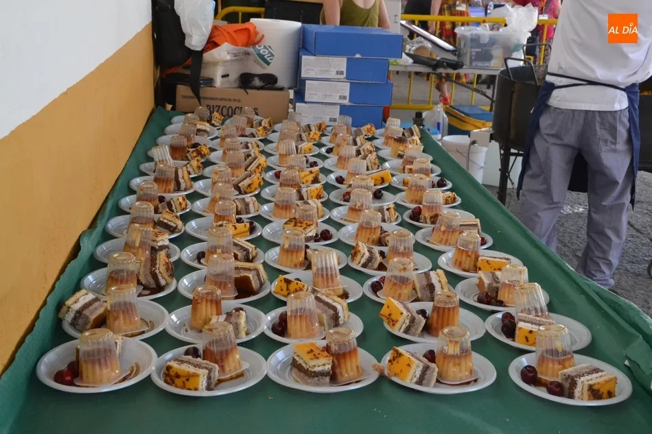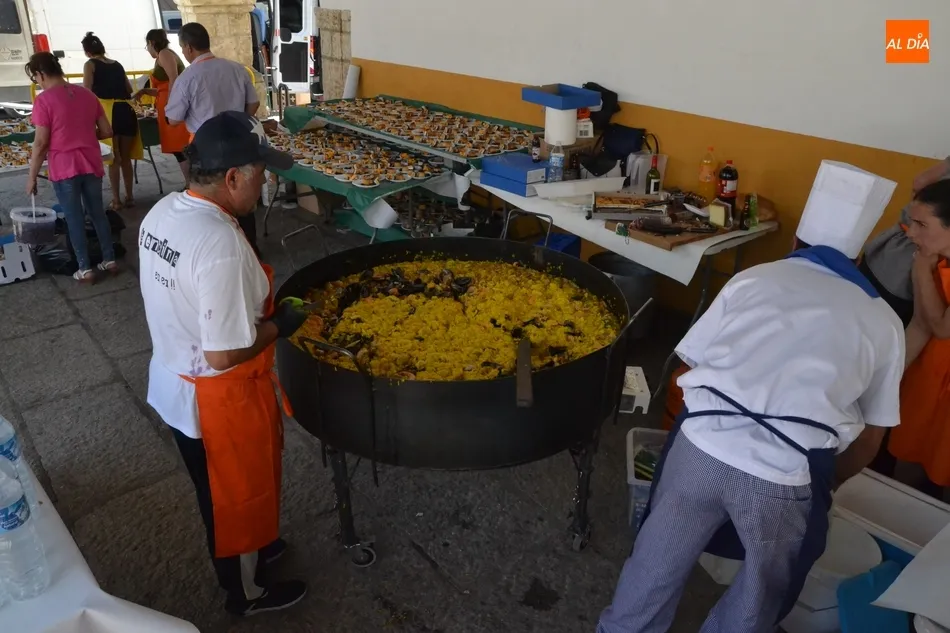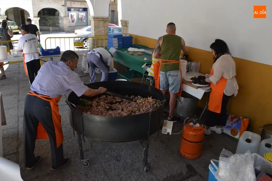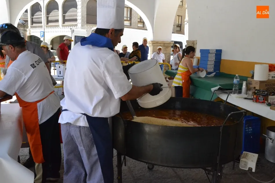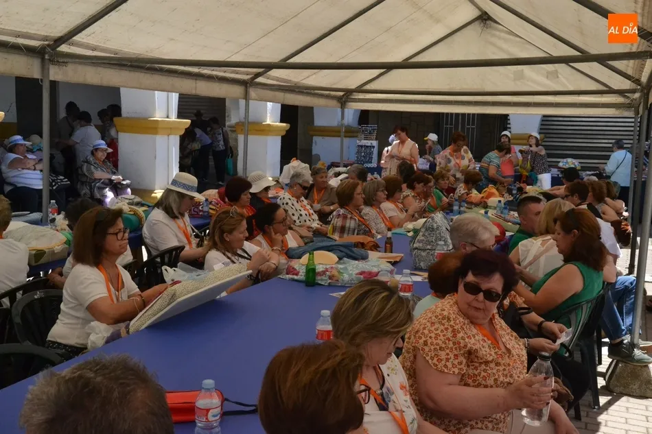 Finalizado el largo sorteo, fue turno para ir recogiendo la labor e irse preparando para la comida (algunas participantes ya no se quedaron a comer), cocinada en la propia Plazuela por el chef José Luis Benito y su equipo. Esa comida consistió en paella, acompañada de algo de embutido repartido por las organizadoras, así como flan, un trozo de bizcocho y cerezas como postre. Para rematar el Encuentro, a las 17.00 horas actuará la Rondalla III Columnas.