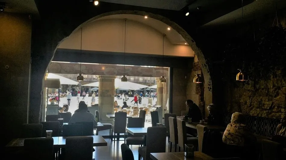 En el bar Gonzalo vivimos un baile de copas colgando con fantasías leves de cristal. Preferimos el estilo tradicional al diseño moderno más frío y árido, pero nos arrebataron esas curvas superpuestas de copas que encerraban la fachada del ayuntamiento y faroles de cuento. Detrás de los cristales con sus veladuras tembló la plaza como una sinfonía. En una esquina nos maravilló un juego de luces y sombras con limones y naranjas, casi un cuadro de Mark Rothko. En La Tentazione nos colocamos en un lugar privilegiado, vimos la plaza mayor al mismo tiempo que la plaza del poeta Iglesias, viajamos de espacio a espacio , vimos una de las entradas para afluir a la plaza, sorprendimos el costado de los soportales que la adensan. También el diseño es frío pero vimos lámparas de follaje recreándose sobre la barra y arcos que al reflejarse se ponían del revés con faroles cabeza abajo.