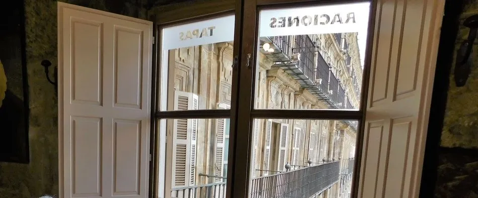 Entramos en el bar Los Bandos en la esquina con la calle Toro. Al futuro dueño se le cayó un zapatito y se lo recogí del suelo. Desde fuera el bar me pareció impersonal otros días pero al entrar vi una fiesta de colores y de luces en la plaza, lamparitas íntimas dentro hablaron con faroles prestantes en el exterior. En un rincón secreto de piedra nos susurraba una cajita de junco, un jamón cortado sobre una mesa nos saludó con su exquisitez sin discursos. La piedra y la madera aliviaron la tendencia al diseño abstracto. Llegamos otra vez al café Real, pedimos dos vinos. La plaza se nos enfrentó en dos de sus lados con sus balaustradas en lo alto, con sus cornisas alargadas. De nuevo fue la música, la armonía interminable de esta plaza como una canción, esta serenidad apasionada.