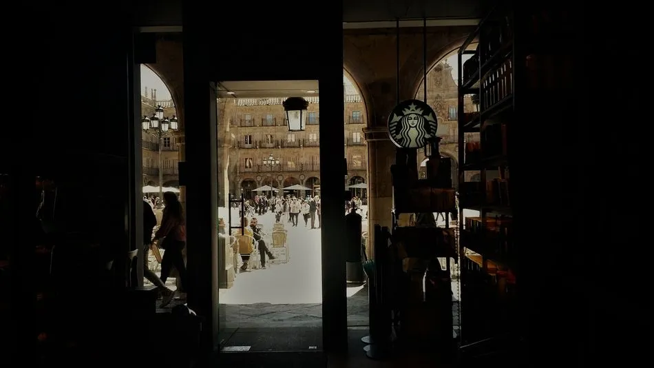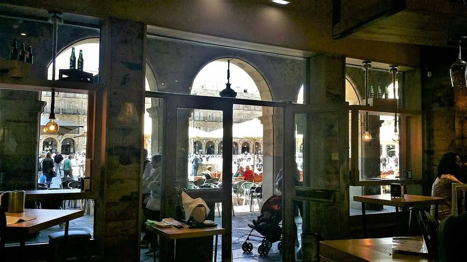 Nos llegó el momento del café Starbucks. Muchas cosas me repatean en la estética yanqui pero siempre me pareció que los cafés Starbucks nacidos en la bohemia Seattle tenían clase, igual que los locales elegantes en que estuve en Filadelfia. Allí no tuvimos alcohol, pero el café nos pareció exquisito, y el olor nos adensó y nos llenó de literatura. Entramos en el café Abadía y llegamos a la esquina de la plaza con la calle Concejo. Grandes arcos con lámparas atenuadas nos trajeron reminiscencias de abadías donde monjes hacían espiritualidad con el vino. En la puerta de madera verde un arco gótico comulgó con la calidez de los jamones sobre la piedra. La música de la plaza se nos casó con la sinceridad del jamón de Salamanca.