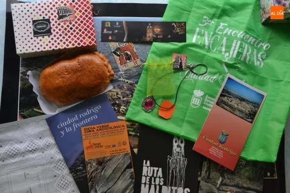 Como siempre, la bolsa (de color verde) se complementaba con diverso material turístico: un póster con una vista aérea de Ciudad Rodrigo, varios folletos turísticos ?entre ellos uno de Siega Verde y otro de la Ruta de los Malditos-, un plano de la ciudad, el marcapáginas con la vista nocturna de Miróbriga que incluye el calendario de eventos a celebrar en la ciudad en 2019, y un calendario de bolsillo del Carnaval del Toro 2019.