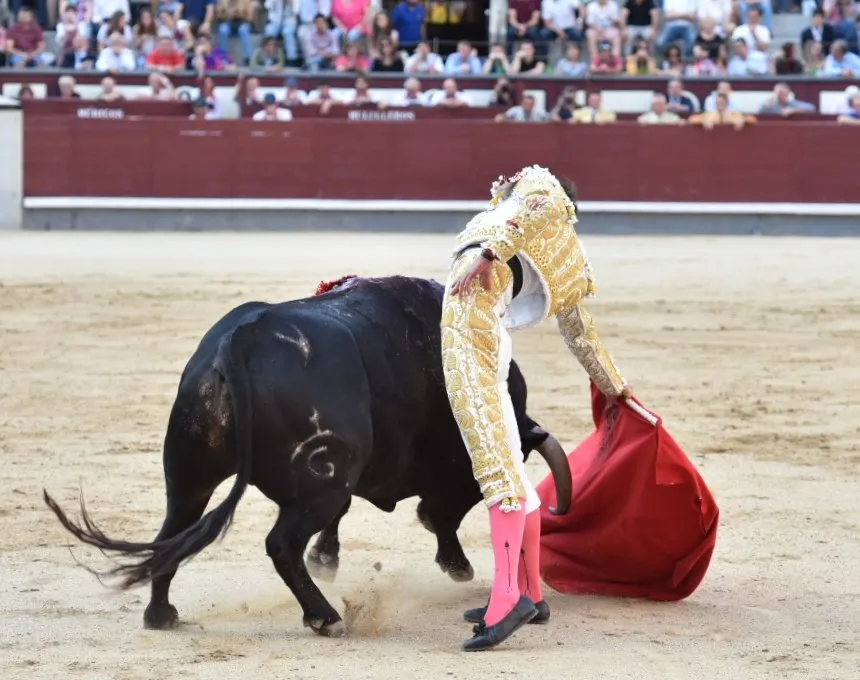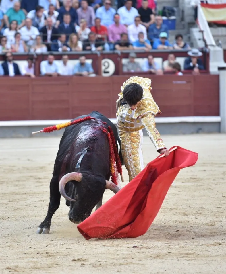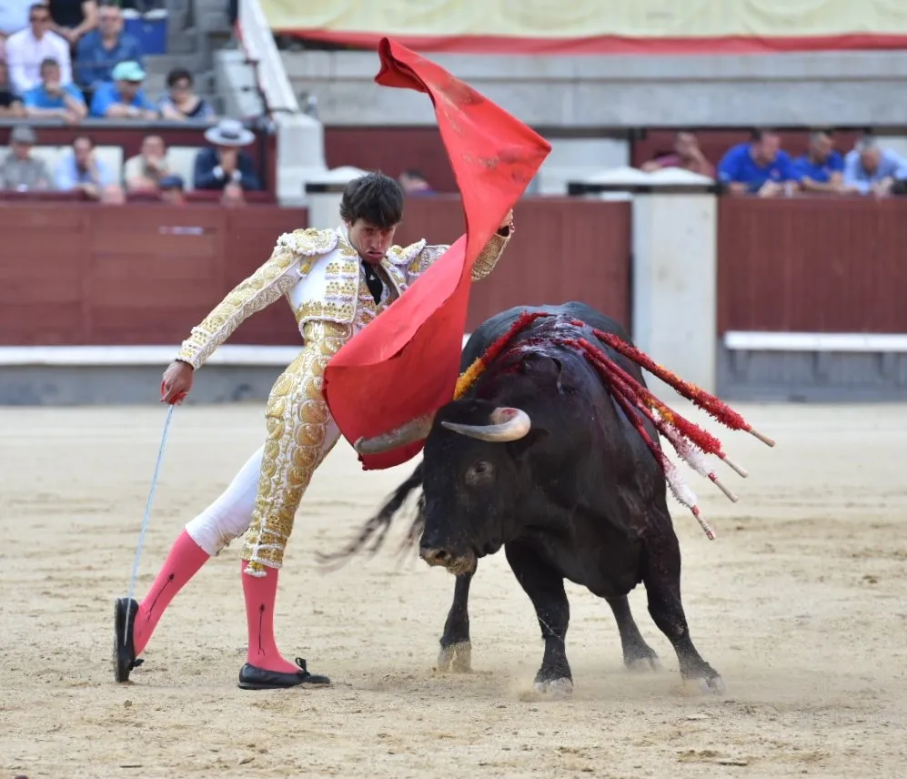 Al público fue el brindis de Juanito del primer novillo del festejo, un animal descompuesto en la embestida en los primeros compases de la lidia y al que le intentó dar mano baja el joven ya en el inicio del trasteo. Mejor embestía por el pitón izquierdo y por ahí Juanito intentó torearlo largo, pero su labor no llegó con fuerza al tendido. Perdió pie afortunadamente sin consecuencias a la hora de entrar a matar, siendo ovacionado el novillo en el arrastre y silenciada la labor del joven portugués.