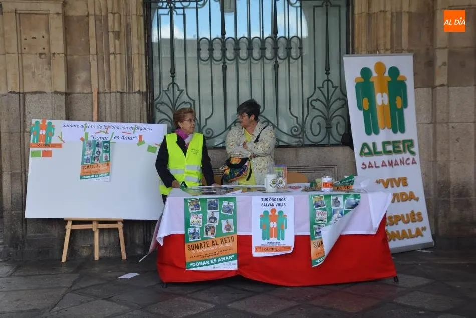 Este miércoles, 5 de junio, se celebra el Día Nacional del Donante de Órganos con el lema ?Súmate al reto de la donación de órganos. Donar es amar?. Con el principal objetivo de visibilizar y concienciar a la sociedad salmantina de la necesidad de donar, Alcer ha instalado mesas informativas en Plaza Mayor, Plaza del Liceo, Puerta Zamora, La Rúa y María Auxiliadora.