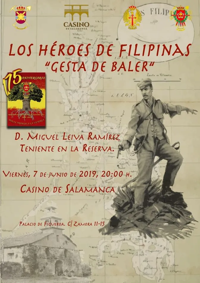 La conferencia tendrá lugar en el auditorio del Casino de Salamanca a las 20.00 horas. El teniente Leiva, amplio conocedor de historia militar, con motivo de la conmemoración del 120 aniversario de tan importante hito histórico para el ejército español, dará a conocer lo acontecido durante el sitio en la capilla de Baler a los denominados Héroes de Filipinas, entre los que se encontraban componentes de nuestro Regimiento de Especialidades de Ingenieros nº 11.