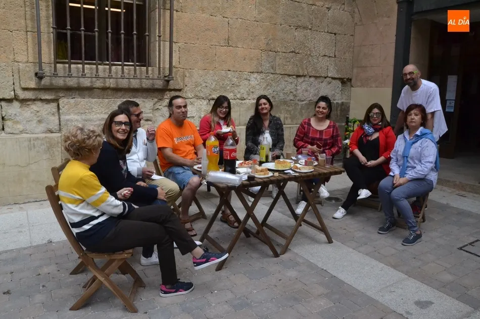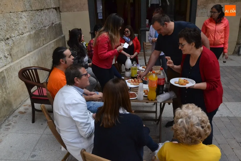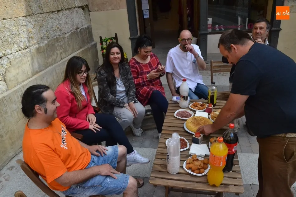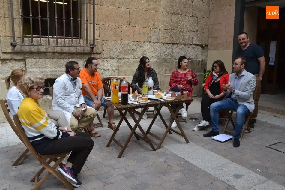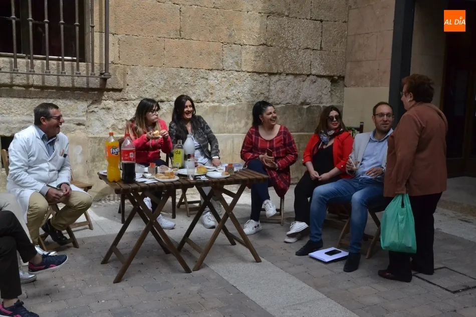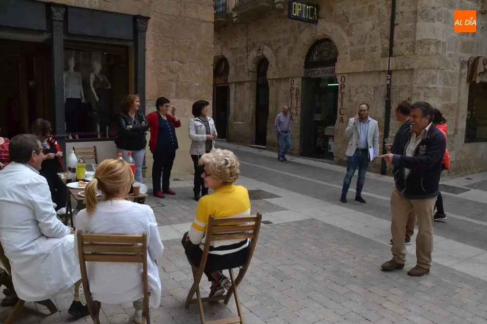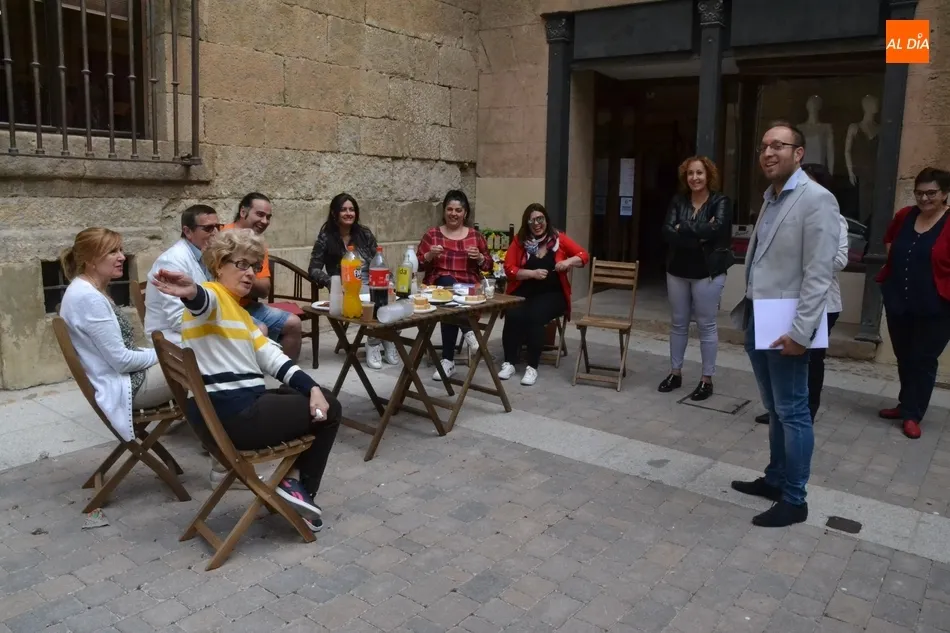 Por iniciativa del Café-Bar La Tertulia de la vecina calle Toro, se reivindicó el regreso del banco con un pincho callejero, para lo cual se desplegaron sillas y una mesa sobre la cual se colocaron una tortilla, croquetas, empanadillas o embutido, de los que dieron buena cuenta los comerciantes de la vía que se fueron acercando hasta allí cuando la disponibilidad de sus negocios se lo permitió.