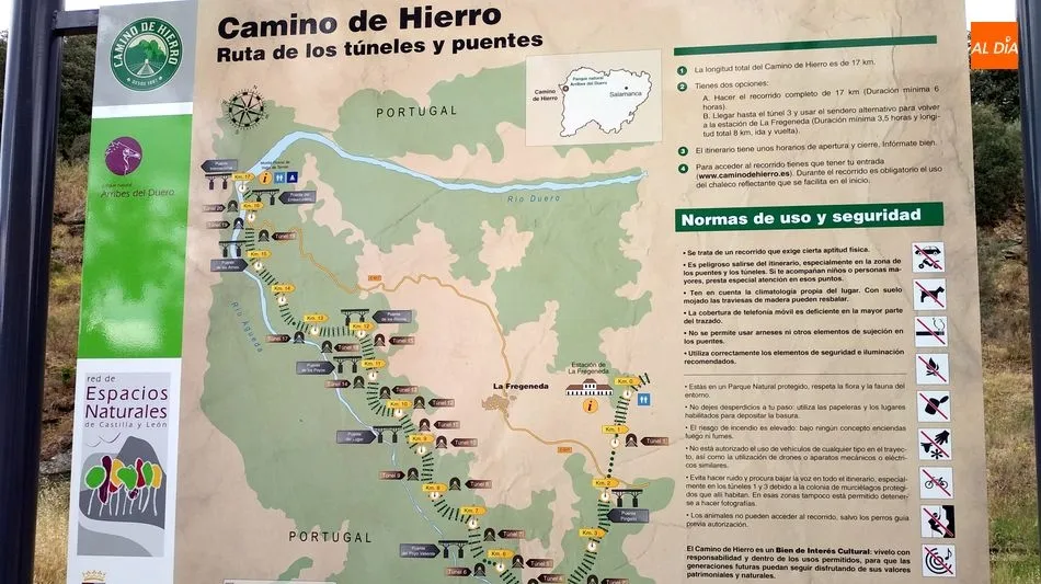 La Diputación de Salamanca ha colgado hoy en la web de turismo www.salamancaemocion.es la prohibición de acceso al Camino de Hierro, la Ruta de los túneles y puentes que comienza en la estación de la Fregeneda. En el texto publicado se anuncia: "Hasta la apertura oficial, el acceso al Camino de Hierro está totalmente prohibido. La Diputación Provincial de Salamanca no se hace responsable de los posibles accidentes que puedan ocurrir en el itinerario aún cerrado. Las autoridades competentes perseguirán a los infractores y, en caso de accidente, se les podrá imputar los costes del rescate al estar la ruta cerrada".