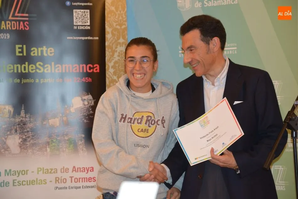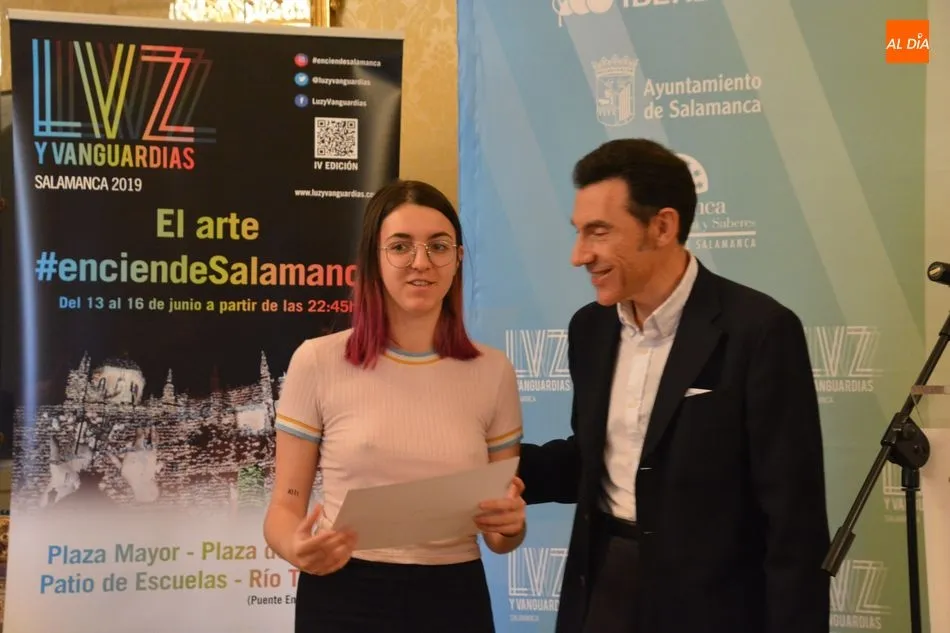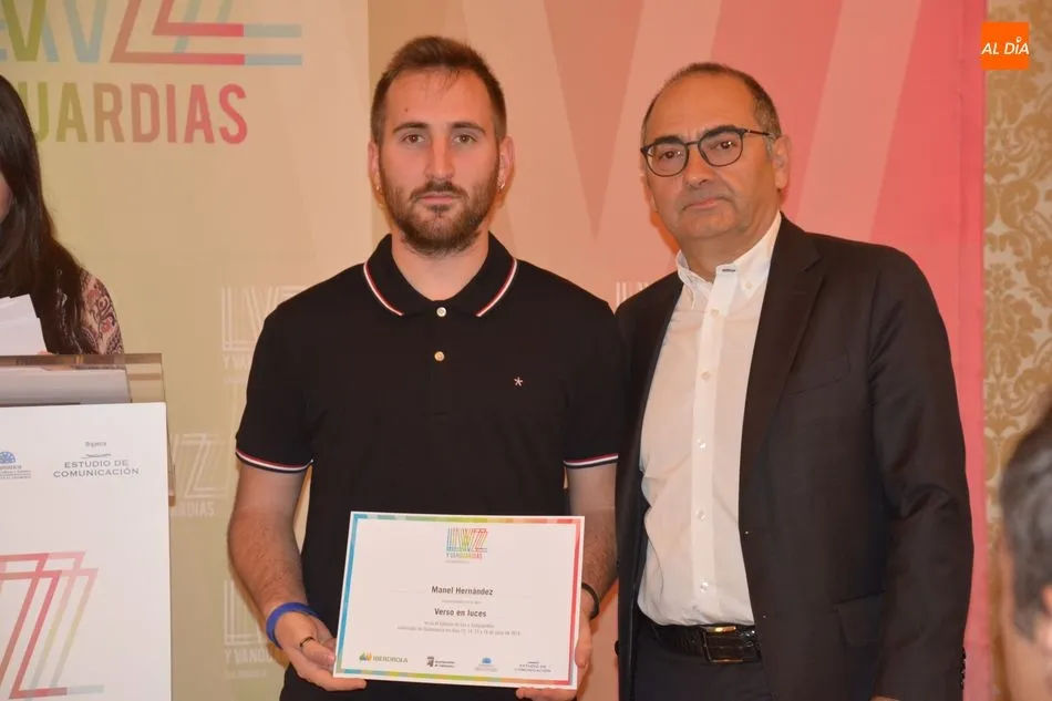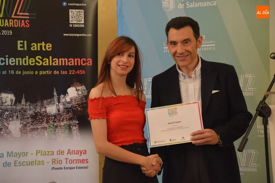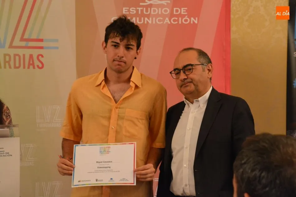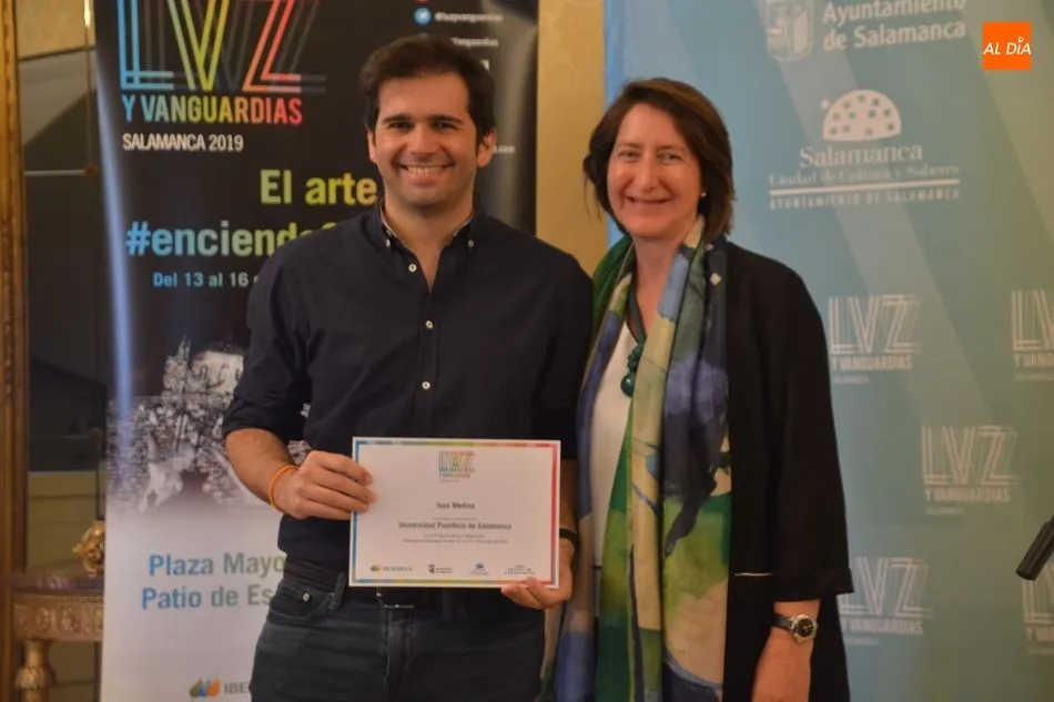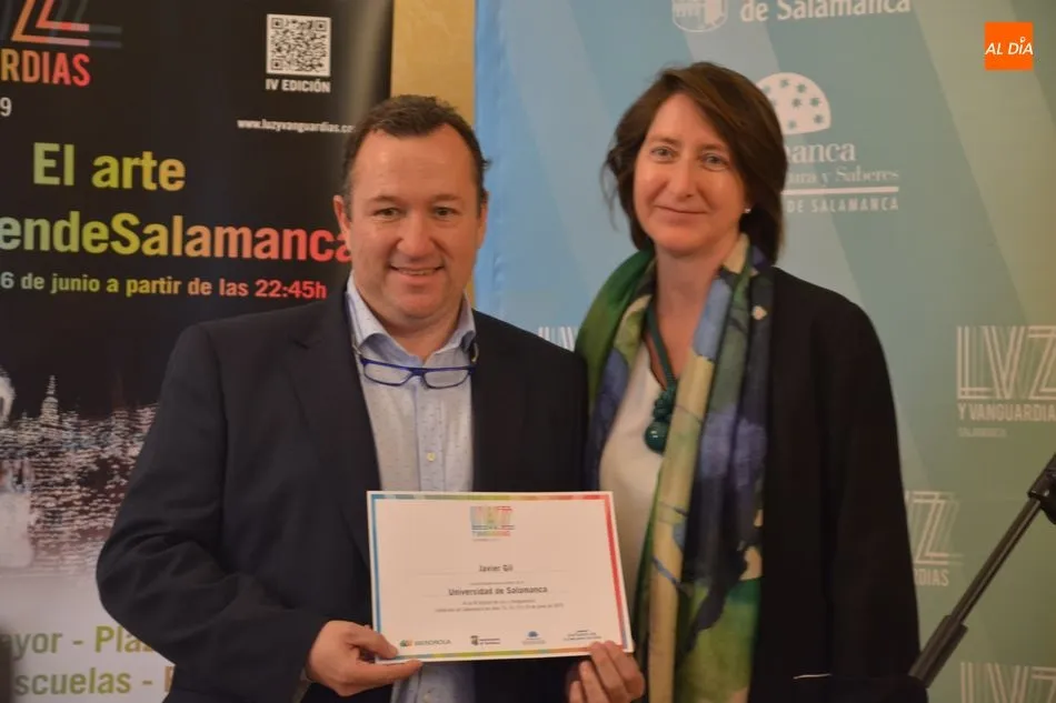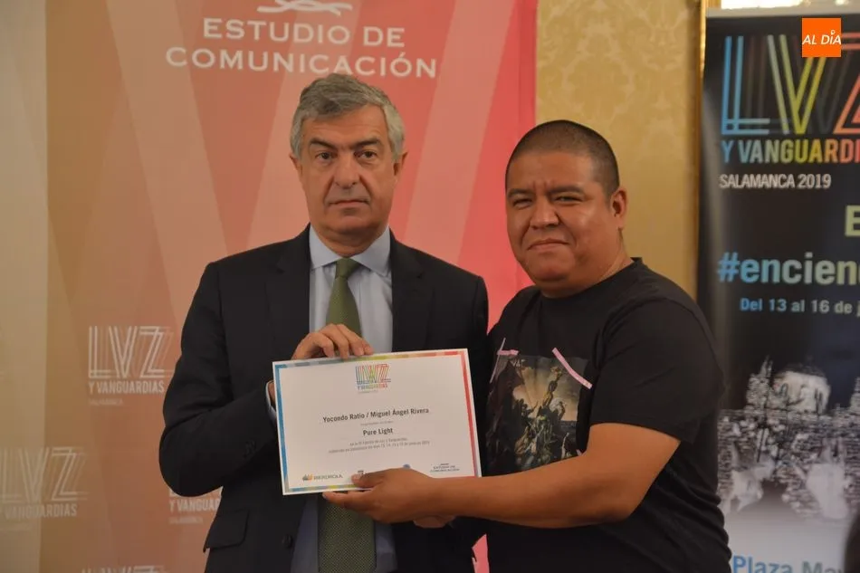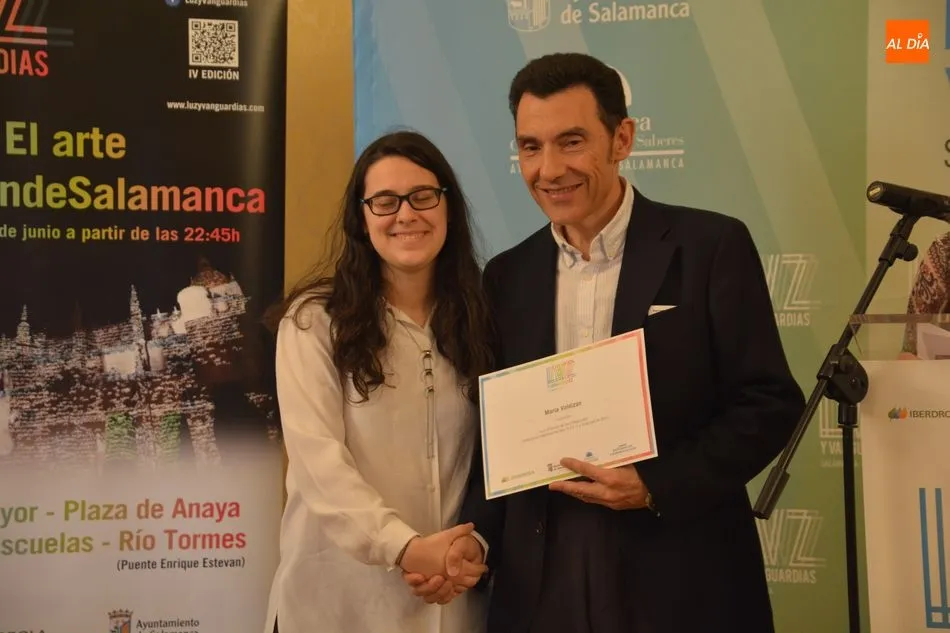 Luis Gómez asesor de Presidencia de Iberdrola, empresa que apoya la celebración del festival Luz y Vanguardias, ha entregado menciones al resto de los artistas y estudios presentes en el acto. Los creadores de ambas universidades de Salamanca, que durante estos días están proyectando sus obras sobre el edificio histórico de la Universidad han recibido también diplomas acreditativos de manos de Benito Berceruelo, Consejero Delegado de Estudio de Comunicación, la empresa organizadora del festival.