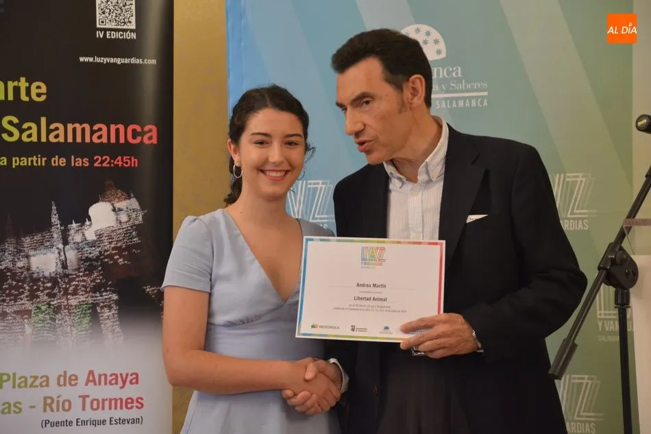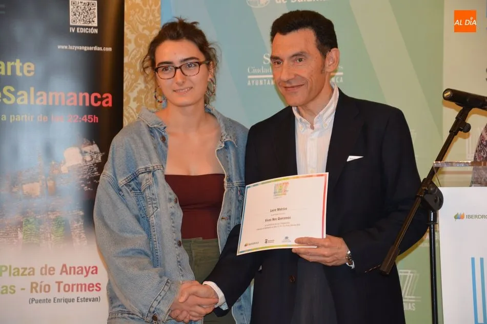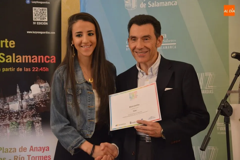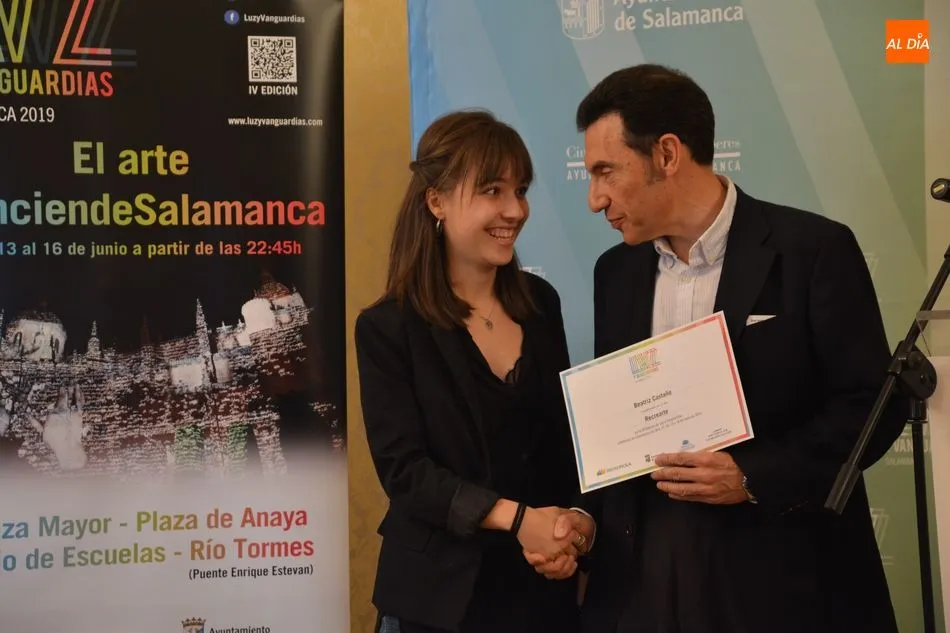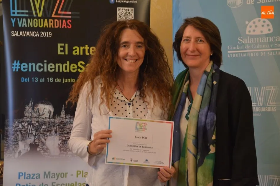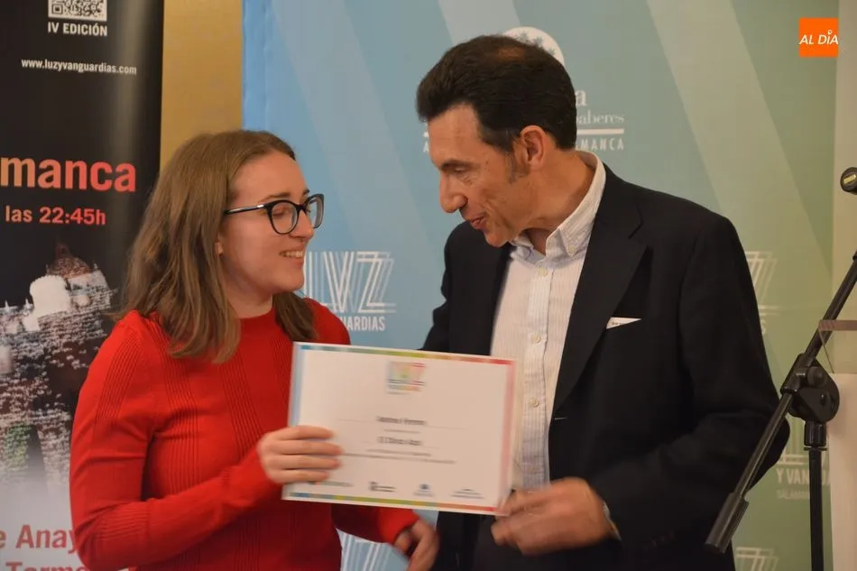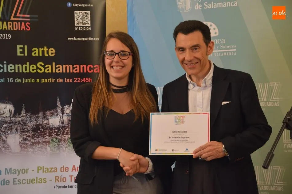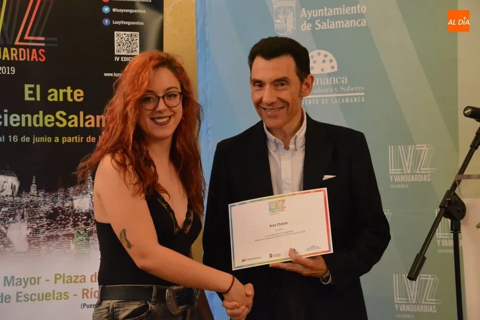 Luis Gómez asesor de Presidencia de Iberdrola, empresa que apoya la celebración del festival Luz y Vanguardias, ha entregado menciones al resto de los artistas y estudios presentes en el acto. Los creadores de ambas universidades de Salamanca, que durante estos días están proyectando sus obras sobre el edificio histórico de la Universidad han recibido también diplomas acreditativos de manos de Benito Berceruelo, Consejero Delegado de Estudio de Comunicación, la empresa organizadora del festival.