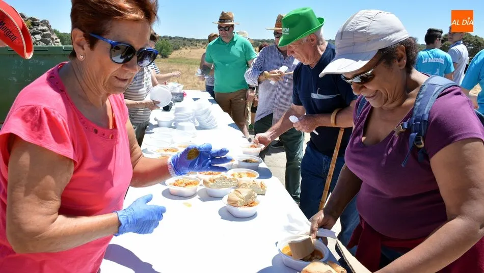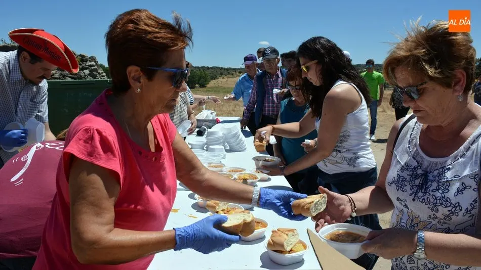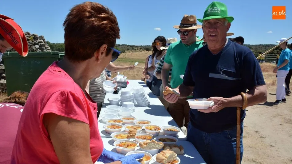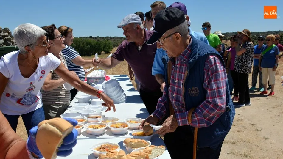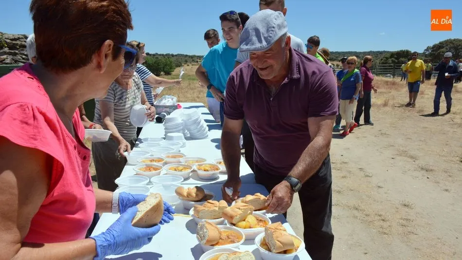 Pasadas las 15 horas se inició el reparto de un exquisito guiso de patatas con carne, ofrecido por el Ayuntamiento de la localidad y cocinado y repartido por un grupo de vecinos voluntarios. A la sombra de los árboles del entorno se situaron grupos de Peñas, familias y amigos de todas las edades para disfrutar de esta jornada campestre.