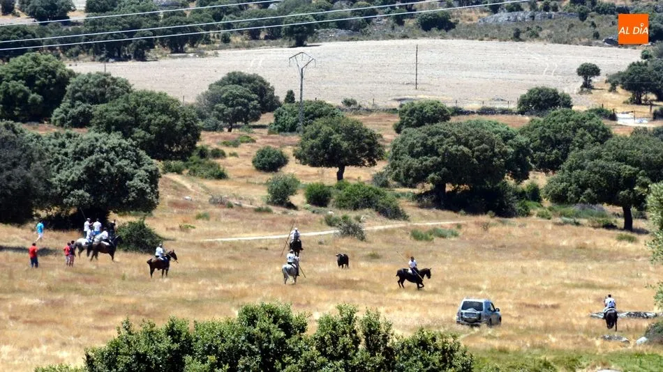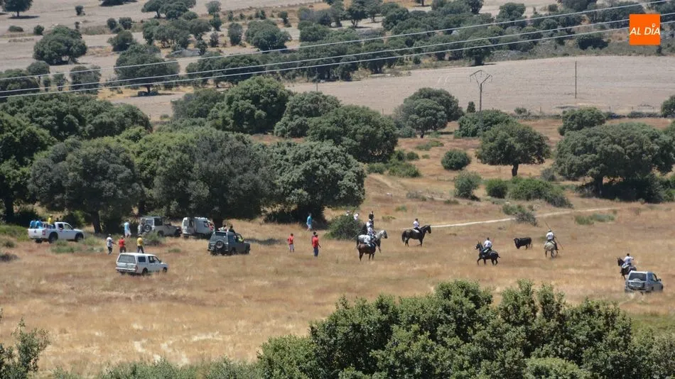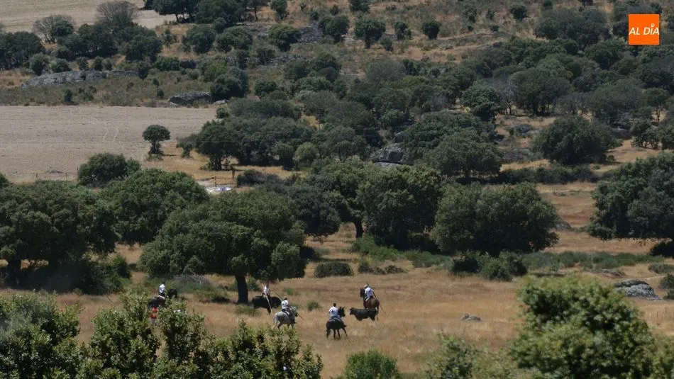 Los encerradores de la localidasd se lucieron en el tradicional ?apartado de la corrida? conduciendo a dos vaquillas por el Monte