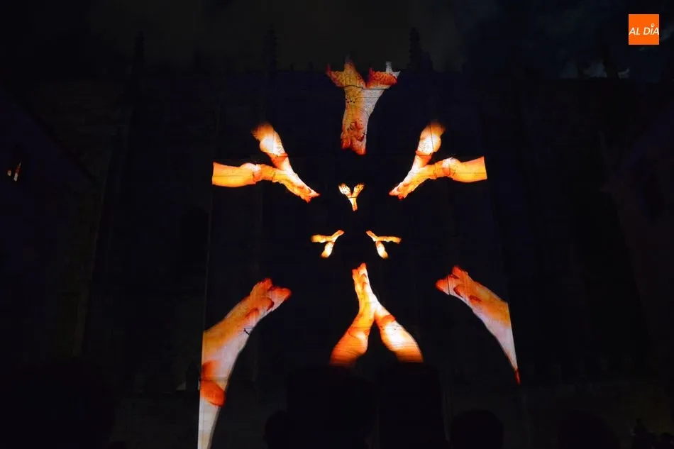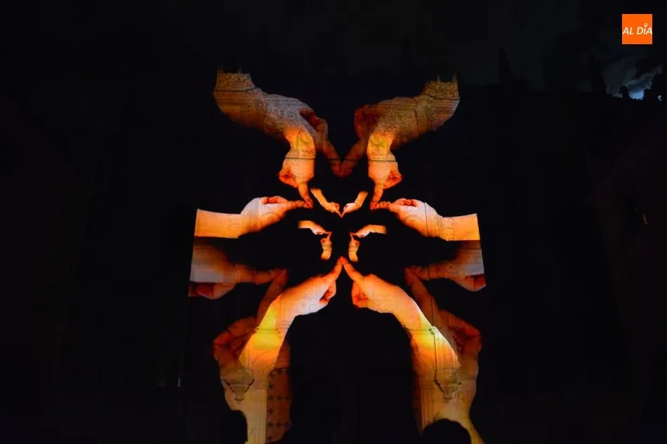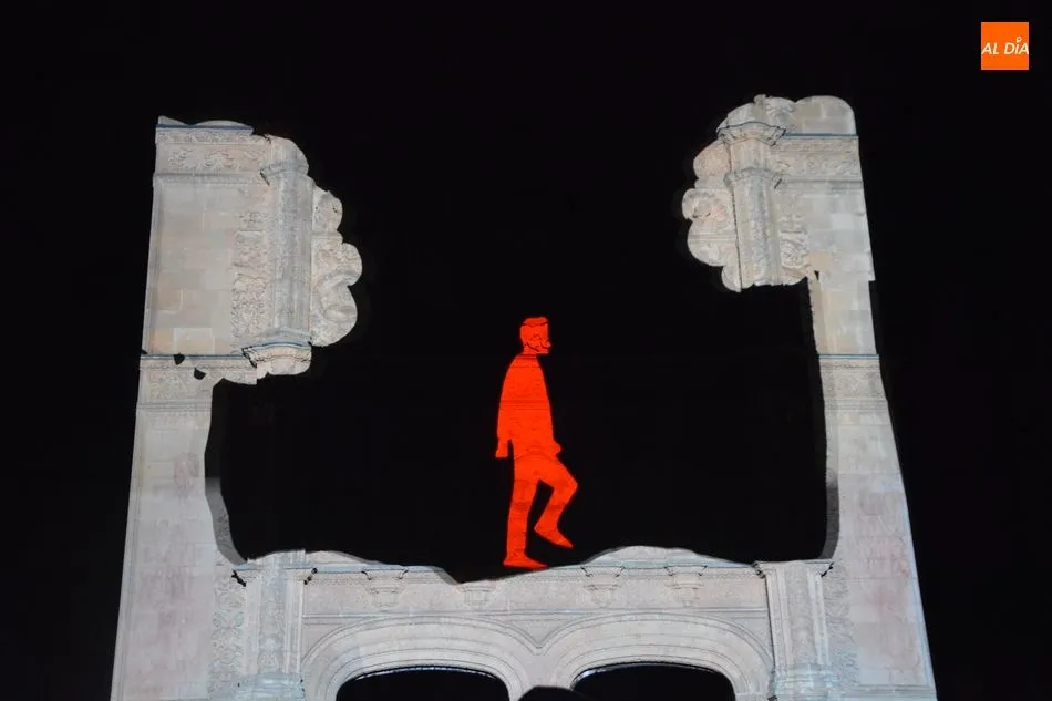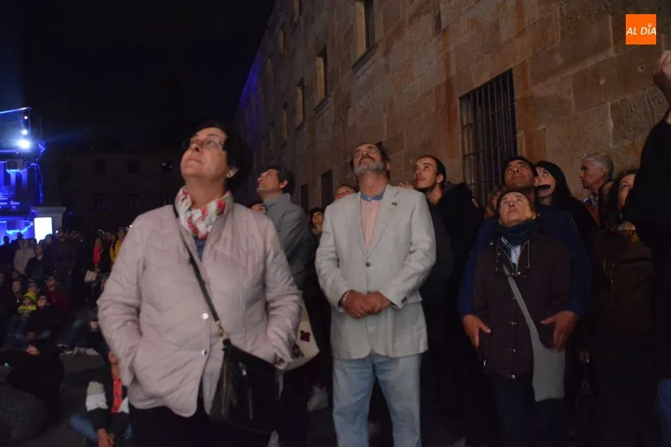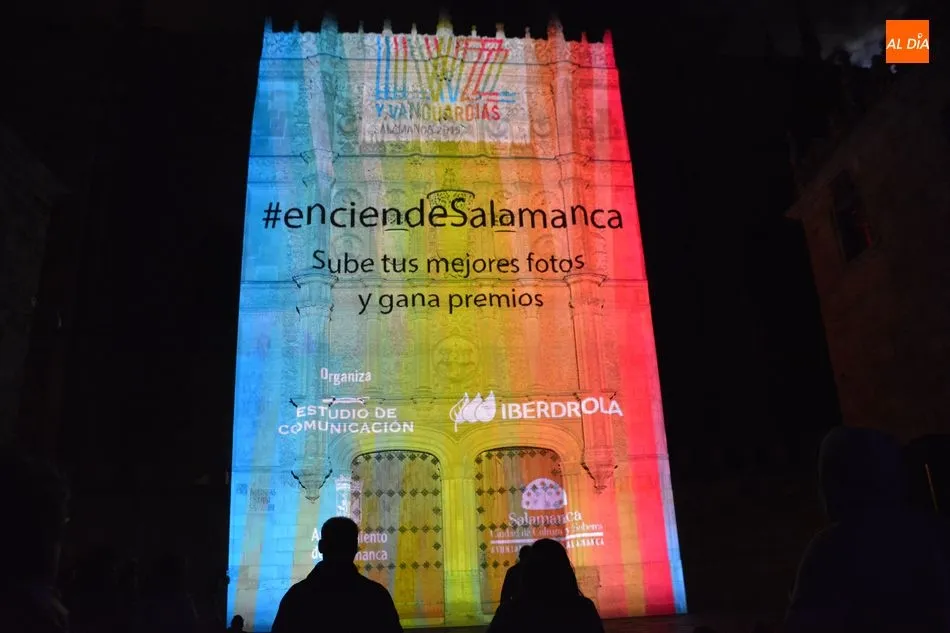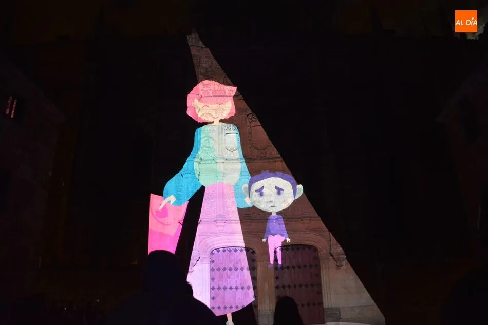 La impresionante portada de la fachada del edificio histórico de la Universidad de Salamanca se ha convertido en esta edición en un lienzo único de Luz y Vanguardias, en la última noche del festival que ha tenido lugar desde el pasado jueves. Escenario elegido para proyectar las obras de los jóvenes creadores, en este caso de los estudiantes de Bellas Artes y Comunicación Audiovisual de la Universidad de Salamanca (USAL) y de la Facultad de Comunicación de la Universidad Pontificia de Salamanca (UPSA).