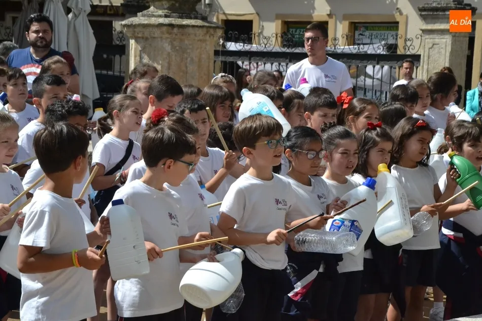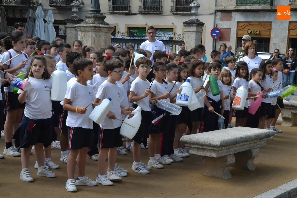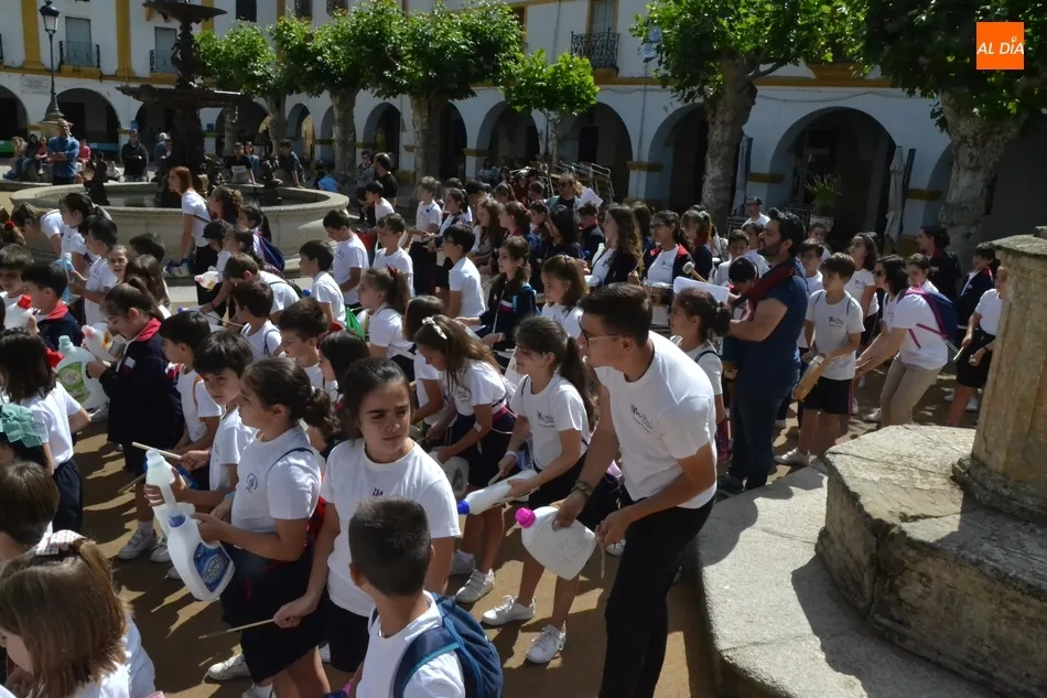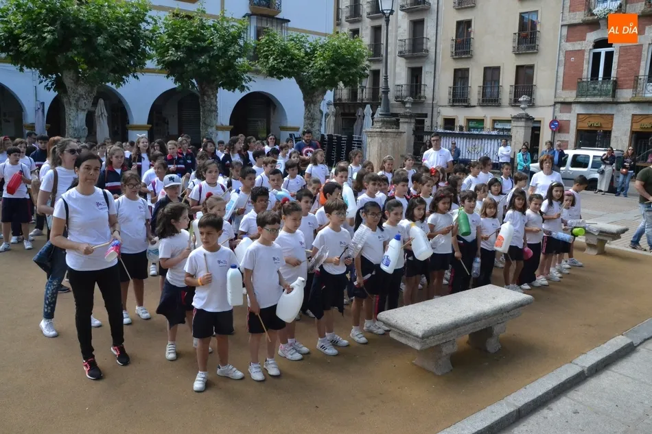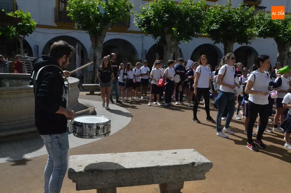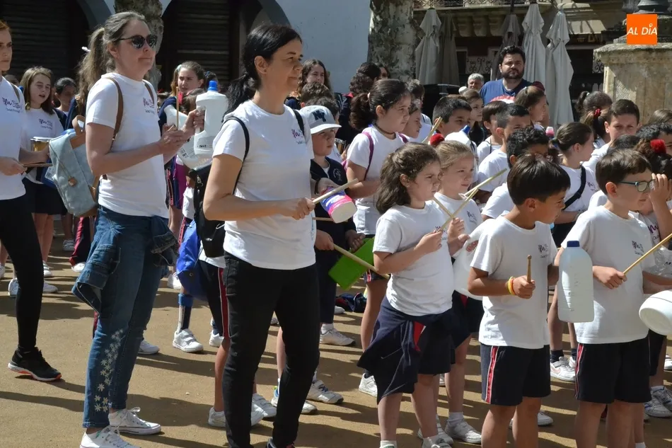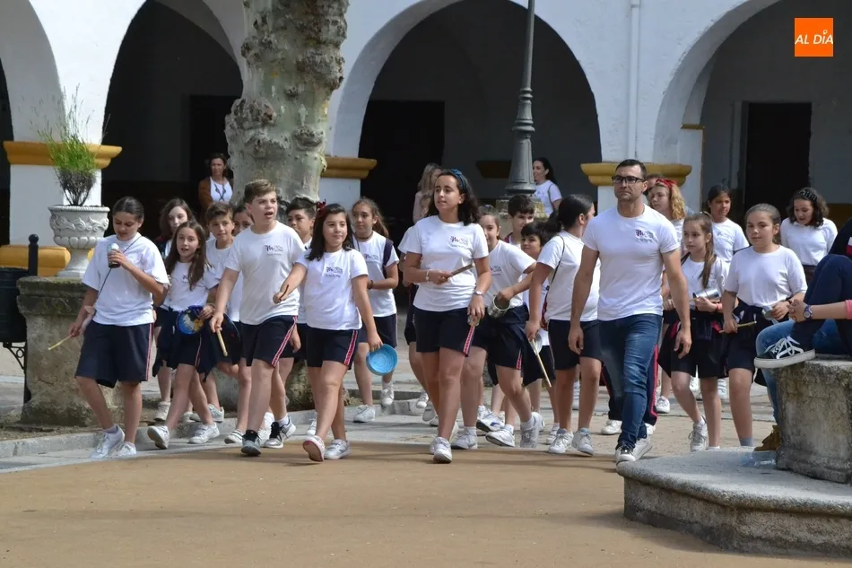 Misioneras-Santa Teresa cierra el curso al aire libre con un flash mob y un mercadillo   | Imagen 1La celebración tuvo como apertura un flash mob en el que participaron todos los alumnos de Educación Primaria (los de Infantil y Secundaria estuvieron observándoles), quienes, tras poner los primeros acordes varios miembros de charangas mirobrigenses, aparecieron desde distintos rincones de la Plazuela para reunirse todos en una zona para tocar al estilo batukada.