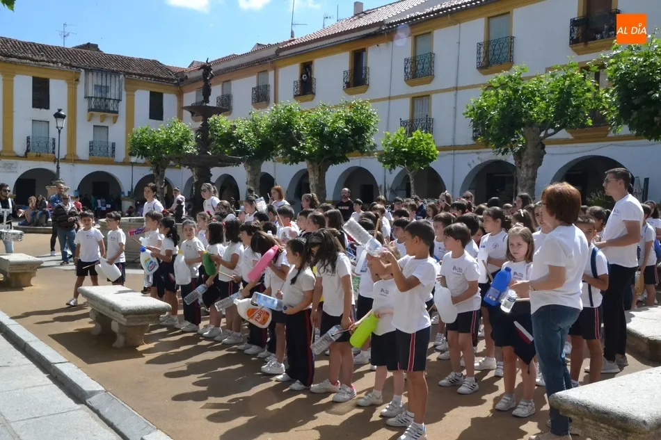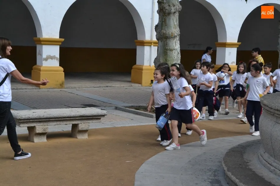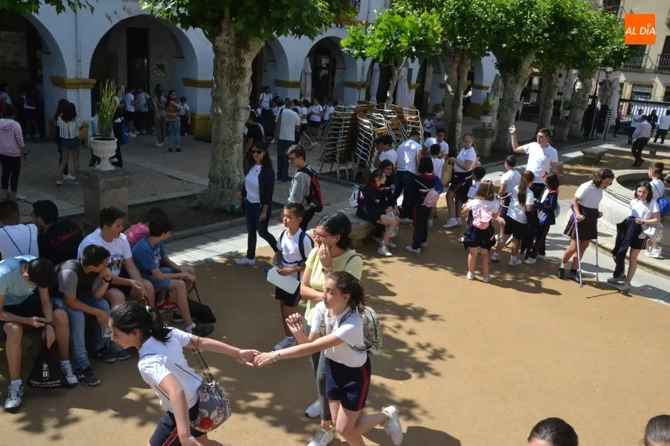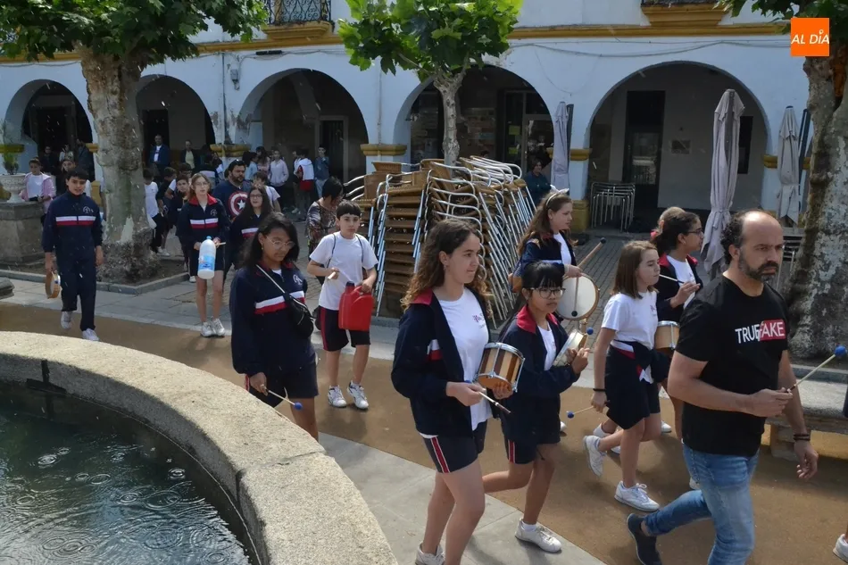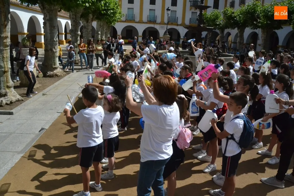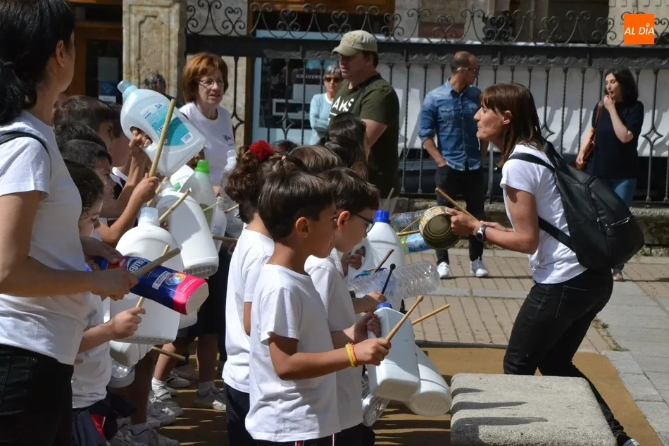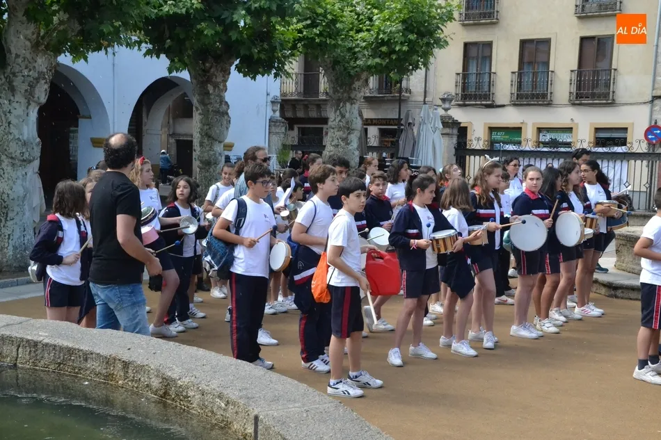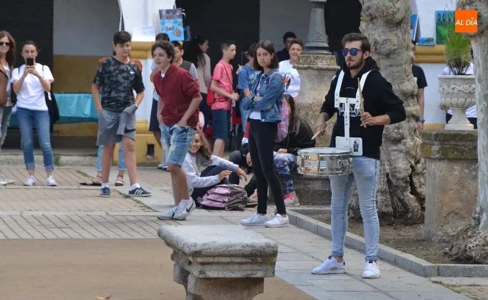 Misioneras-Santa Teresa cierra el curso al aire libre con un flash mob y un mercadillo   | Imagen 1La celebración tuvo como apertura un flash mob en el que participaron todos los alumnos de Educación Primaria (los de Infantil y Secundaria estuvieron observándoles), quienes, tras poner los primeros acordes varios miembros de charangas mirobrigenses, aparecieron desde distintos rincones de la Plazuela para reunirse todos en una zona para tocar al estilo batukada.