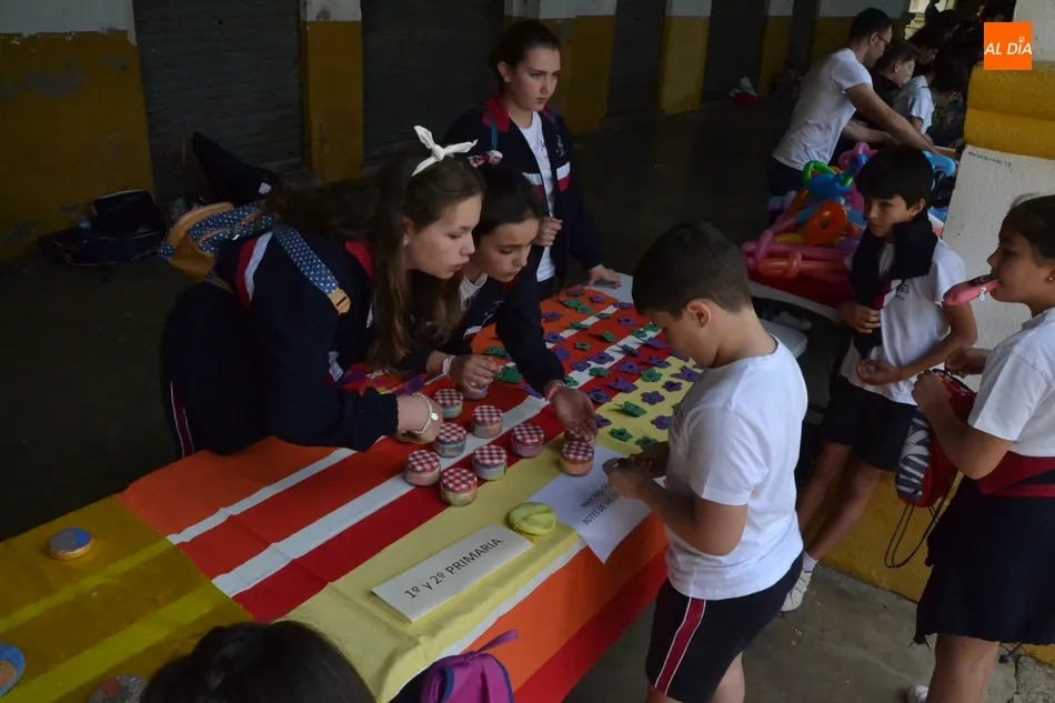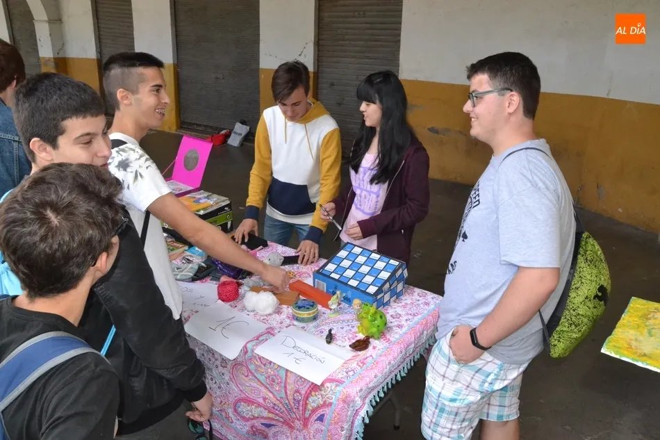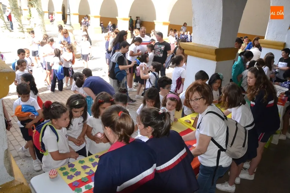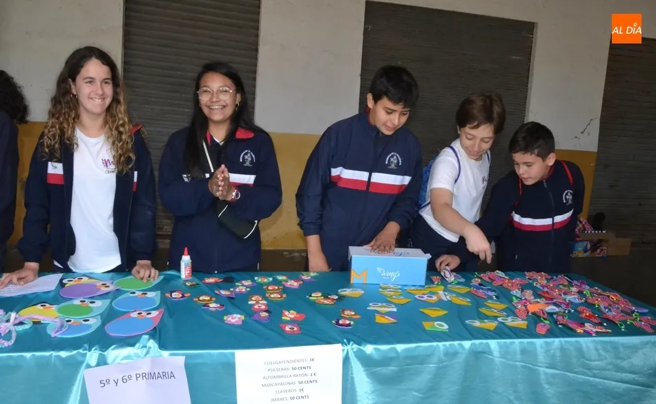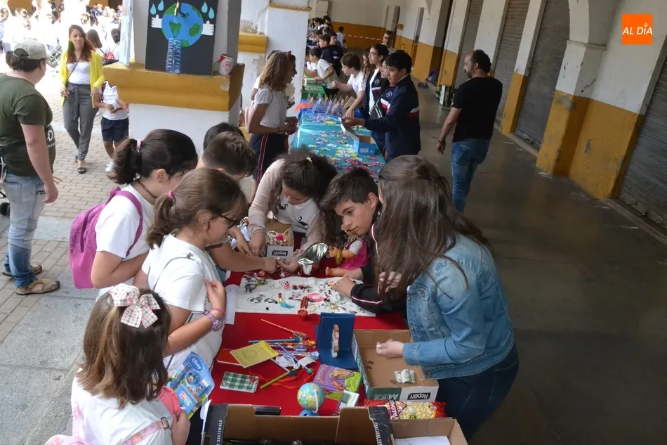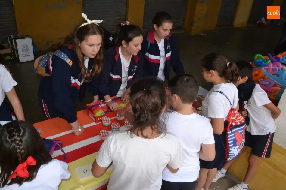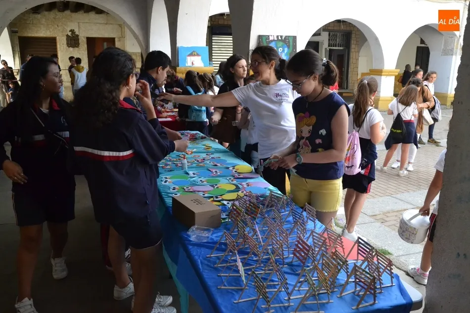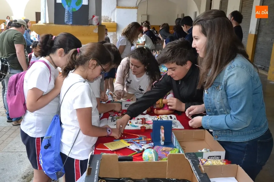 Finalizada esa actuación, empezó a funcionar un mercadillo solidario instalado por los diversos cursos en una de las zonas de soportales de la Plazuela, donde tuvieron a la venta objetos que han fabricado durante estos días en su Semana Cultural, además de otros elementos de mercandising del propio Colegio, y otros objetos usados a los que se quiere dar una segunda vida (como libros, mochilas, juguetes...).