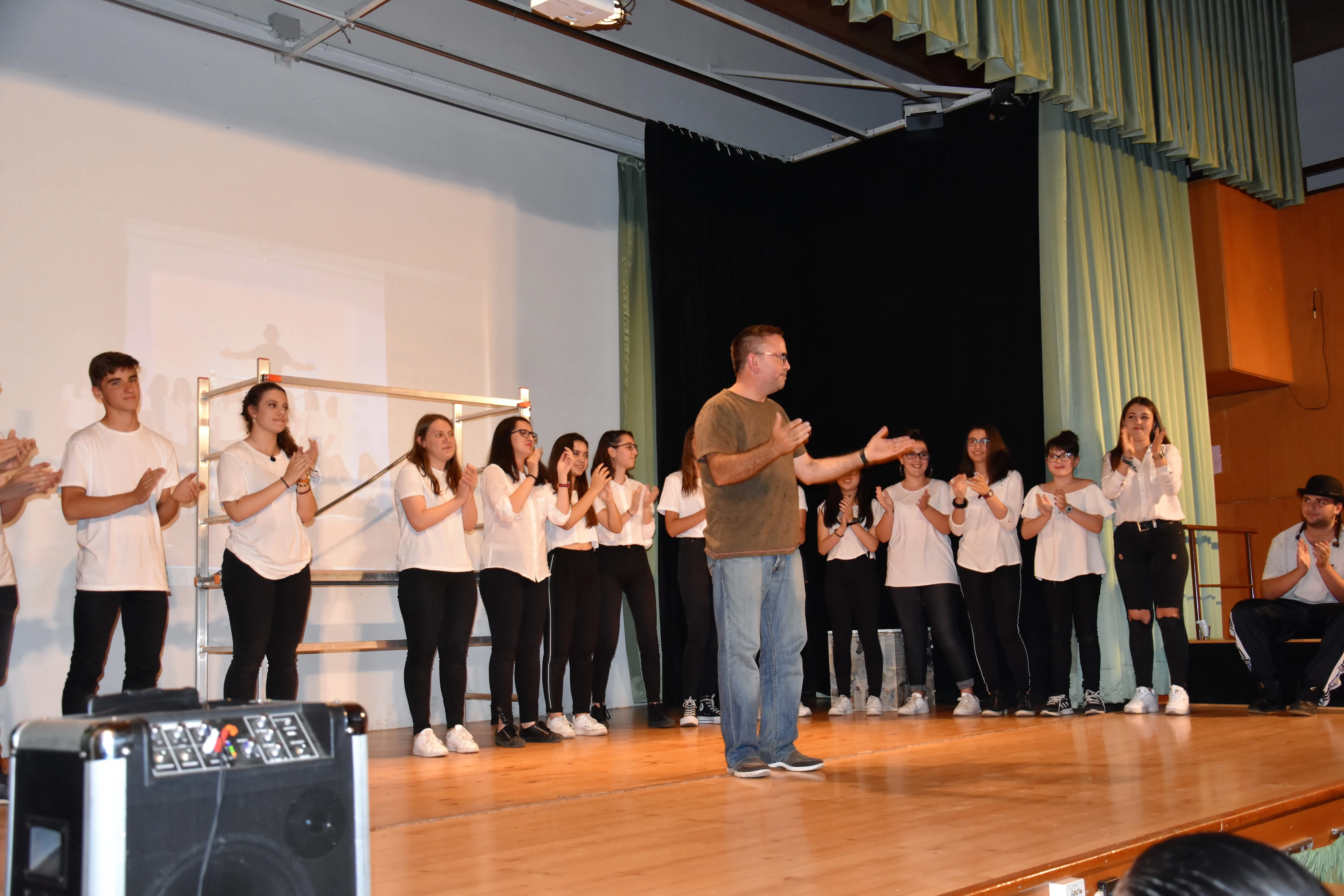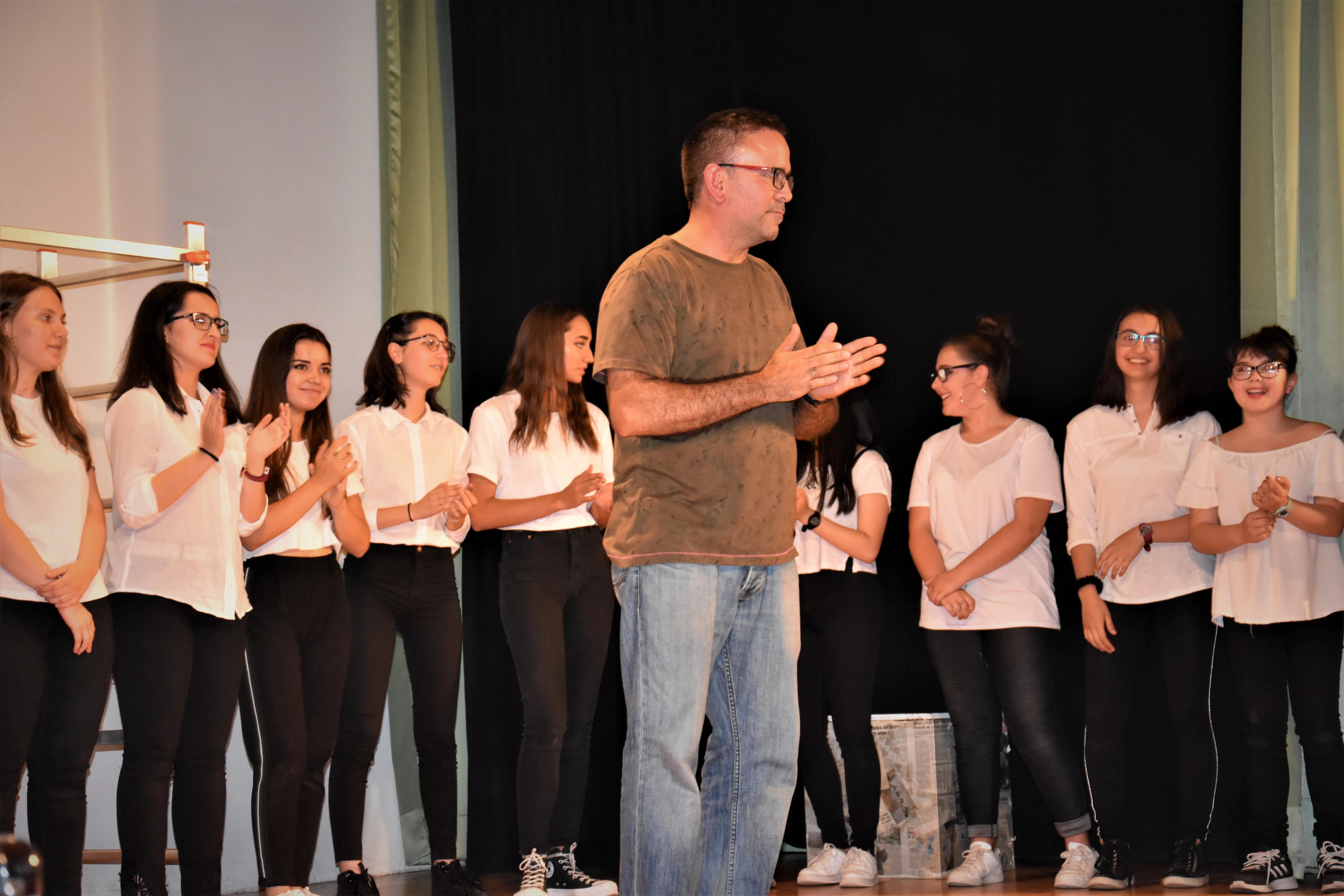 Ante un salón de actos absolutamente lleno y en medio de esa expectación propia del comienzo de vacaciones, los veinte integrantes del grupo de teatro nos hicieron reír, llorar y reflexionar a lo largo de secuencias muy bien llevadas para mostrarnos, en ocasiones de una forma muy cruda, la realidad de los asesinatos machistas, la verdad sobre el maltrato familiar, las situaciones de poder en las parejas jóvenes, la necesidad de reivindicar uno nuevo modelo de mujer joven, independiente y libre y un alegato emocionantísimo y doloroso sobre la prostitución que nos sorprendió por su dolorosa cercanía. Un montaje escénico sobrio en los decorados, pleno de recursos musicales, visuales y sobre todo, representado desde la entrega más absoluta, lo que valió el aplauso, la emoción y hasta la comprensión del público cuando en ocasiones fallaba un poquito la memoria?