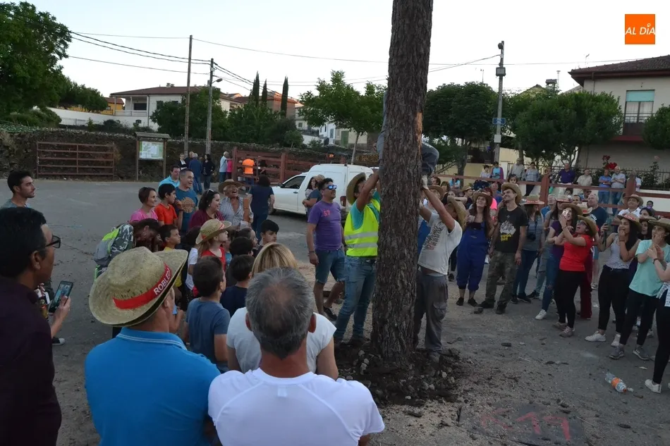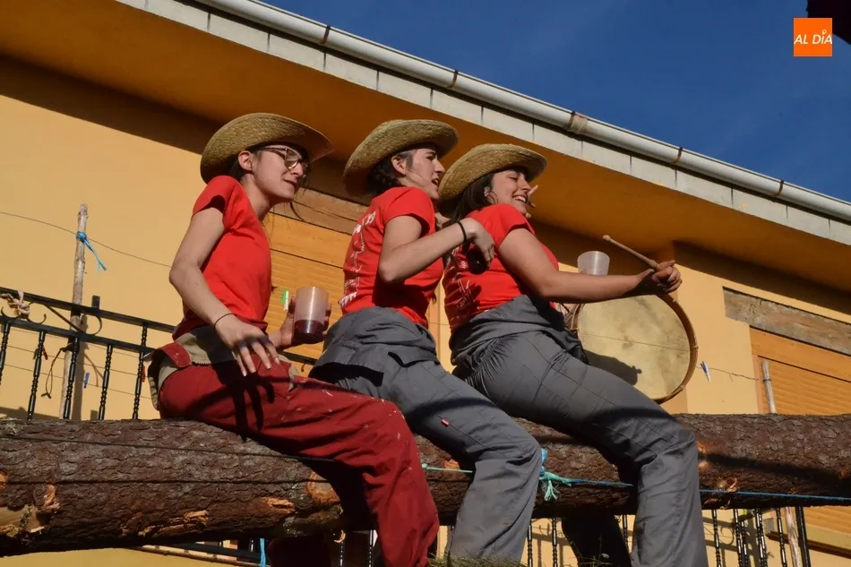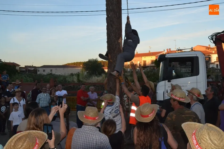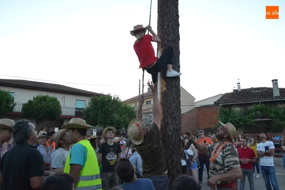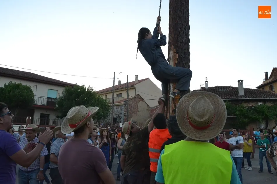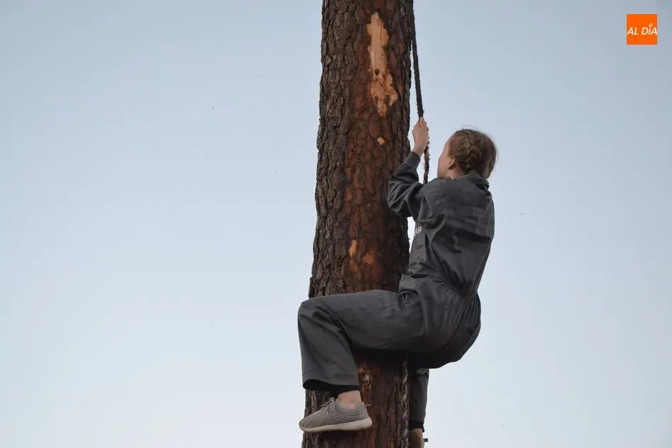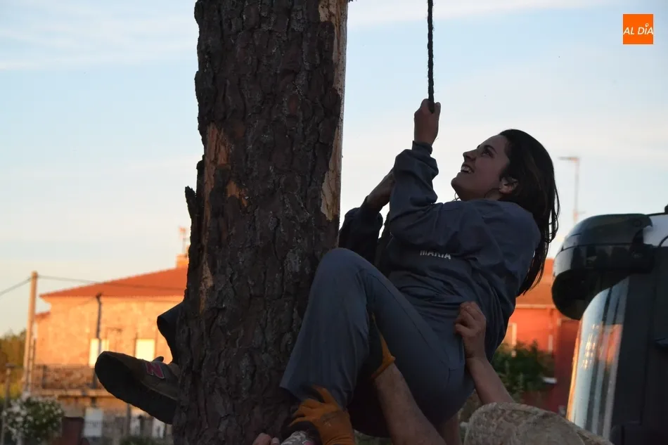Finalizada esa operación, llegó el momento de ?disfrutar? del pino, probando a subir por el mismo. En principio, sólo ?debían hacerlo? las Quintas, pero tras probar ellas, se animaron otras chicas y niños a quienes en el futuro les tocará también ser Quintos de las fiestas de Robleda.