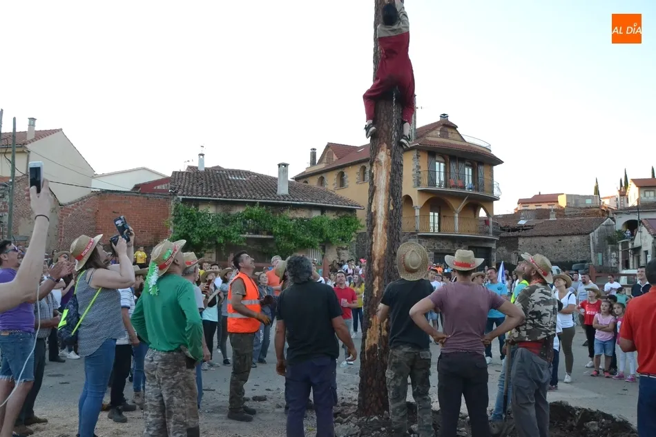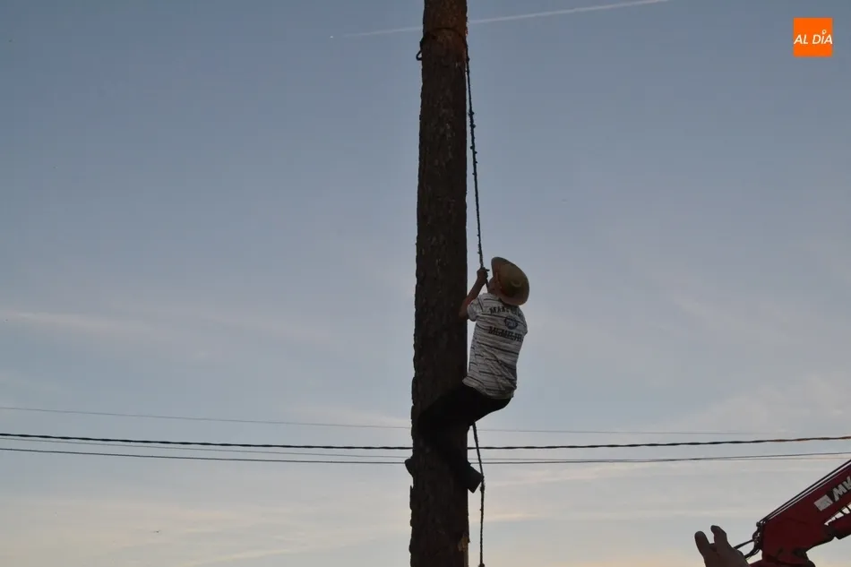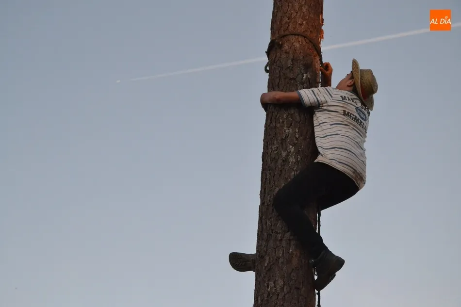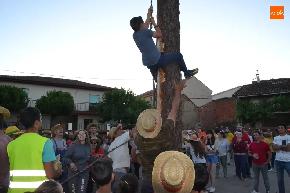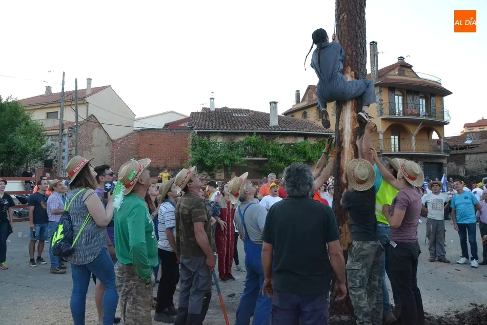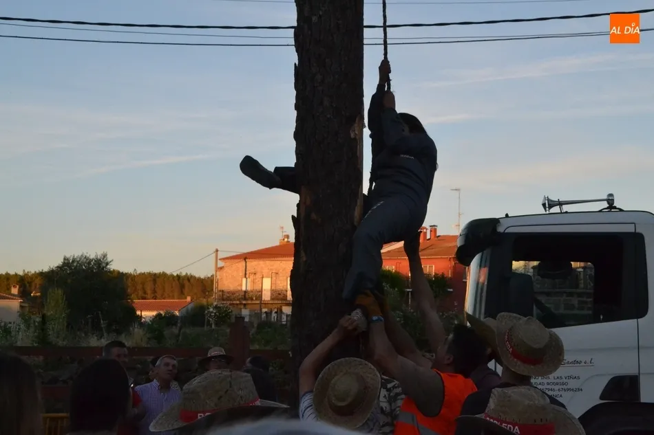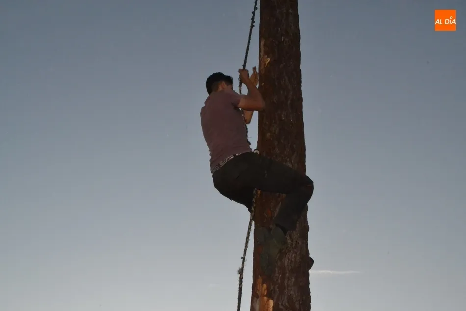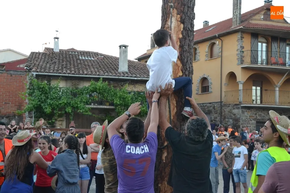 Finalizada esa operación, llegó el momento de ?disfrutar? del pino, probando a subir por el mismo. En principio, sólo ?debían hacerlo? las Quintas, pero tras probar ellas, se animaron otras chicas y niños a quienes en el futuro les tocará también ser Quintos de las fiestas de Robleda.