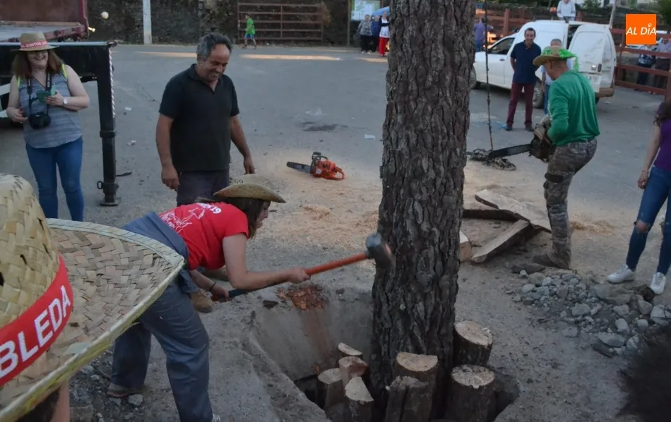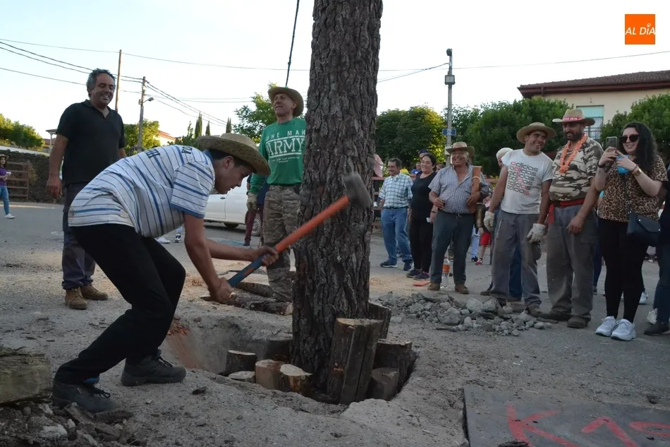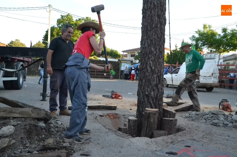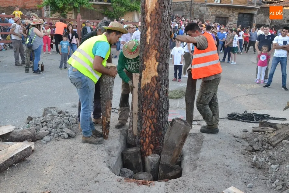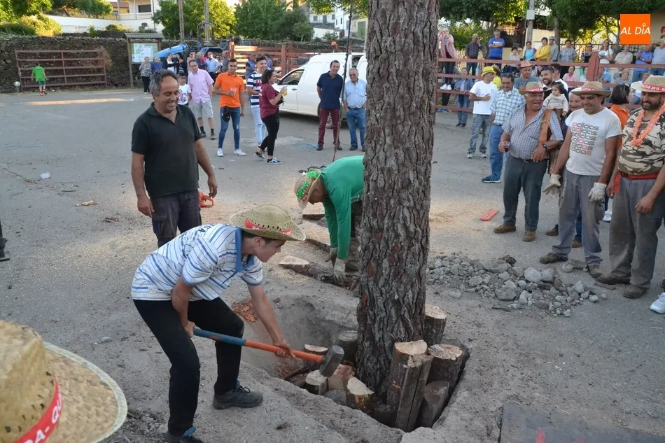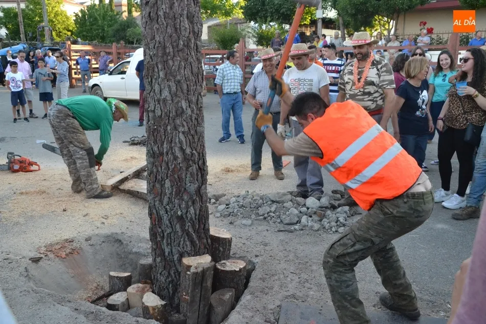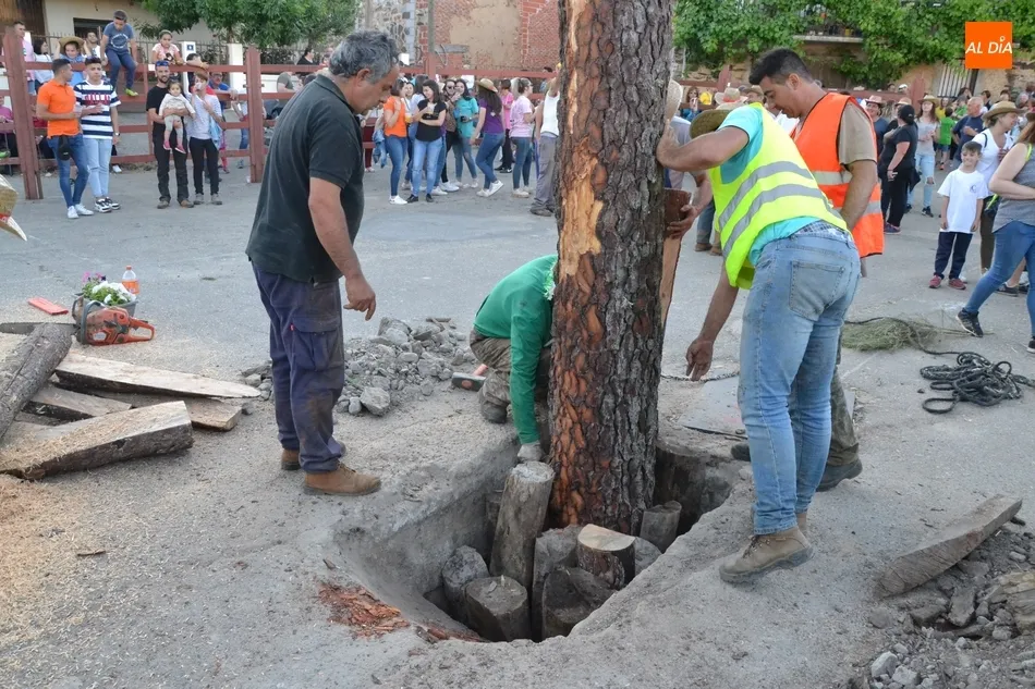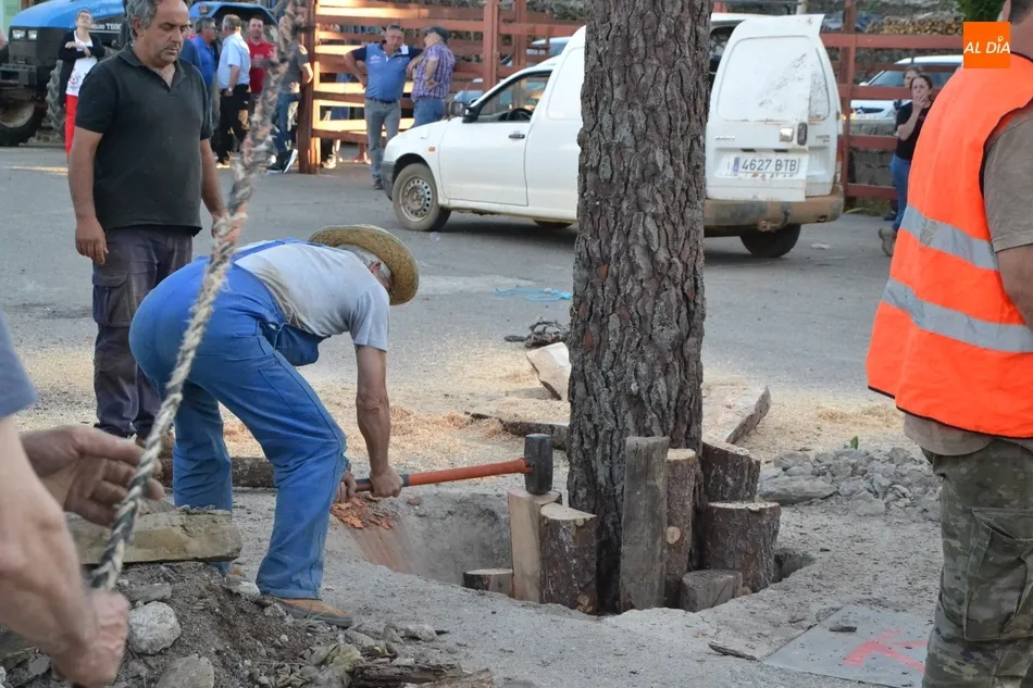 Llegados a la mencionada Plaza del Caño, fue laboriosa tanto la tarea de desatar el pino del camión donde viajaba como de plantarlo en el tradicional hueco que se conserva de un año para otro. Una vez ya con la posición vertical, varias personas estuvieron introduciendo cuñas de madera de diversos tamaños en el pozo para darle sujeción al árbol.