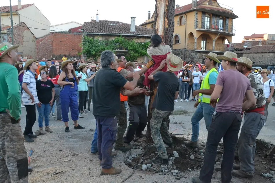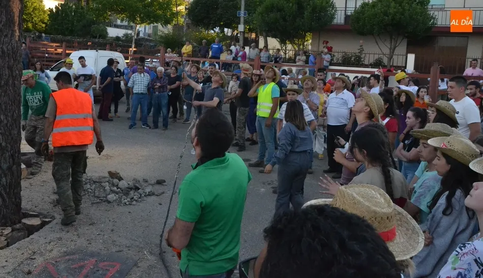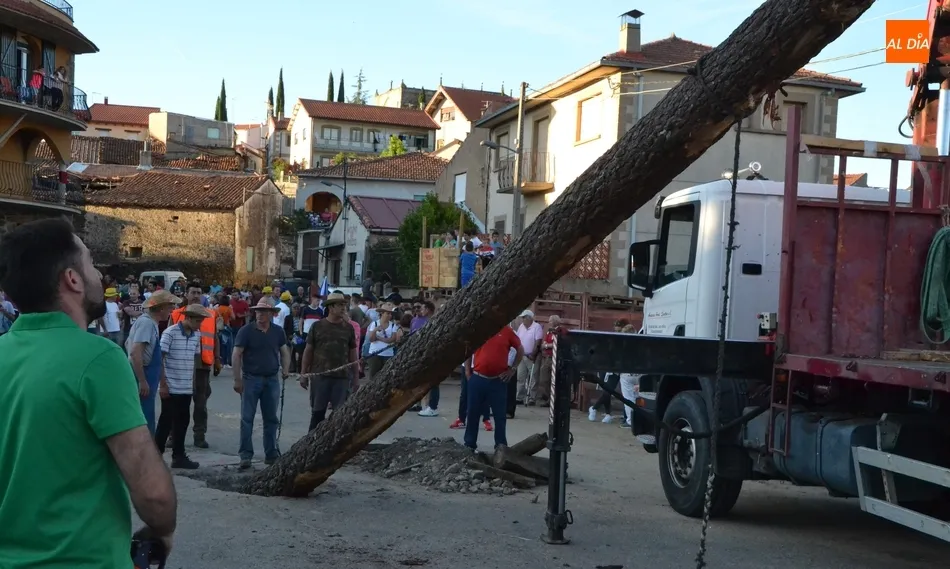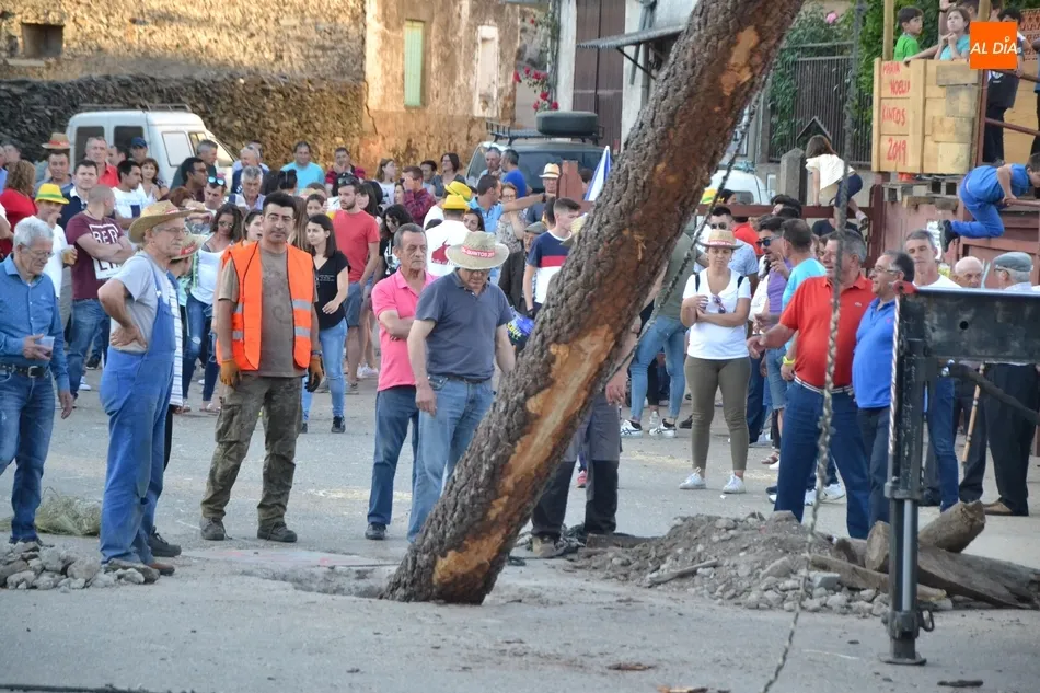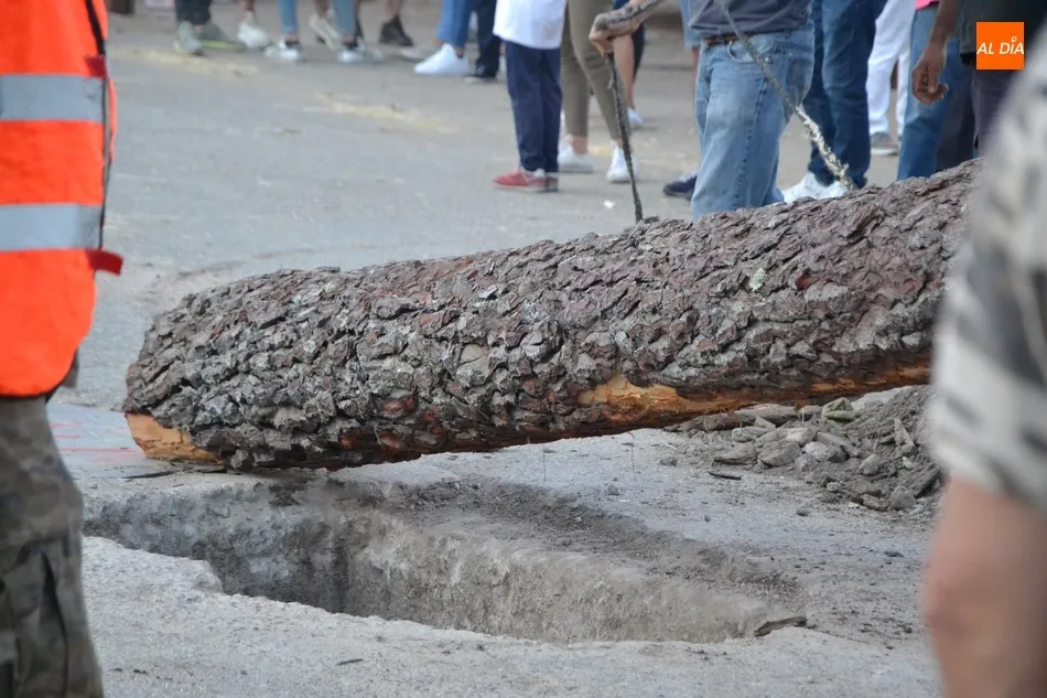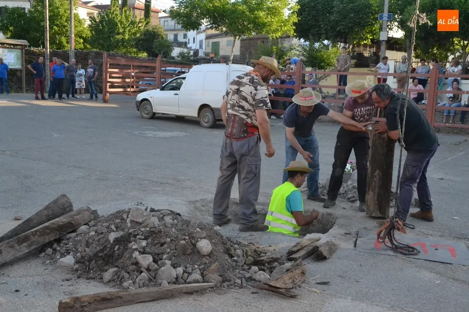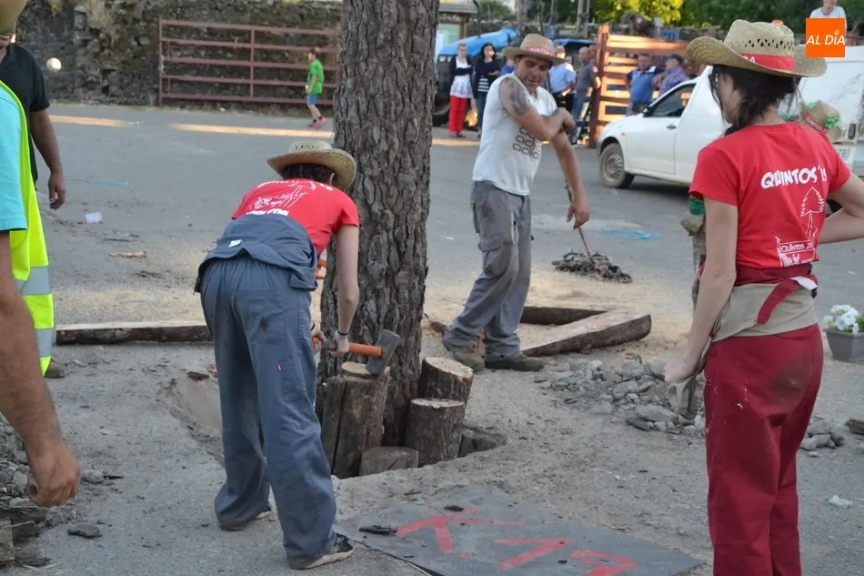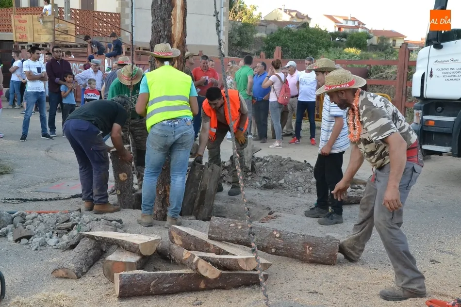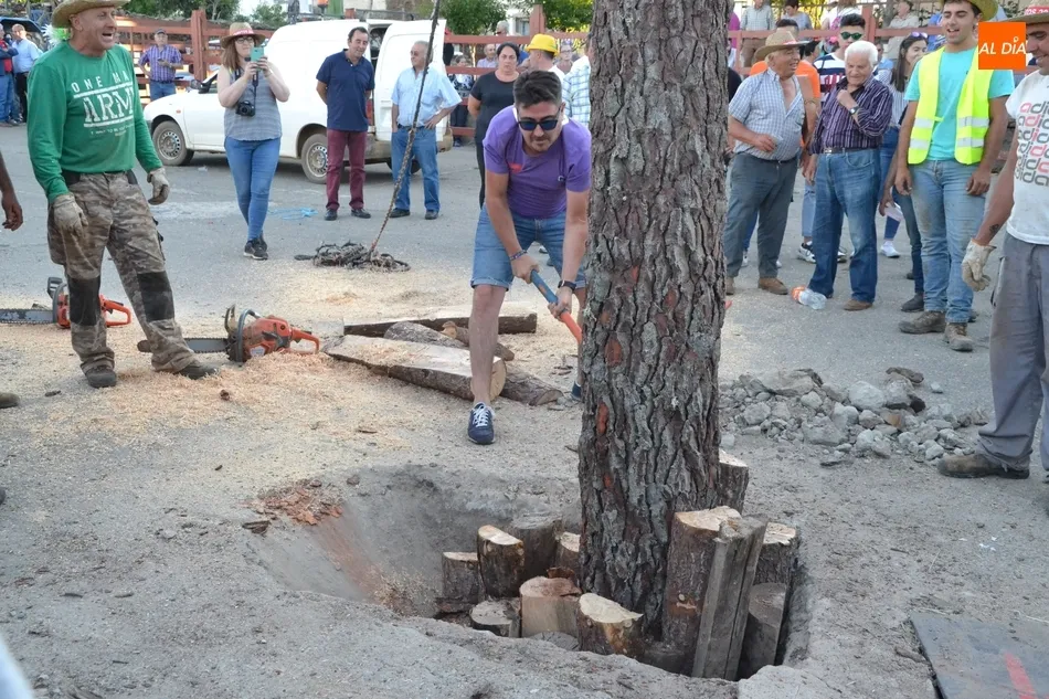 Llegados a la mencionada Plaza del Caño, fue laboriosa tanto la tarea de desatar el pino del camión donde viajaba como de plantarlo en el tradicional hueco que se conserva de un año para otro. Una vez ya con la posición vertical, varias personas estuvieron introduciendo cuñas de madera de diversos tamaños en el pozo para darle sujeción al árbol.