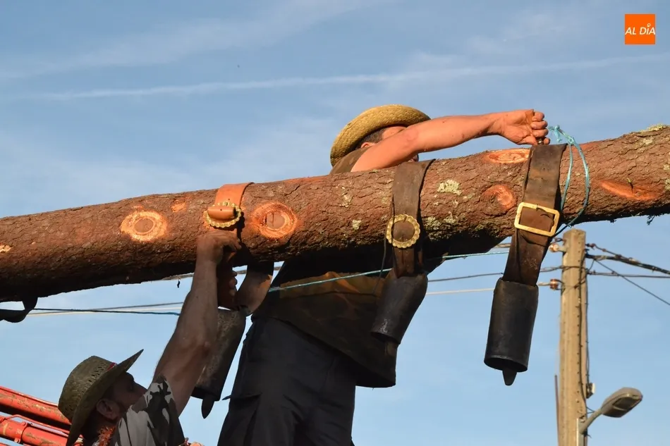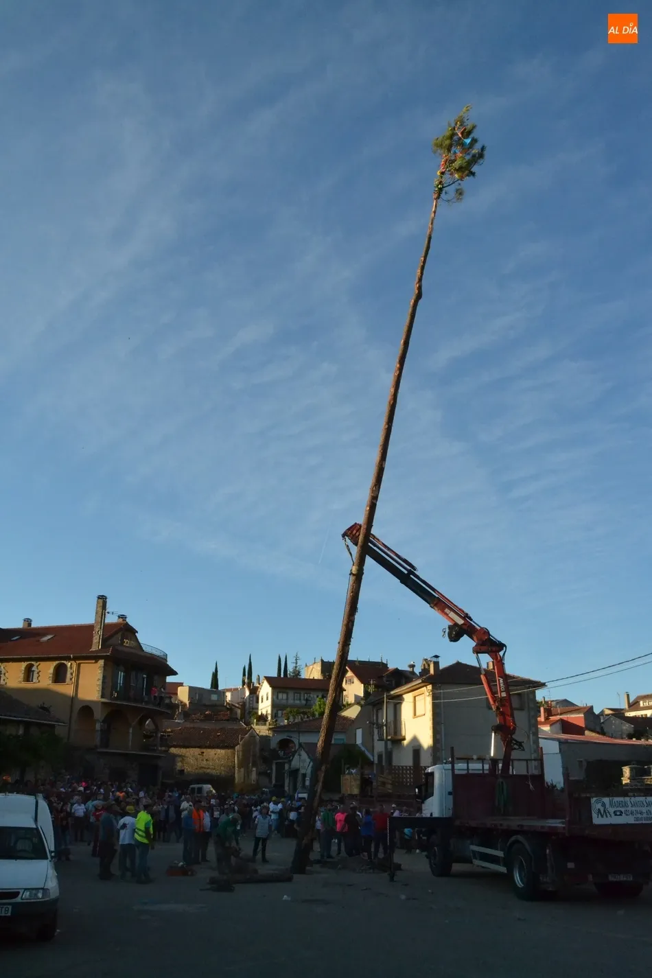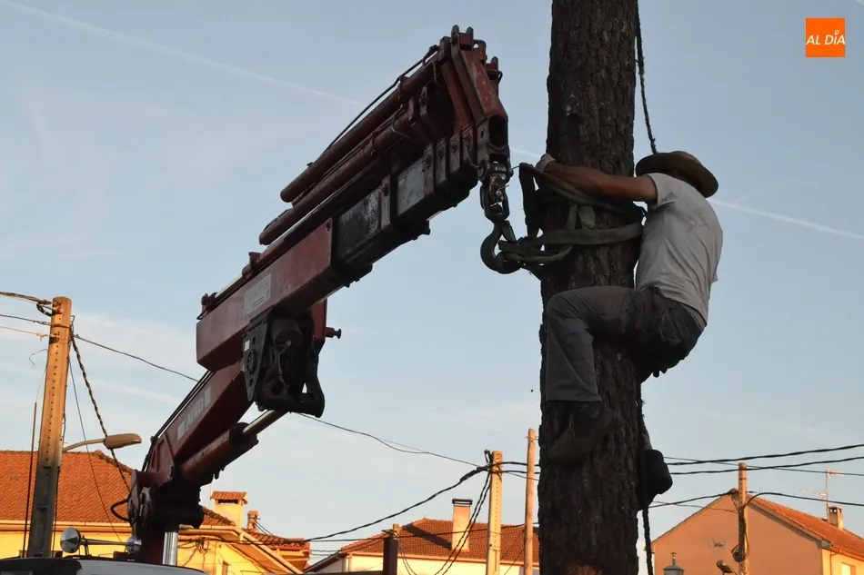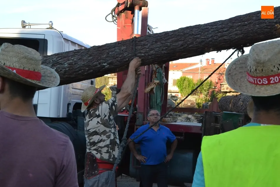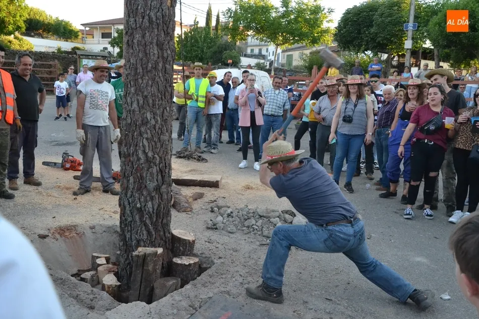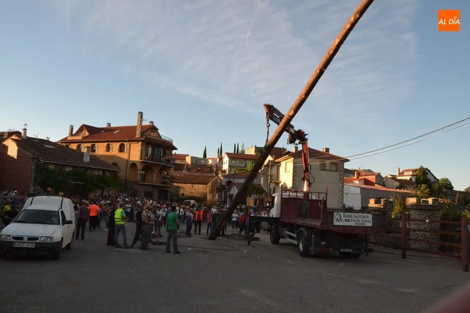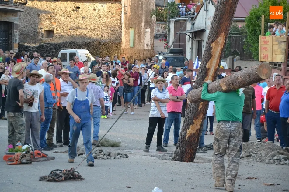 Llegados a la mencionada Plaza del Caño, fue laboriosa tanto la tarea de desatar el pino del camión donde viajaba como de plantarlo en el tradicional hueco que se conserva de un año para otro. Una vez ya con la posición vertical, varias personas estuvieron introduciendo cuñas de madera de diversos tamaños en el pozo para darle sujeción al árbol.