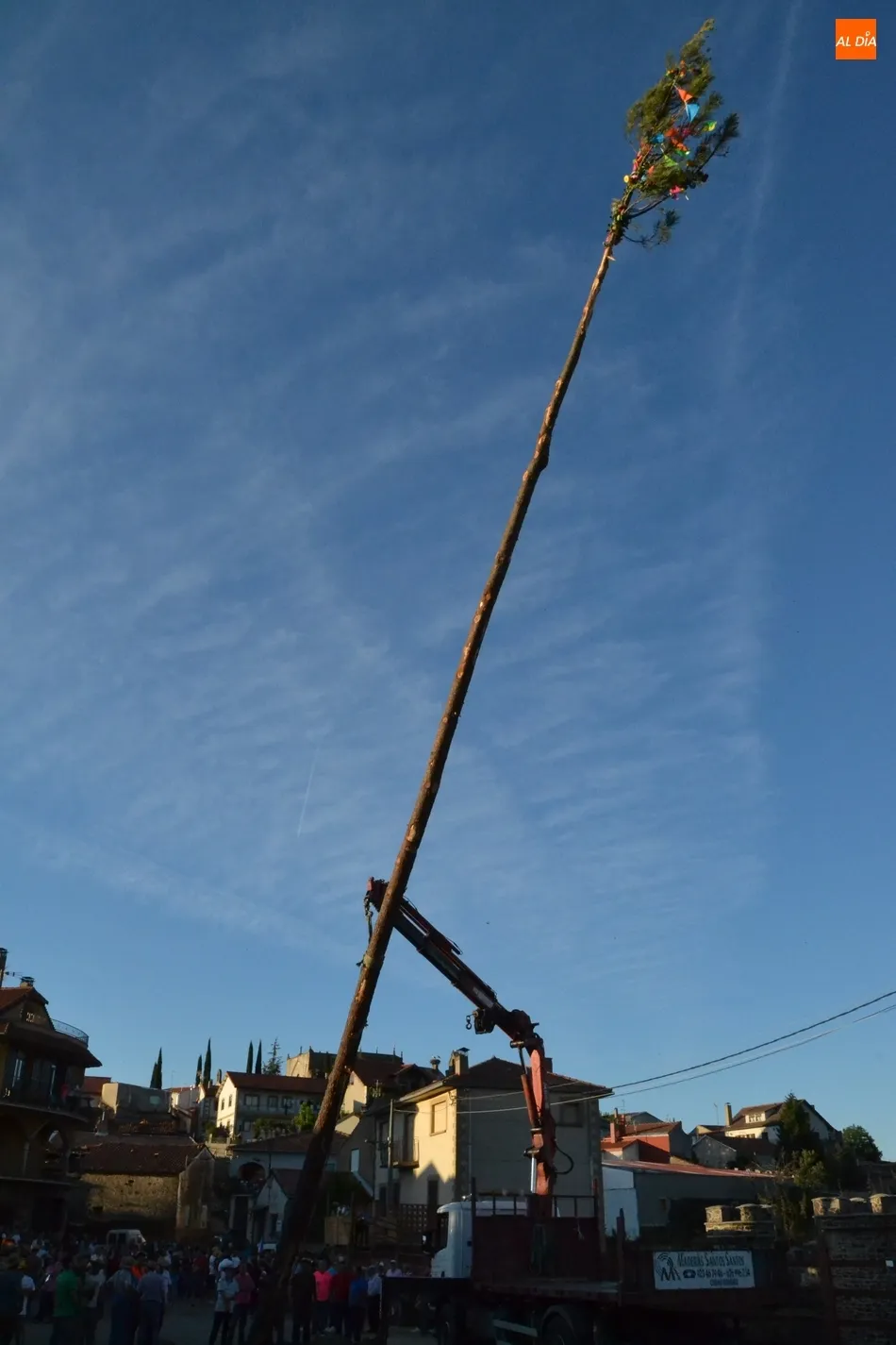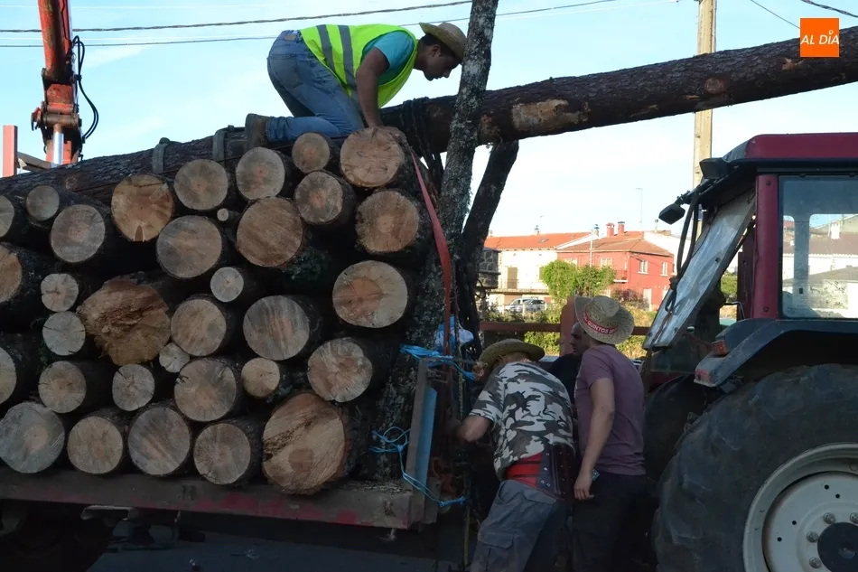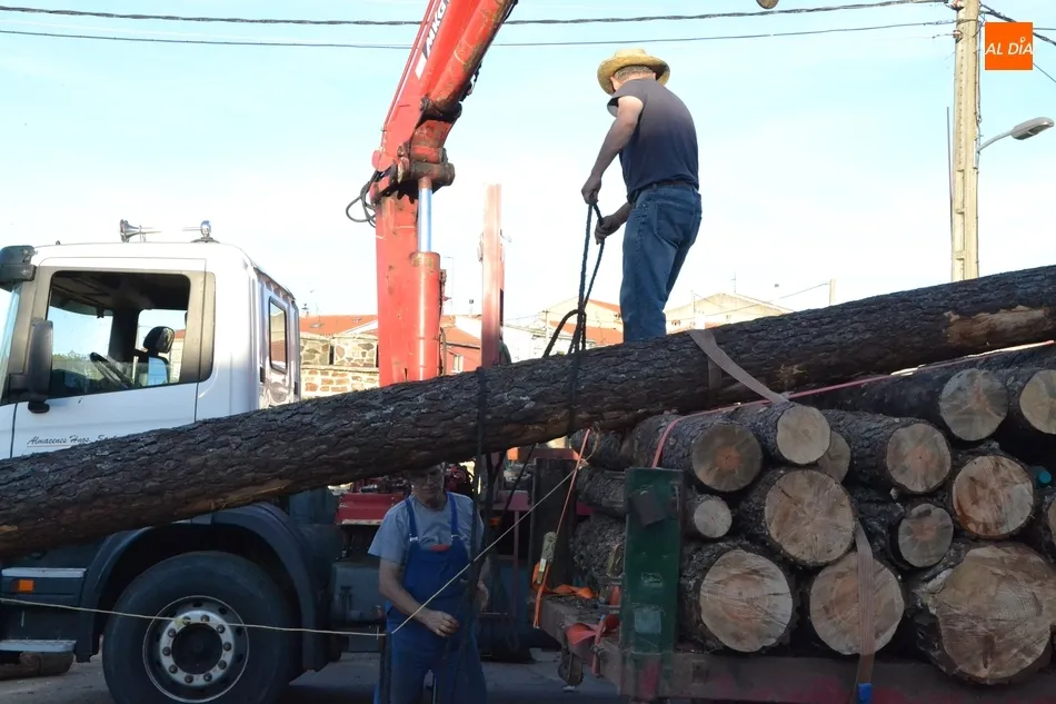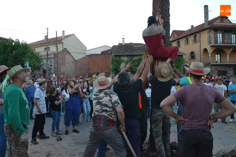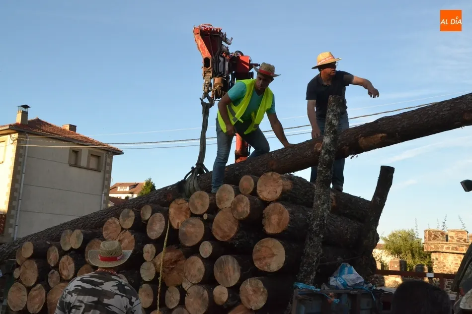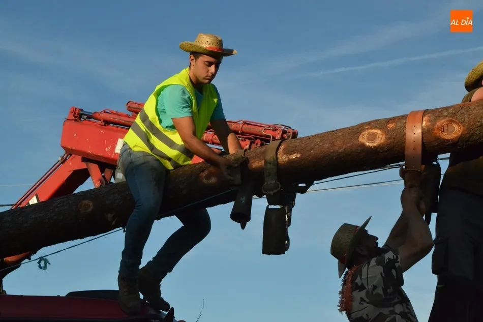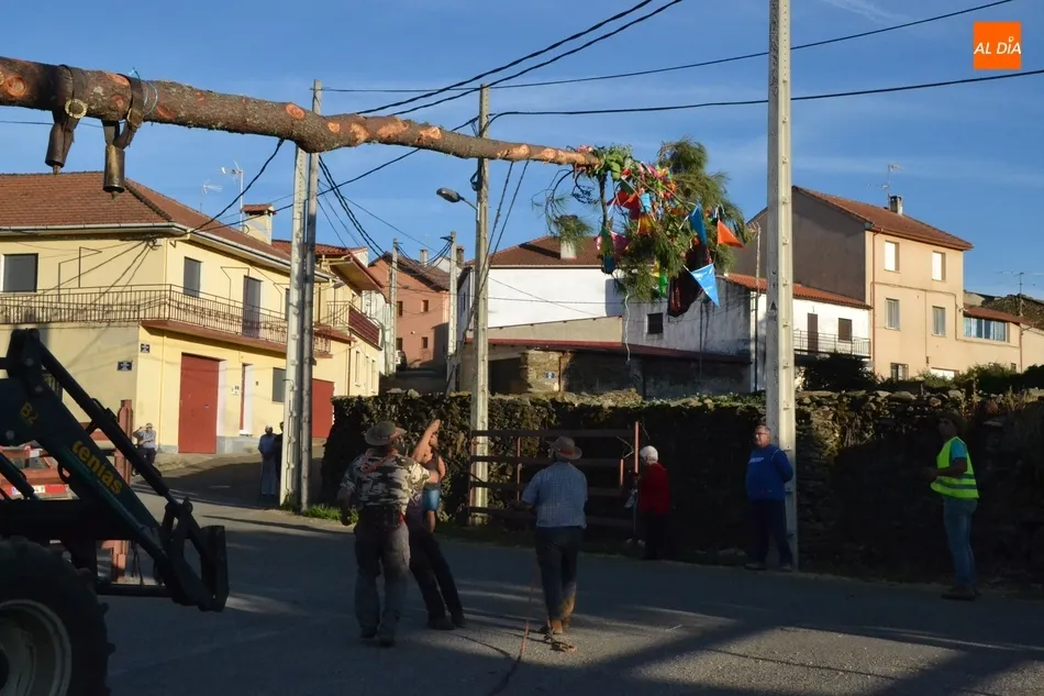 Llegados a la mencionada Plaza del Caño, fue laboriosa tanto la tarea de desatar el pino del camión donde viajaba como de plantarlo en el tradicional hueco que se conserva de un año para otro. Una vez ya con la posición vertical, varias personas estuvieron introduciendo cuñas de madera de diversos tamaños en el pozo para darle sujeción al árbol.