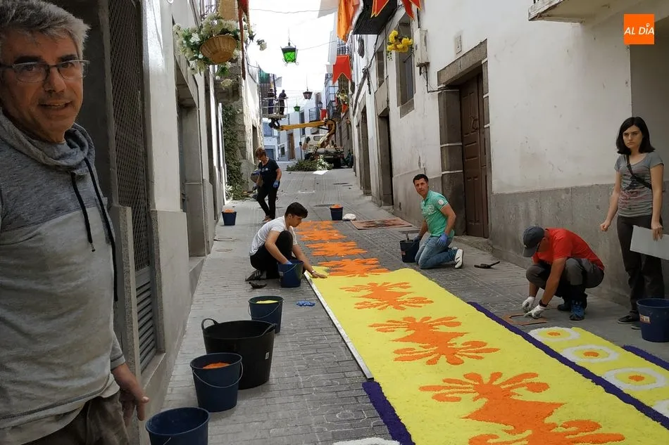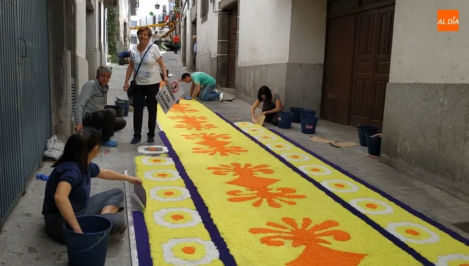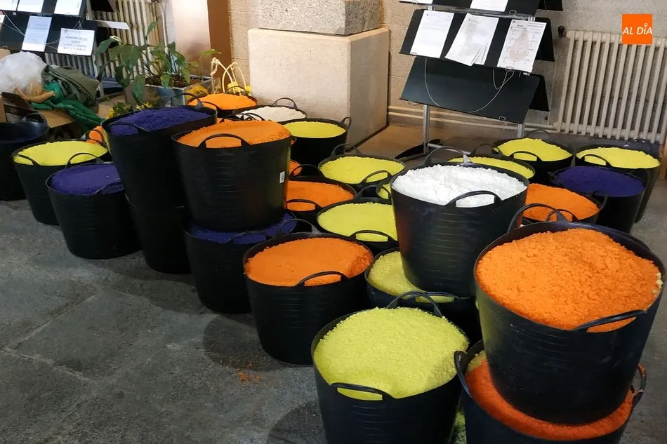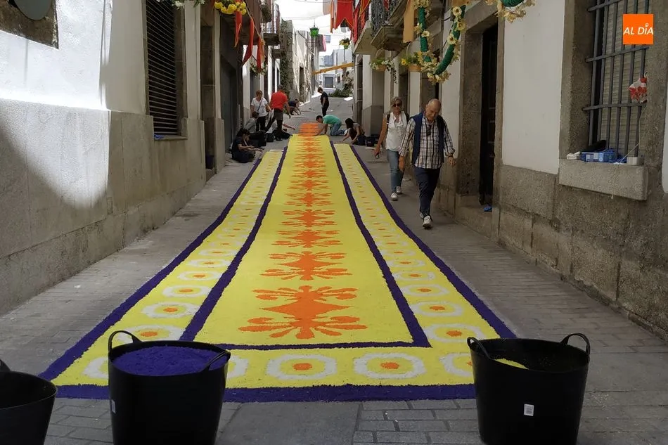 Las alfombras se confeccionan con sal comprada en Ledrada y teñida con pigmentos vegetales, fáciles de limpiar con agua cuando pase el Corpus. Una de ellas se elabora en la calle Las Armas, con 2.500 kg. de sal para los 99 metros de longitud por 2,5 de ancho. La otra se hace en la calle Olleros, con unos 500 kg. de sal y 50 metros de largo.