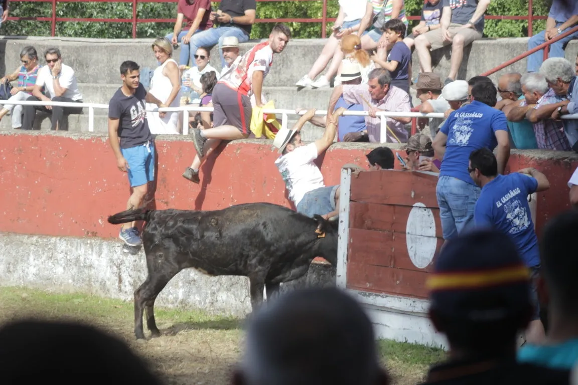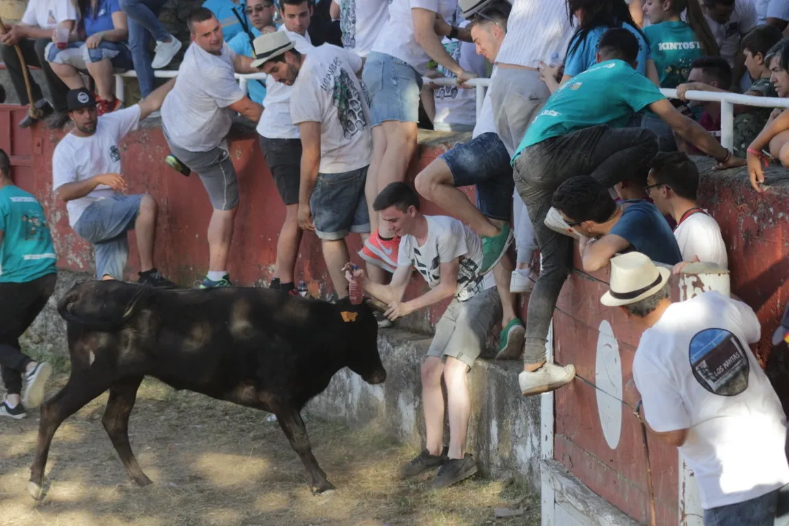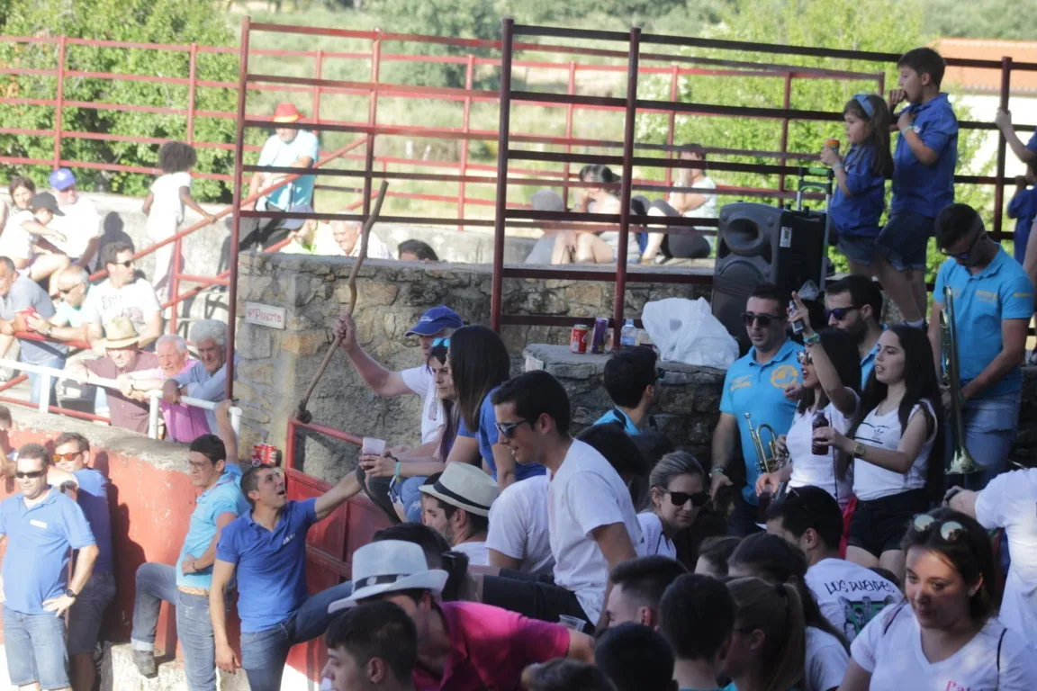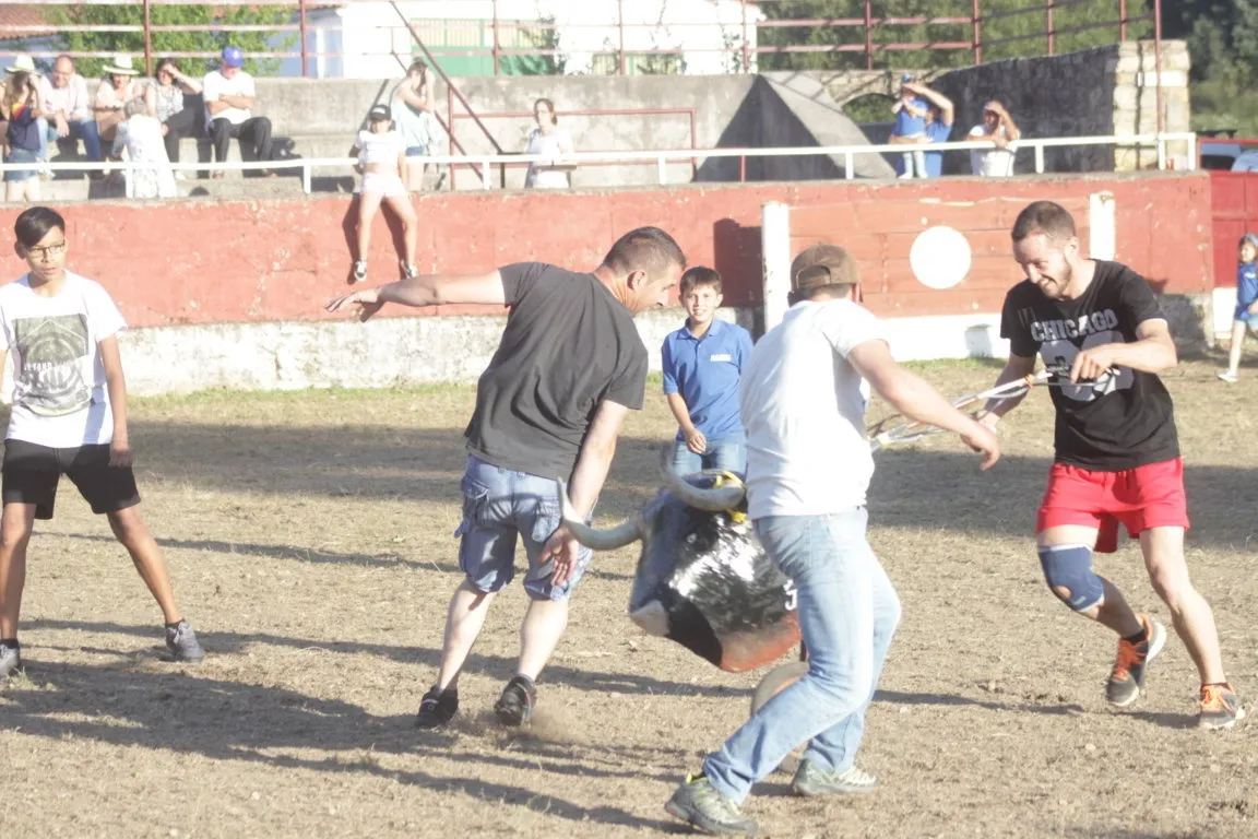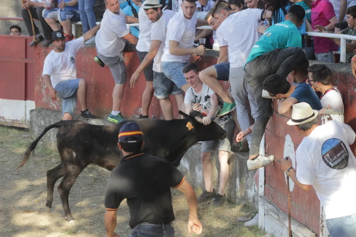 La tarde de sábado de las fiestas de San Juan en Navasfrías incluyó una nueva cita taurina, en este caso una capea de vaquillas en la plaza fija de la localidad, que contó con la animación musical de la charanga Los Despistados. La capea estuvo de lo más animada, viéndose una amplísima colección tanto de momentos ?buenos? como ?malos?. En el primero de los capítulos, los mozos ?y algunos ya no tan mozos- que estuvieron en el coso probaron todo tipo de recortes, quiebros y saltos, viéndose varios de una bella factura.
