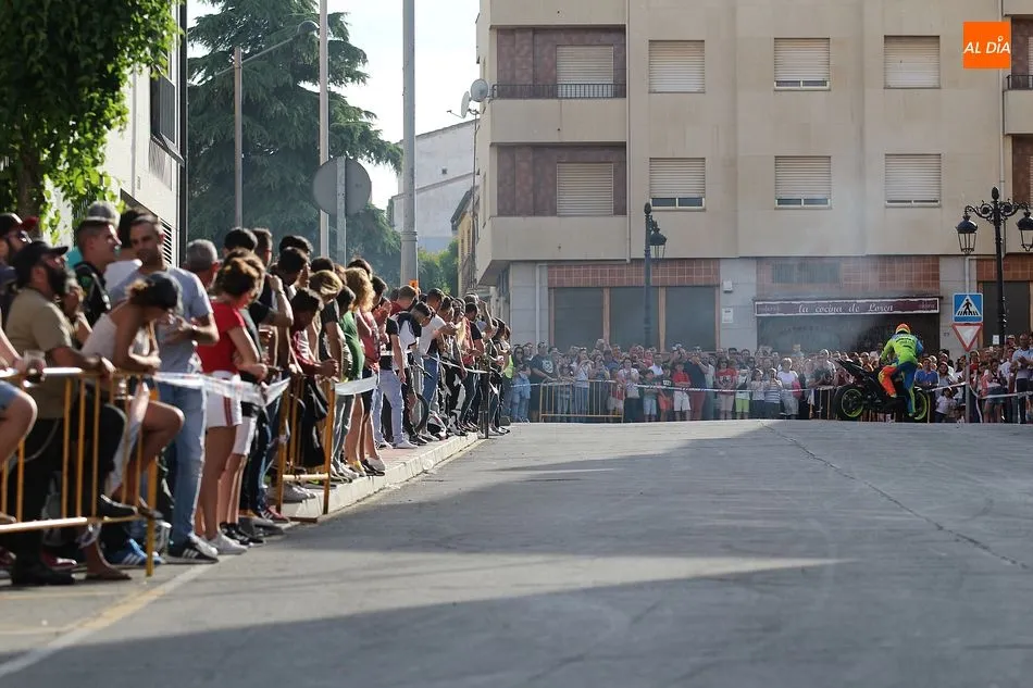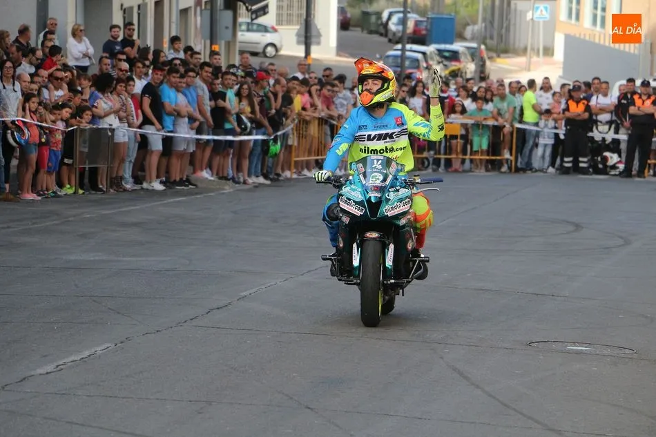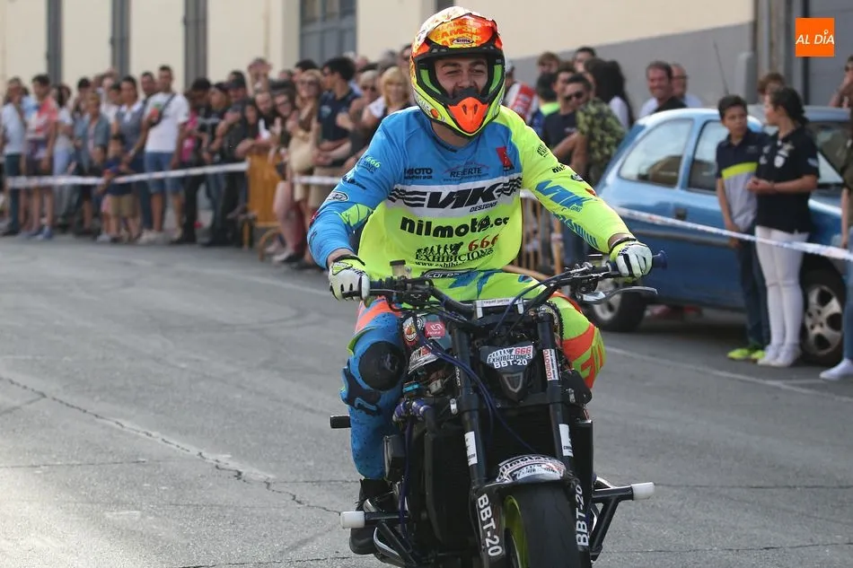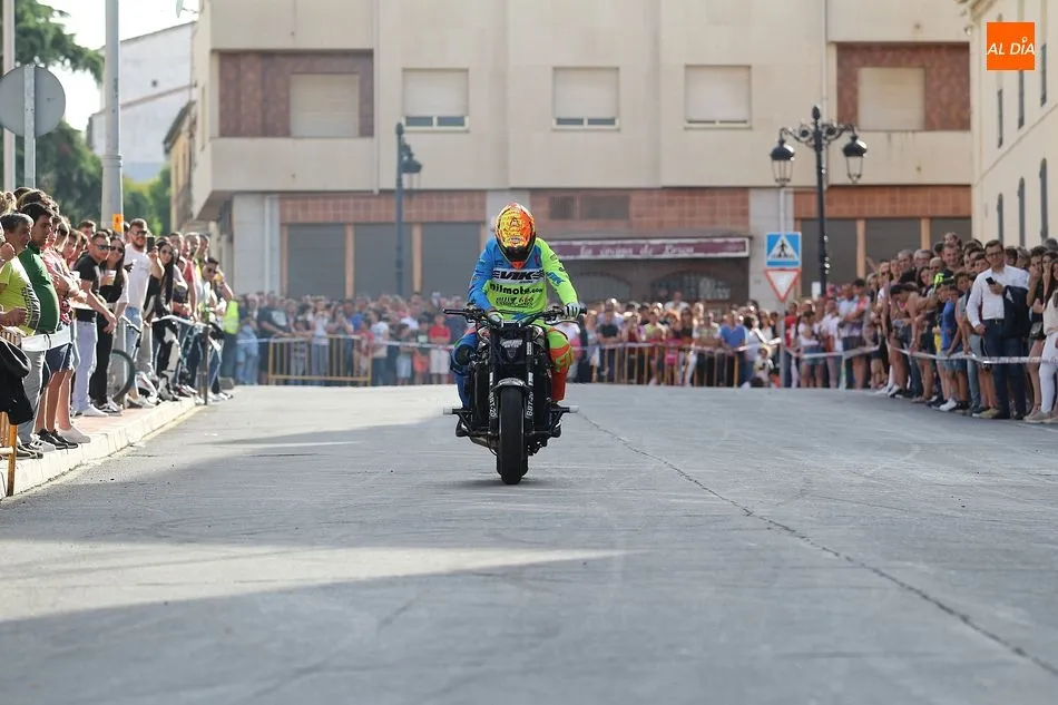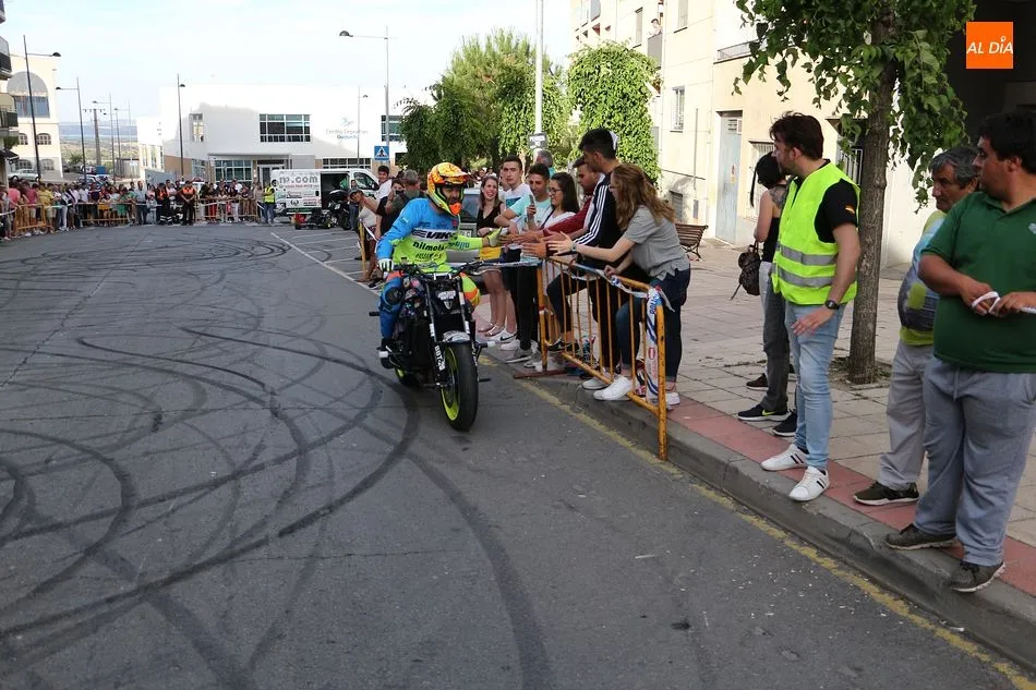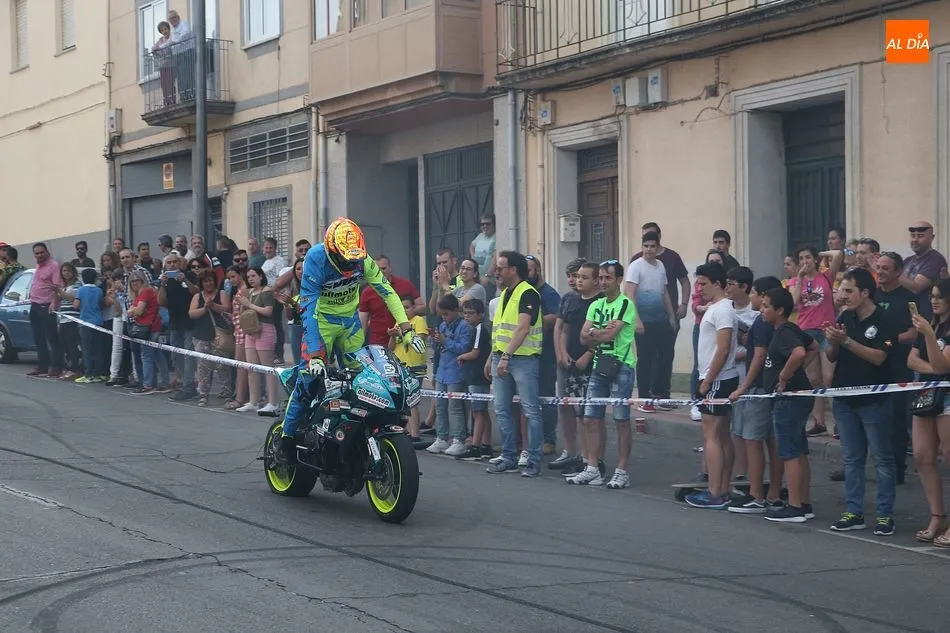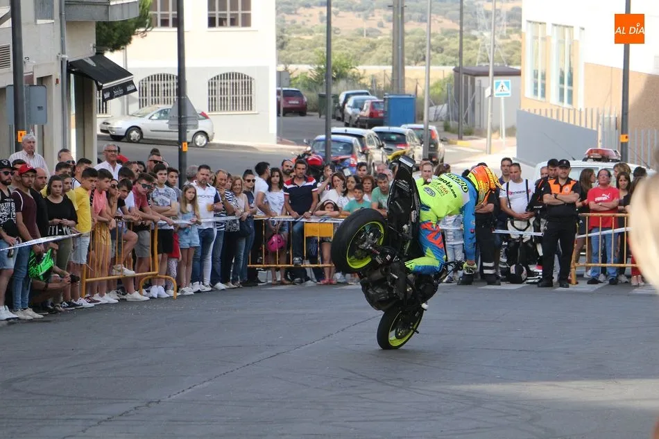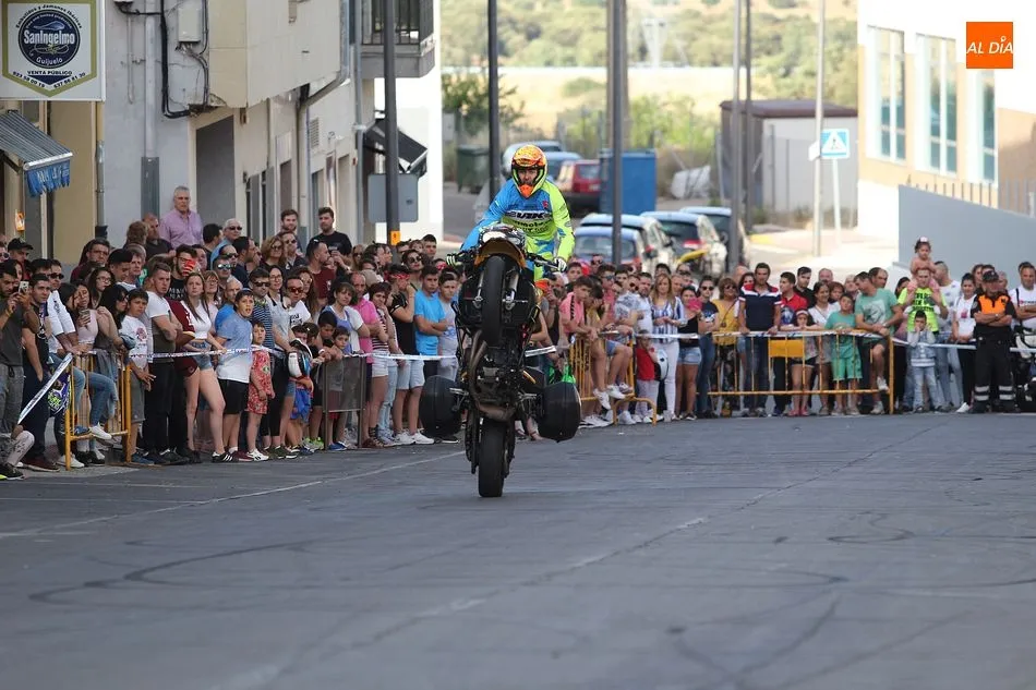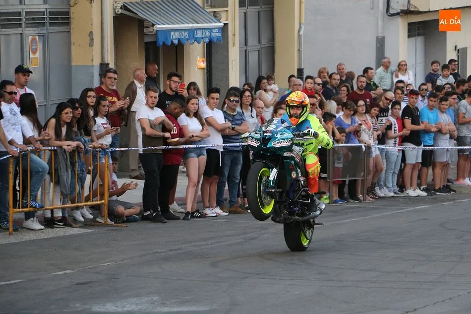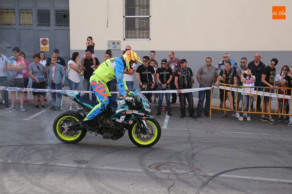 Cientos de aficionados a las motos se dieron cita en la calle Guardia Civil para ver la exhibición del acróbata