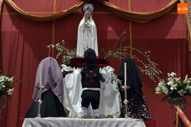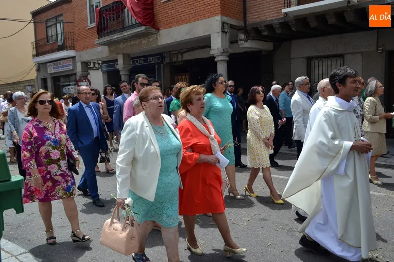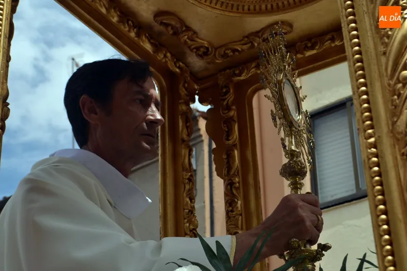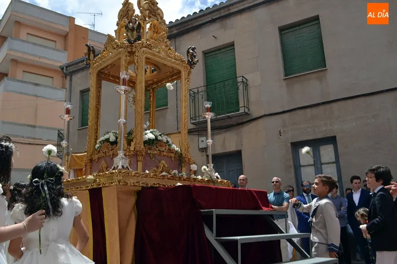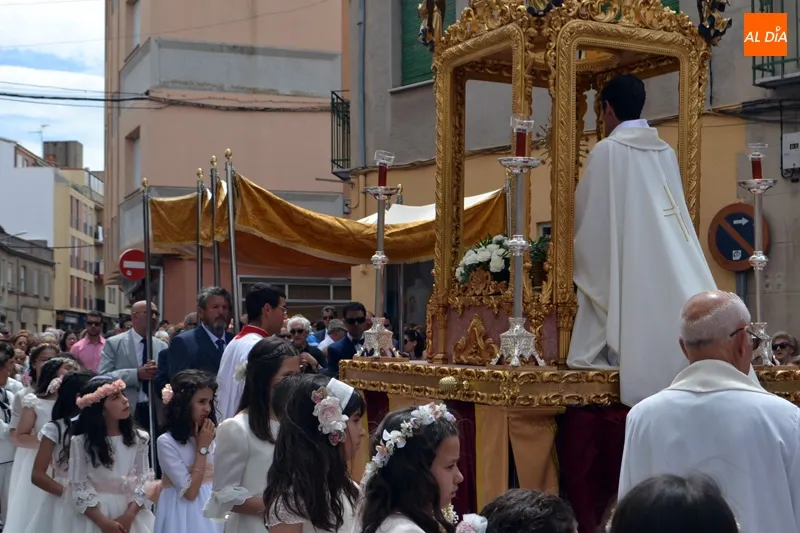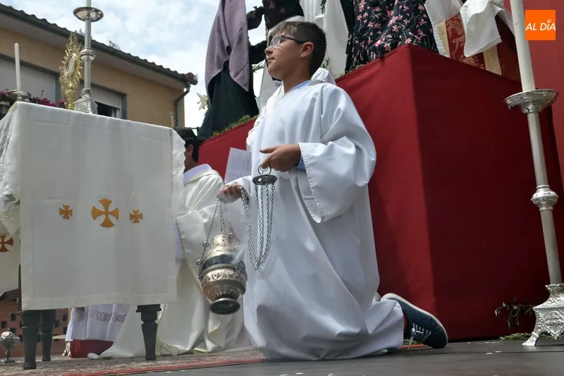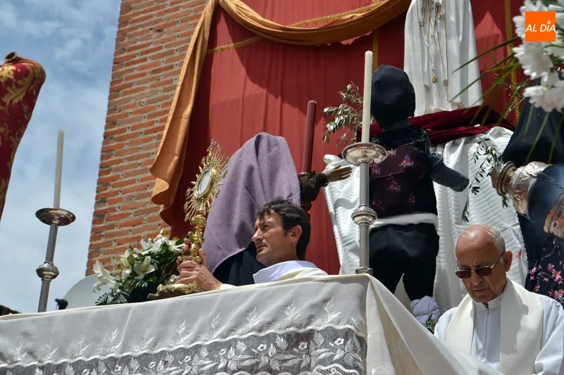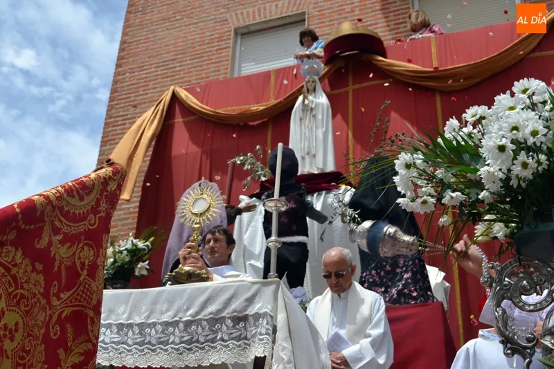 Ya en la conocida ?Puerta del Sol? tenía lugar el momento más destacado de la celebración, donde se encontraba instalado el altar principal sobre el que el párroco local, Lauren Sevillano, oficiaba el acto más solemne del desfile, instantes en los que no faltaron ni la lluvia de pétalos ni el ofrecimiento a la Sagrada Forma de los claveles blancos que portaban los niños.