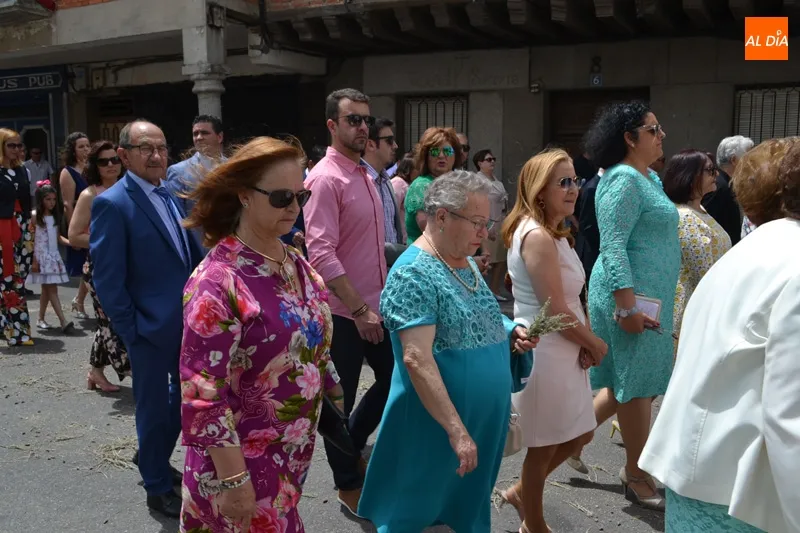 iglesia parroquial San Miguel Arcángel la comitiva con la Sagrada Forma portada a hombros como manda la tradición, arropada por los niños recién comulgados, y una nutrida representación de la nueva Corporación municipal, además de responsables de las diferentes cofradías peñ